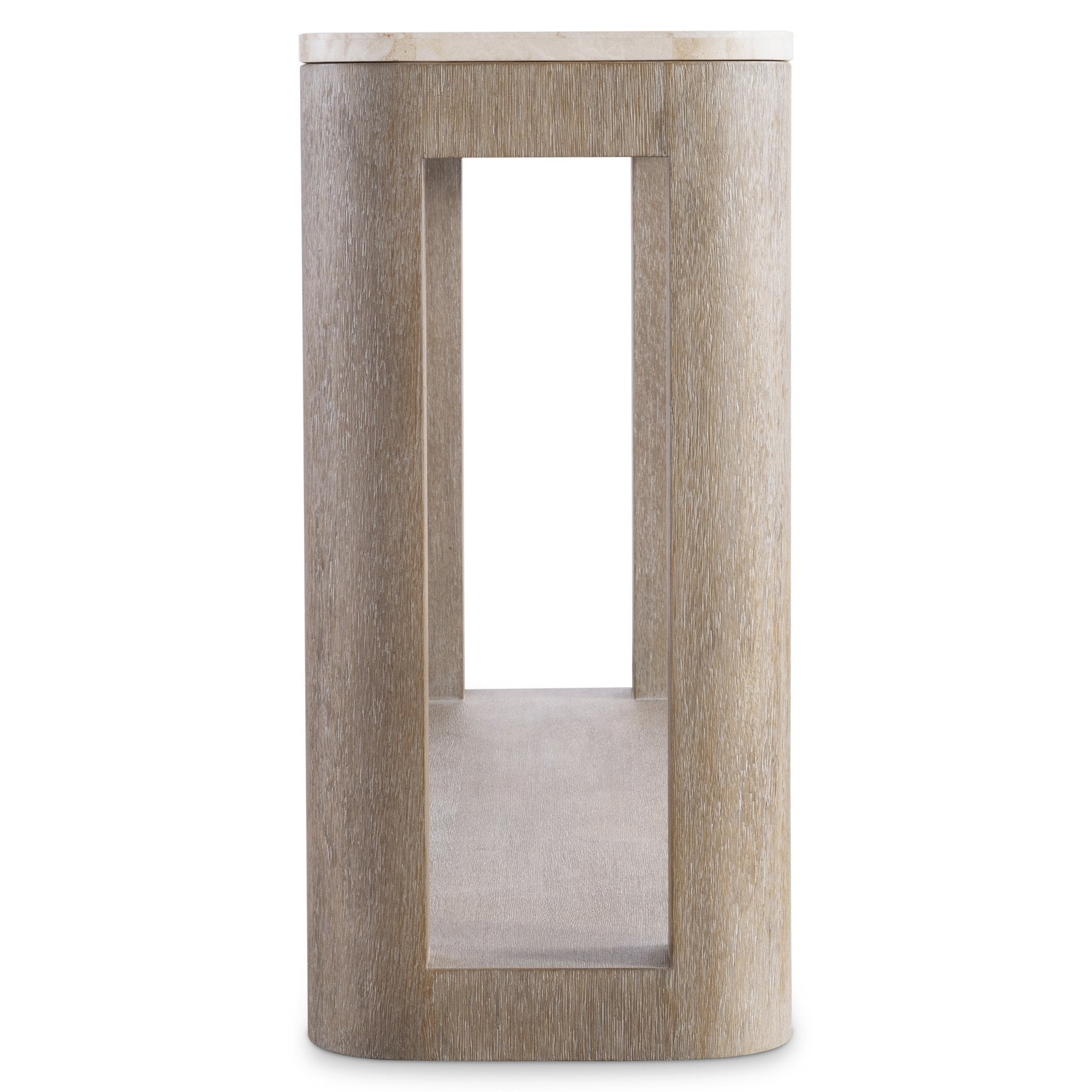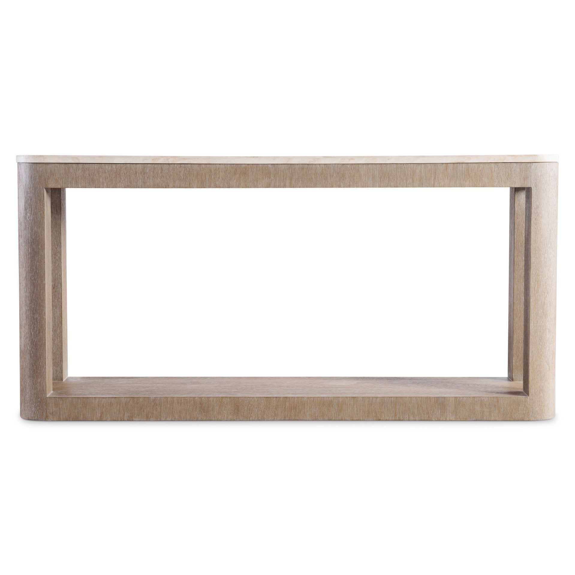 Elevate your entryway or living space with a modern console that blends sculptural form and refined materials. Clean, curved supports and a warm, wire-brushed wood finish pair with a natural travertine top to create a striking focal point that’s both functional and elegant. Thoughtful details—open base shelving, adjustable glides, and an anti-tip kit—ensure durability and everyday usability.