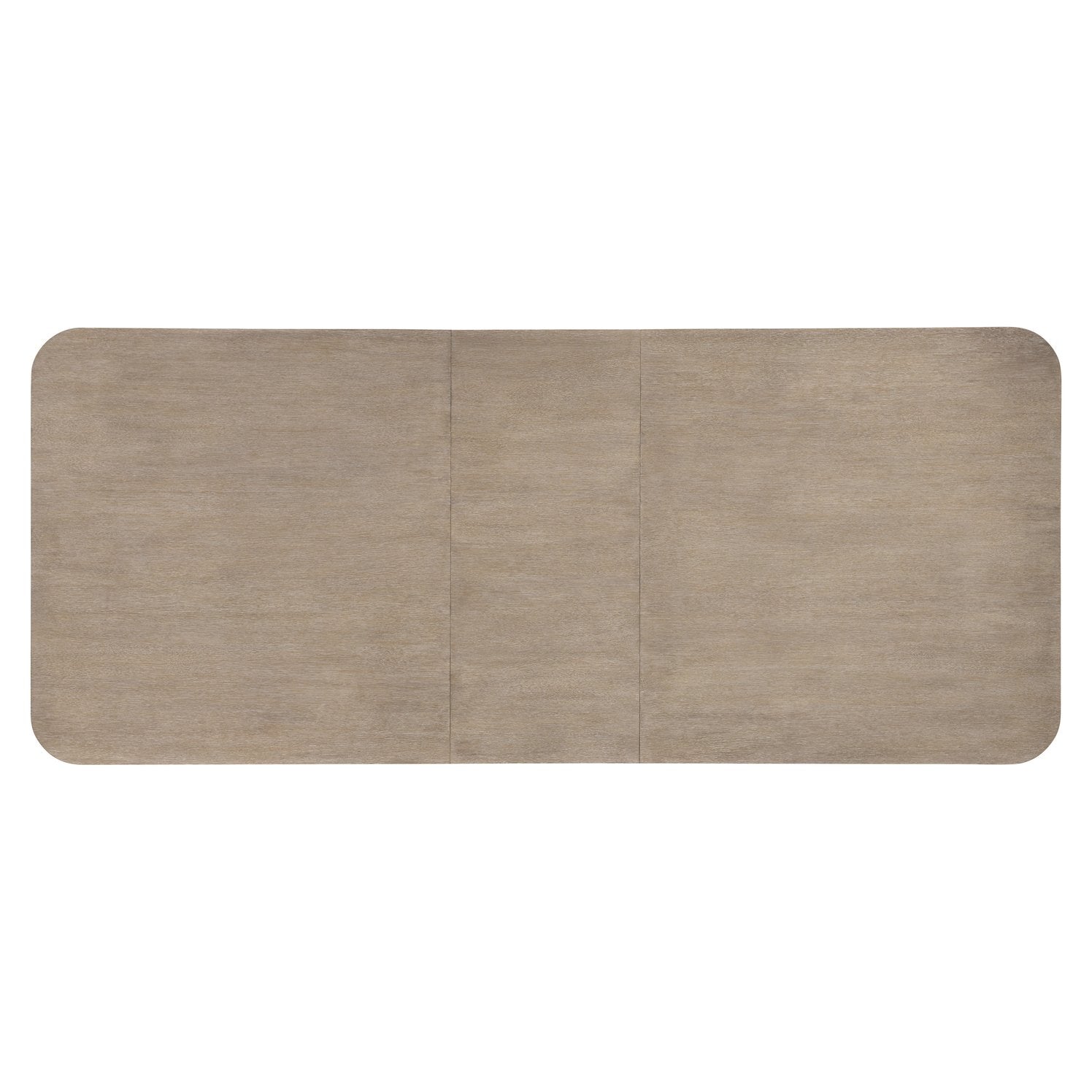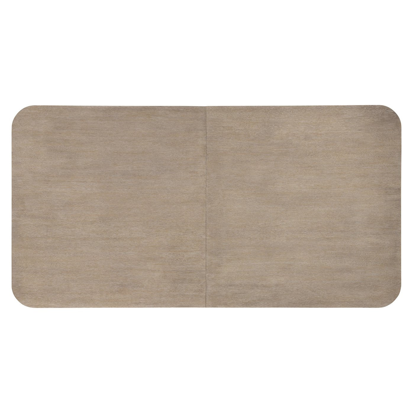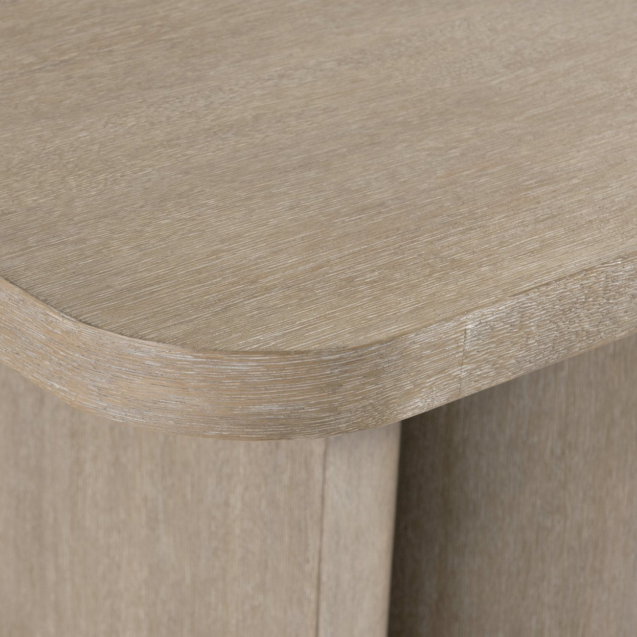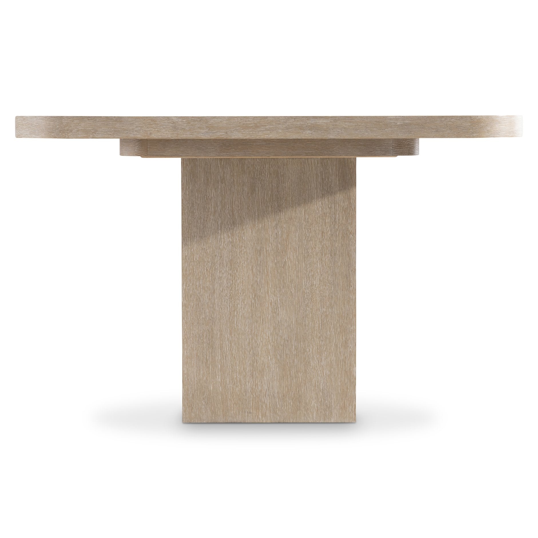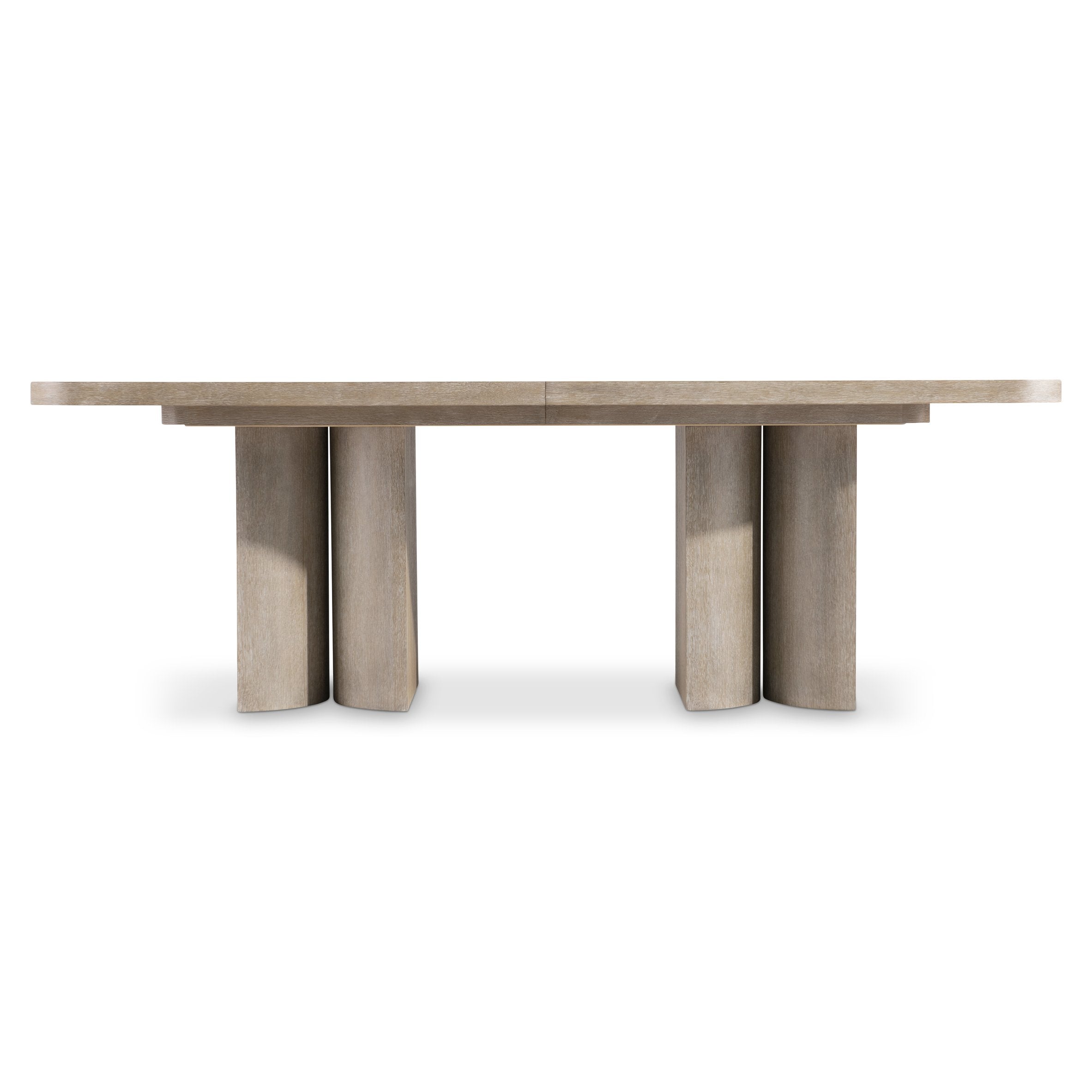 A striking blend of architectural detail and modern form, this dining table pairs sculptural, curved pilaster-style pedestals with a softly rounded rectangular top. The wire-brushed oak surface in the warm Aria finish highlights natural texture and grain while the balanced double-pedestal base creates an open, elegant silhouette suited for both contemporary and transitional dining spaces.