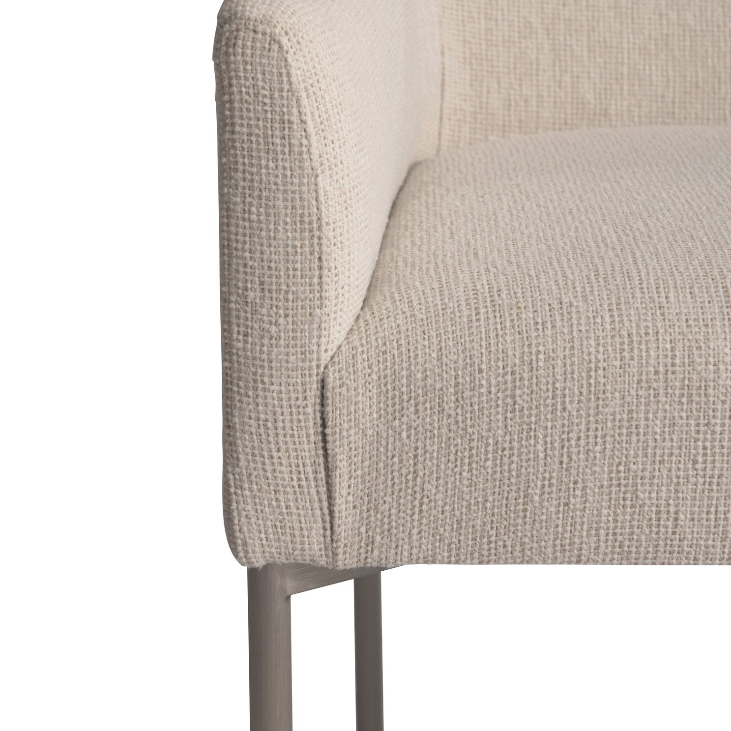 Elevate your dining or seating area with the Sereno arm chair — a refined blend of minimalist form and modern craftsmanship. Thoughtful details like softly tapered arms, elegant back seaming, and a brushed stainless steel base create a versatile piece that complements rustic or contemporary interiors while delivering everyday comfort.