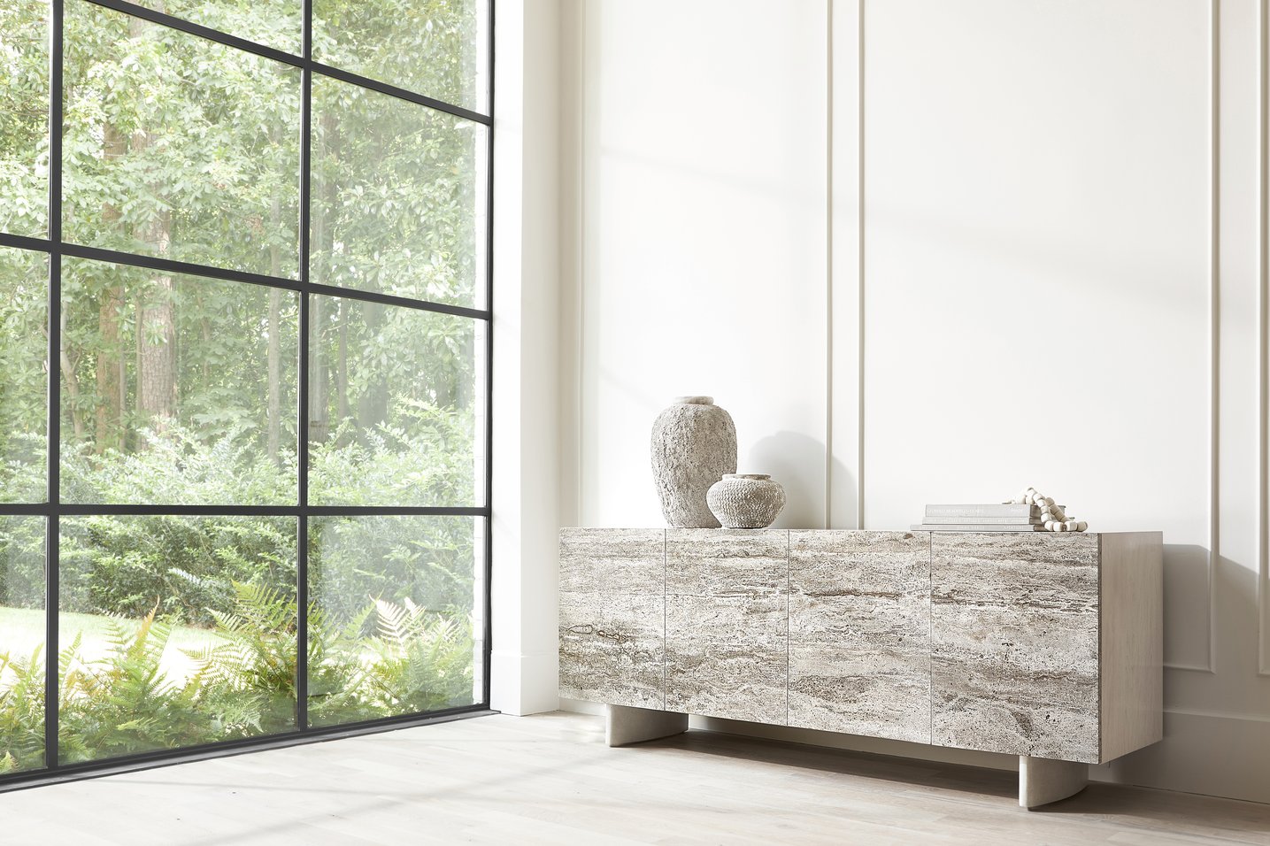 Elevate your living room with the Sereno entertainment credenza — a refined blend of luminous stone and textured walnut that delivers modern organic style and practical media storage. Thoughtful details like soft-close doors, concealed wiring access, and a durable faux-stone base make this piece both beautiful and functional for contemporary homes.
