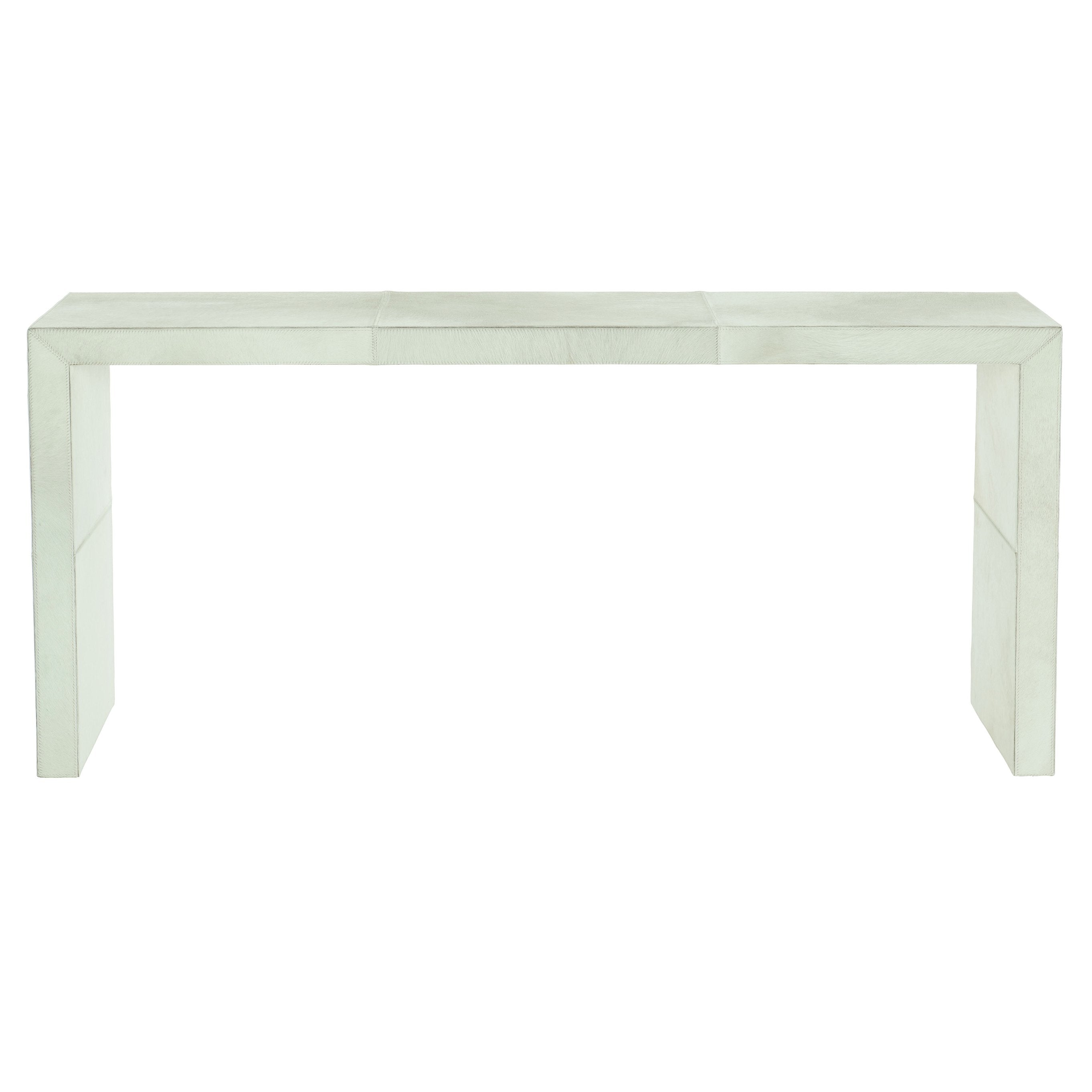 - White hair-on-hide wrapped console with white saddle stitching.