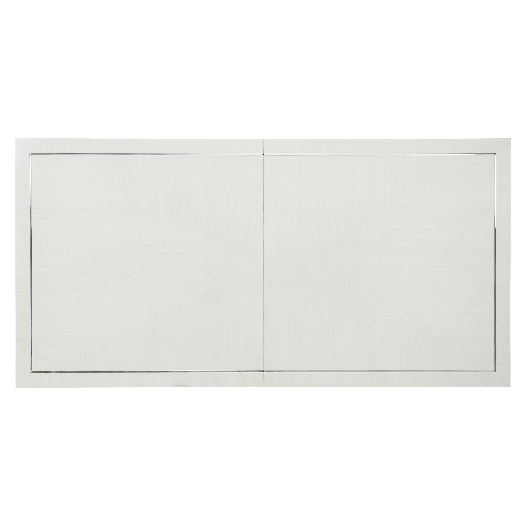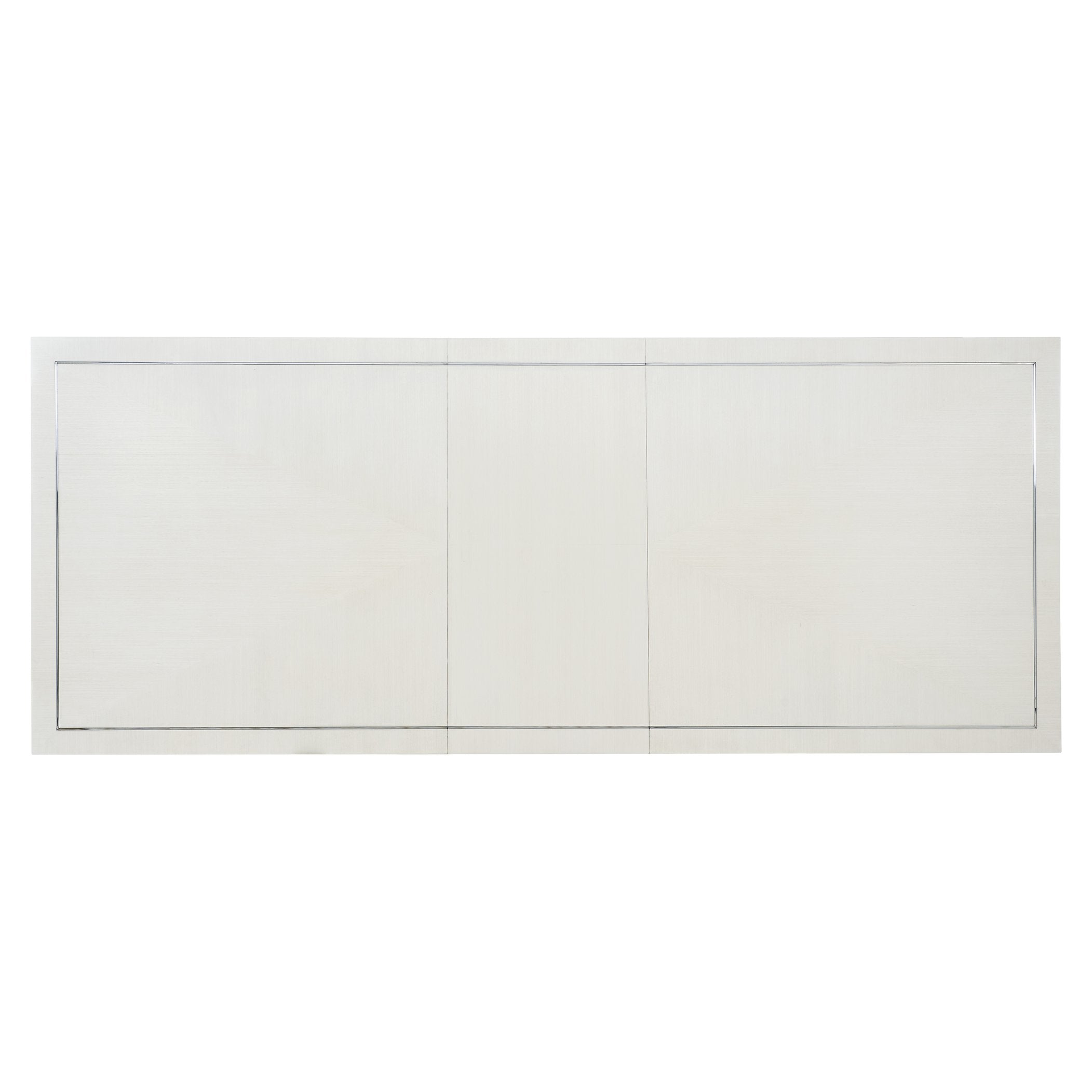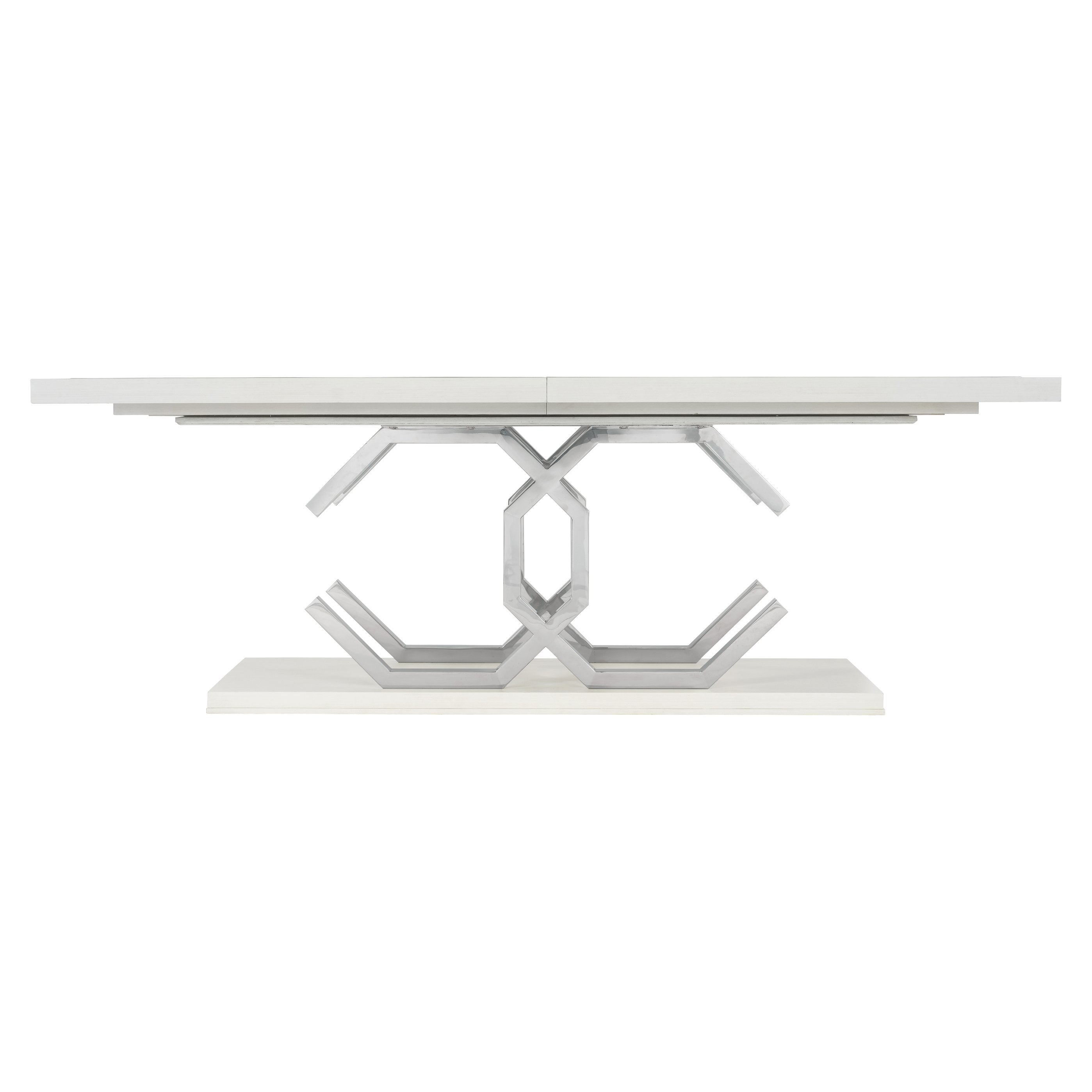 Make a statement with the Silhouette rectangular dining table — a sculptural centerpiece that blends Hollywood Regency glamour with contemporary clean lines. Its eggshell finish, polished stainless steel accents, and interlocking octagon pedestals create a refined, mirror-like presence that elevates both formal and modern dining spaces. Designed for style and function, the table includes a single extension leaf for added versatility.