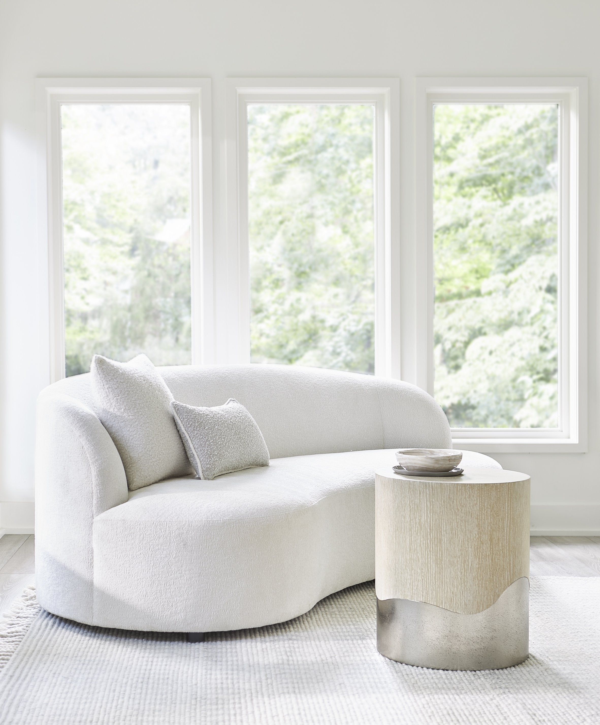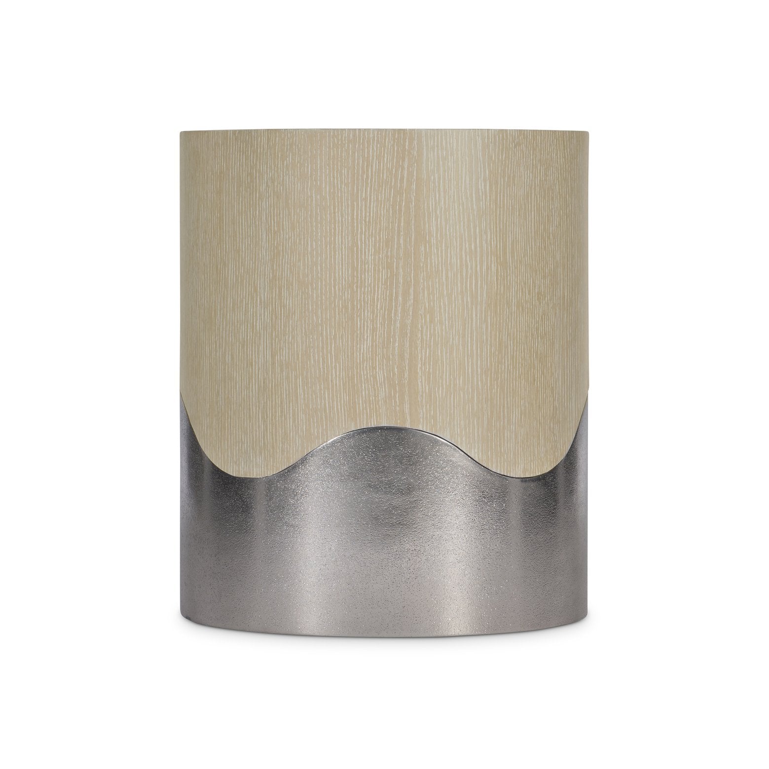 An artful balance of texture and form, this accent table blends rustic warmth with modern refinement. Perfect as a statement beside a sofa or as a chic bedside table, its wave-like aluminum base wraps a quartered white oak form to create subtle movement while the contrasting finishes add depth and sophistication.