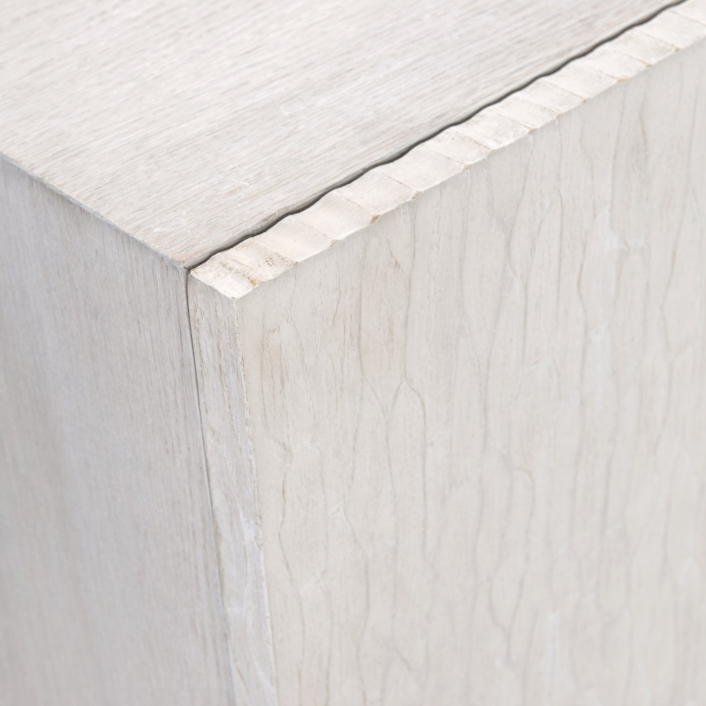 - Distinctive door design: Five soft-close/self-close concealed-hinge doors with cast resin overlays chiseled into tactile wave patterns, finished in Weathered Bone for a handcrafted look.