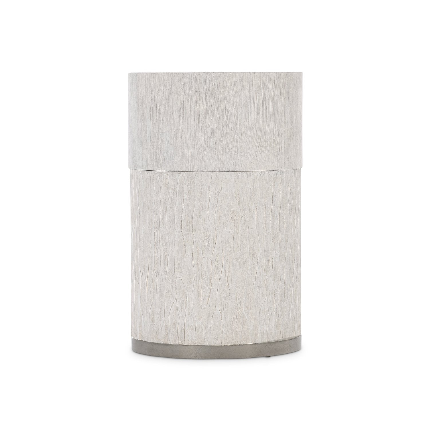 An elegant blend of natural warmth and modern texture, this accent table brings refined rustic-modern style to any room. The smooth wood top and chiseled resin base create visual contrast while the polished metal band adds a sophisticated highlight. At a versatile 21" height, it pairs beautifully with sofas, chairs, or bedside settings.