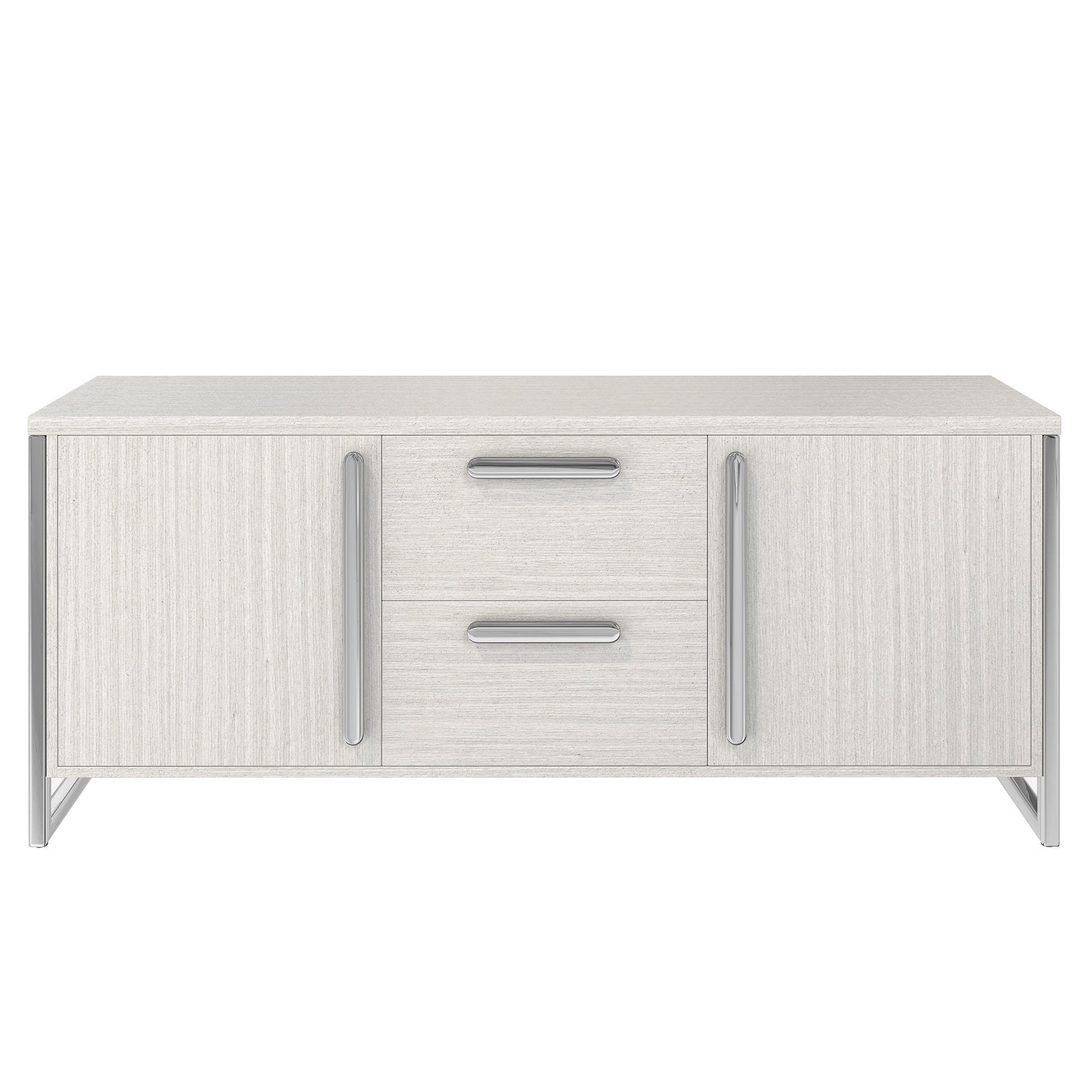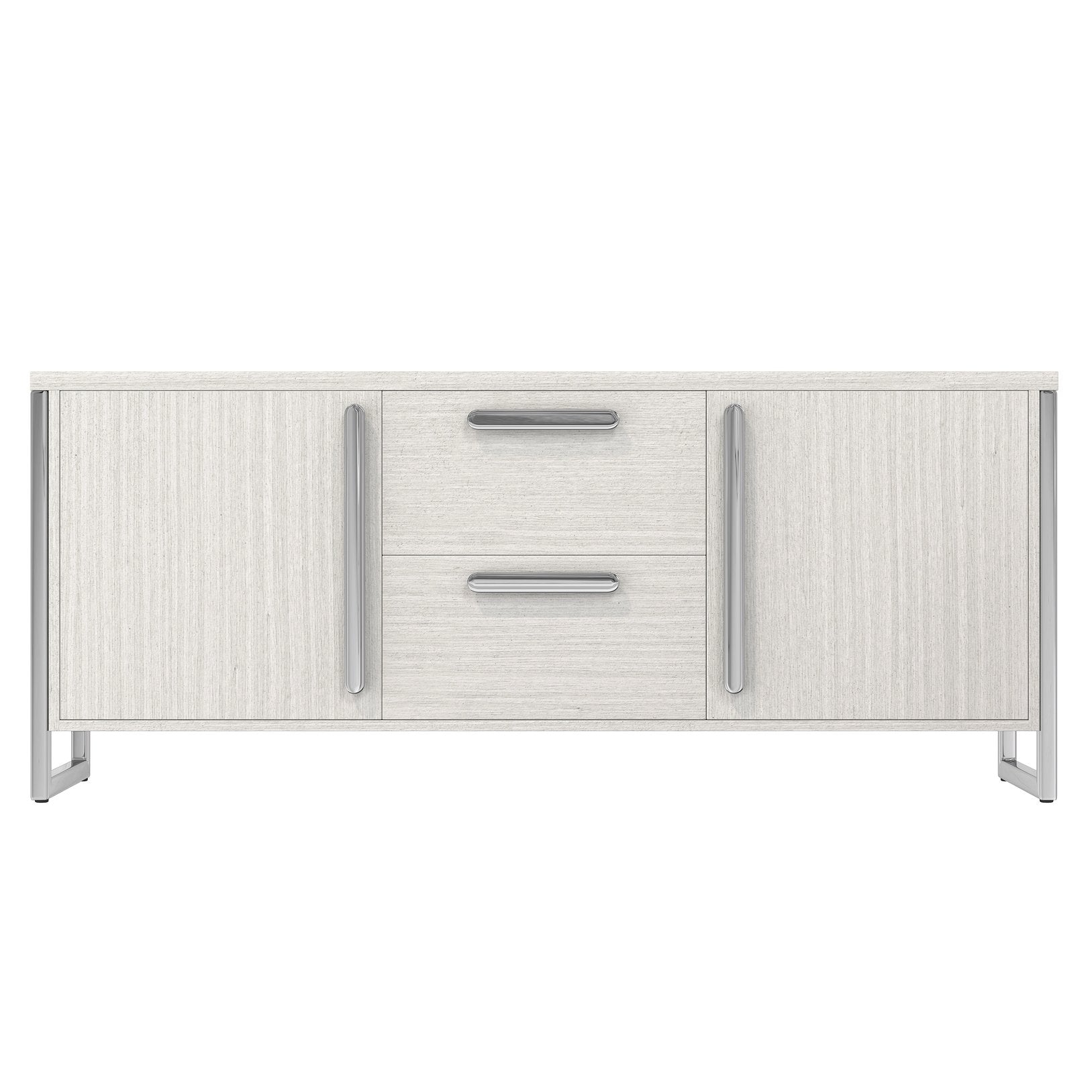 Elevate your dining or living space with the Stratum buffet, a glamorous yet refined storage piece that pairs sleek metallic accents with warm wood grain. Its Mist finish highlights the natural pattern of ash veneers, while polished nickel end frames and streamlined hardware create a contemporary transitional look. Thoughtful soft-close doors and drawers ensure quiet, effortless operation, and adjustable shelving keeps your dinnerware, linens, or media components organized and accessible.