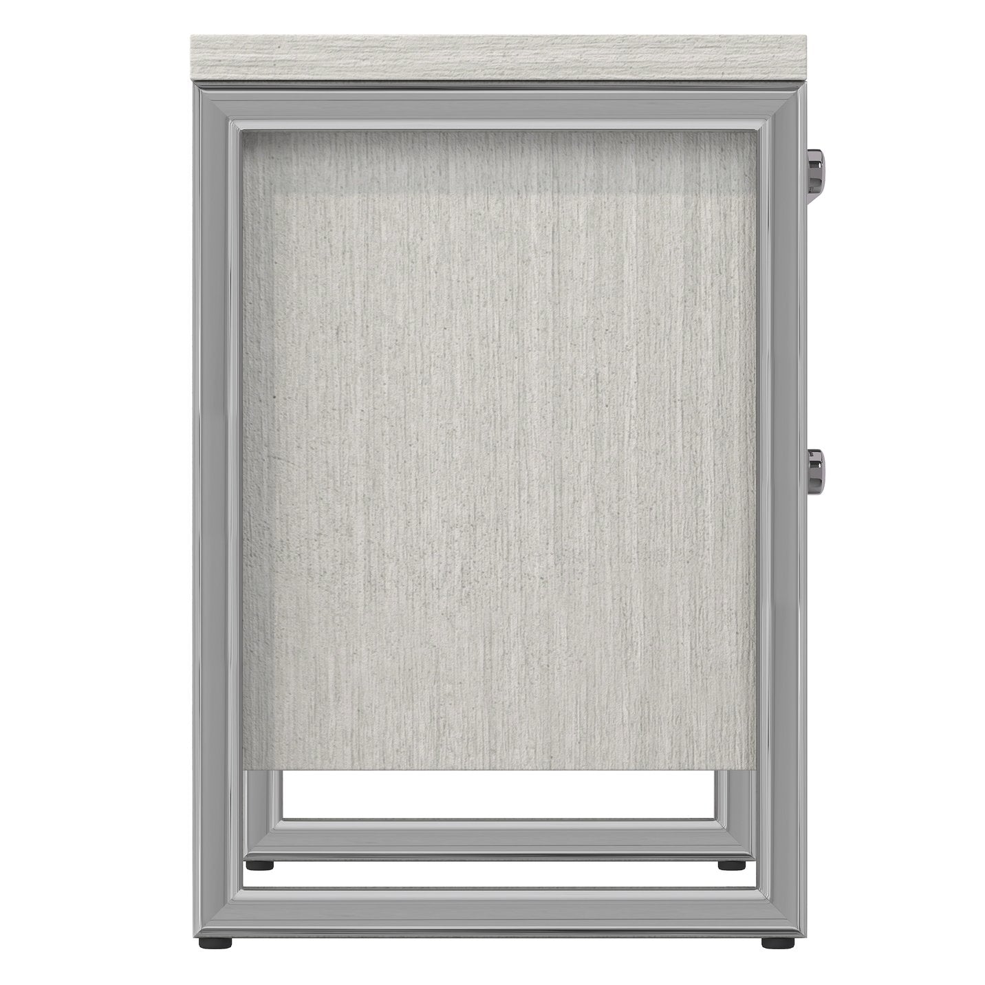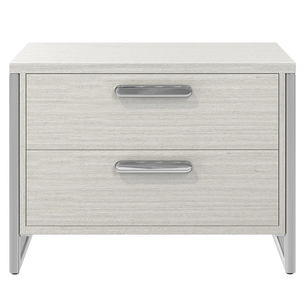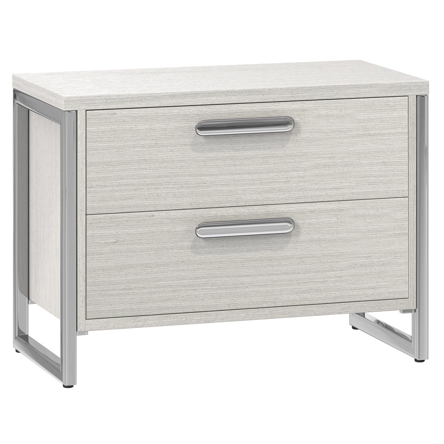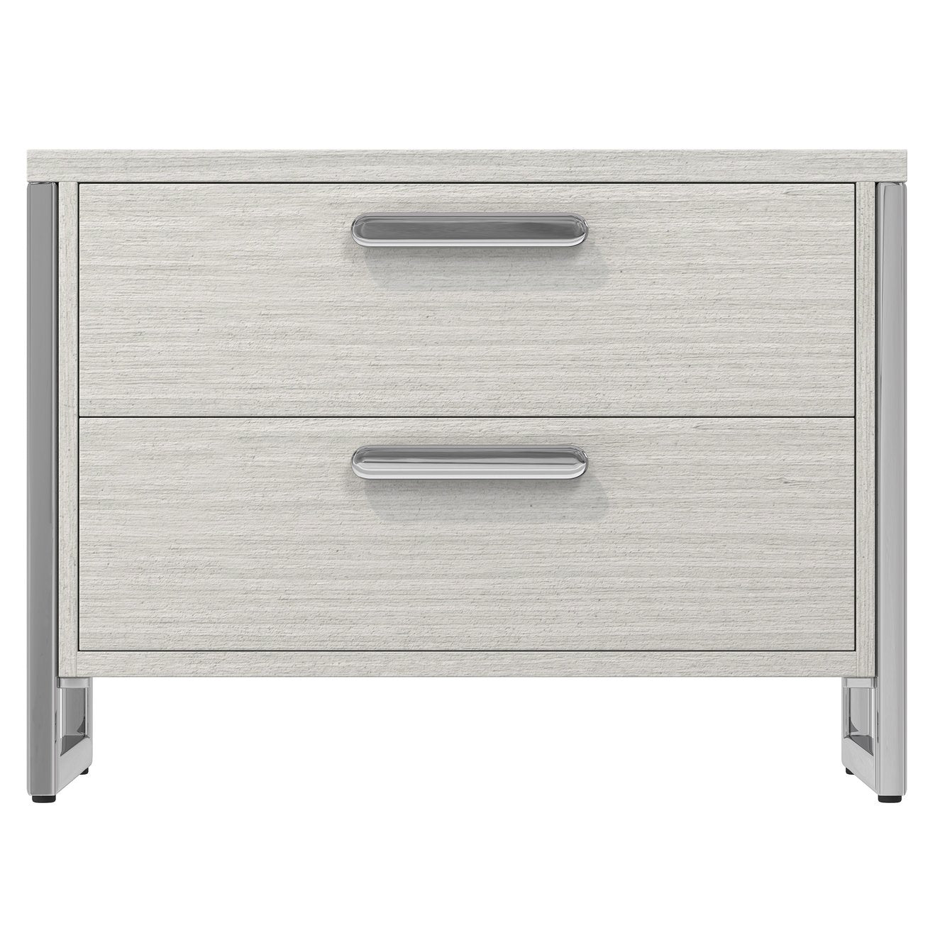 Add a touch of modern glamour to your bedroom with this refined two-drawer nightstand. Polished metal accents and a soft Mist wood-grain veneer create a transitional look that balances elegance with everyday functionality. Thoughtful details—like soft-close drawers and a built-in USB charging unit—make it as practical as it is stylish.