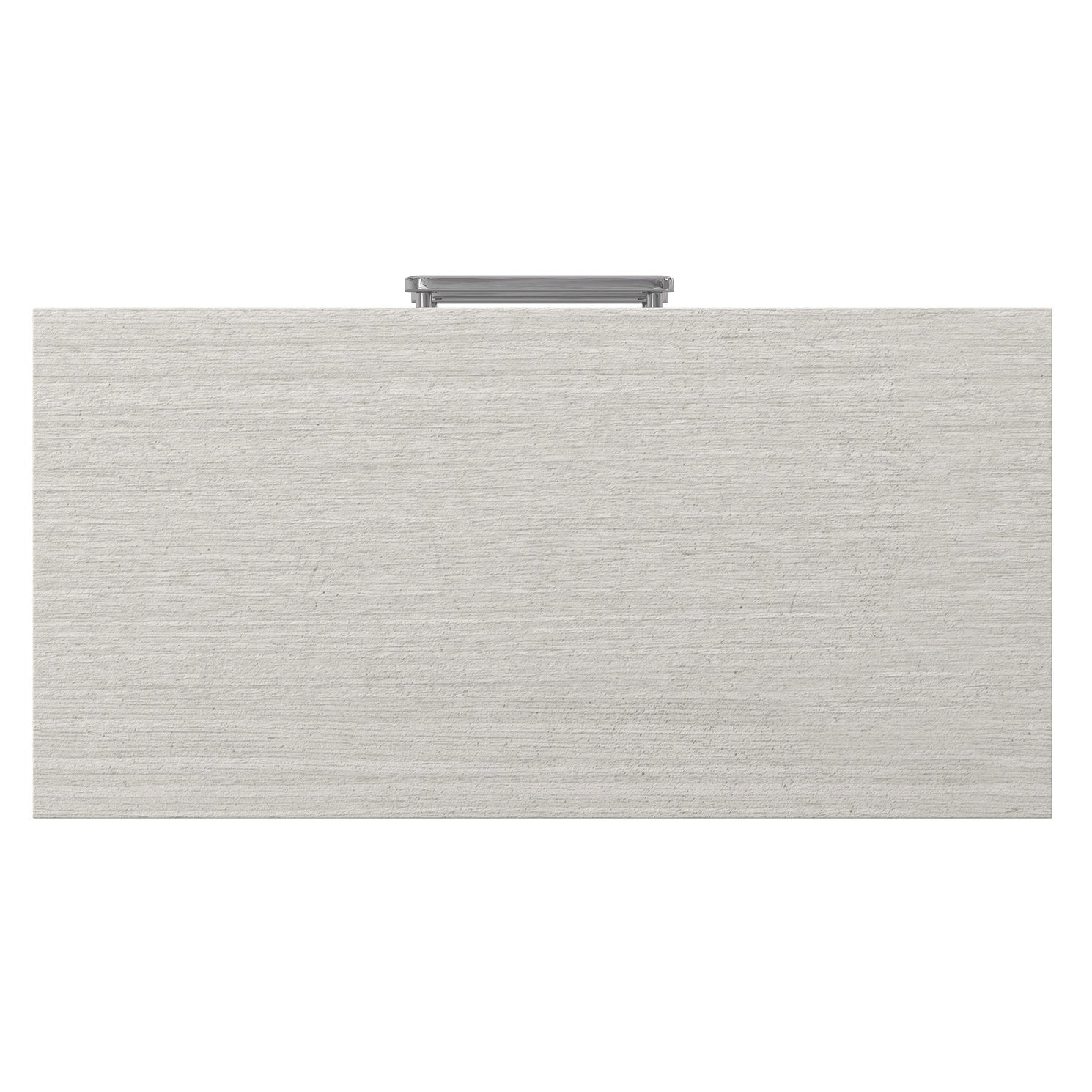 - Ash solids and engineered veneer in Mist finish with metal drawer pulls and supporting end frames in Polished Nickel finish