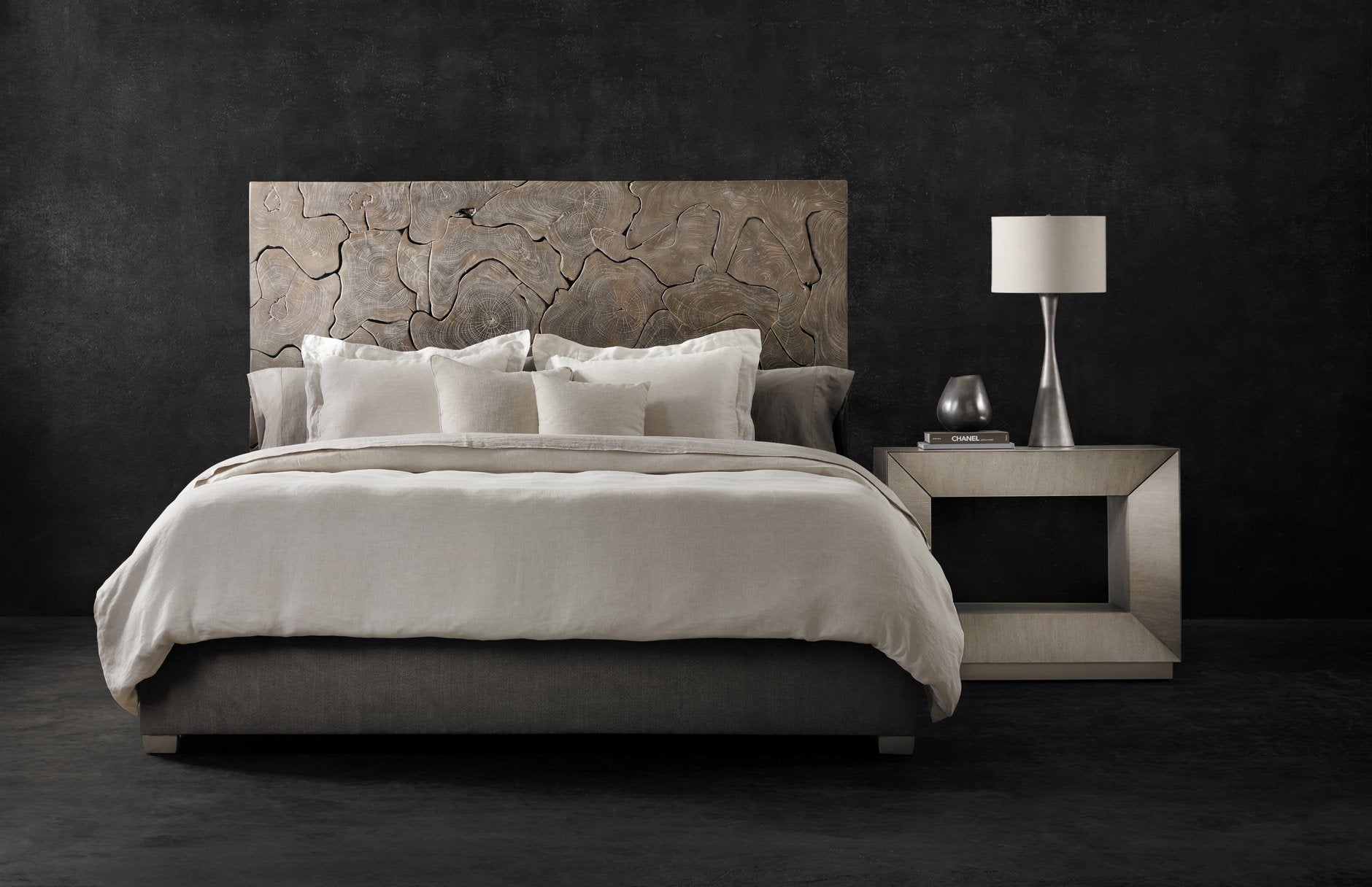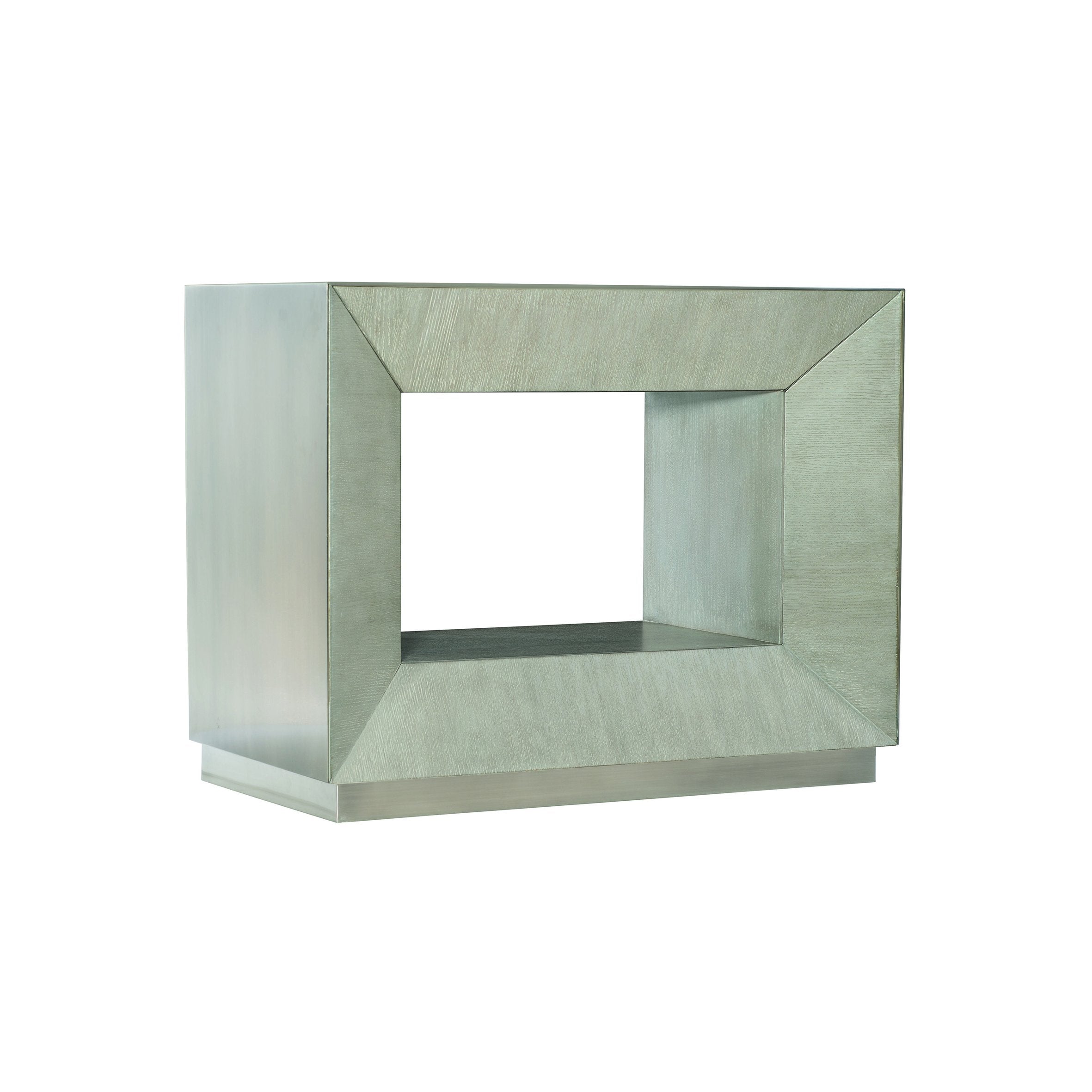 Sleek, sculptural, and quietly luxurious, this nightstand blends minimalist geometry with rich material contrasts to elevate any modern or transitional bedroom. Its open center, cerused white oak interior, and tarnished nickel exterior create visual depth while the hidden trapezoidal drawer keeps essentials organized and out of sight.