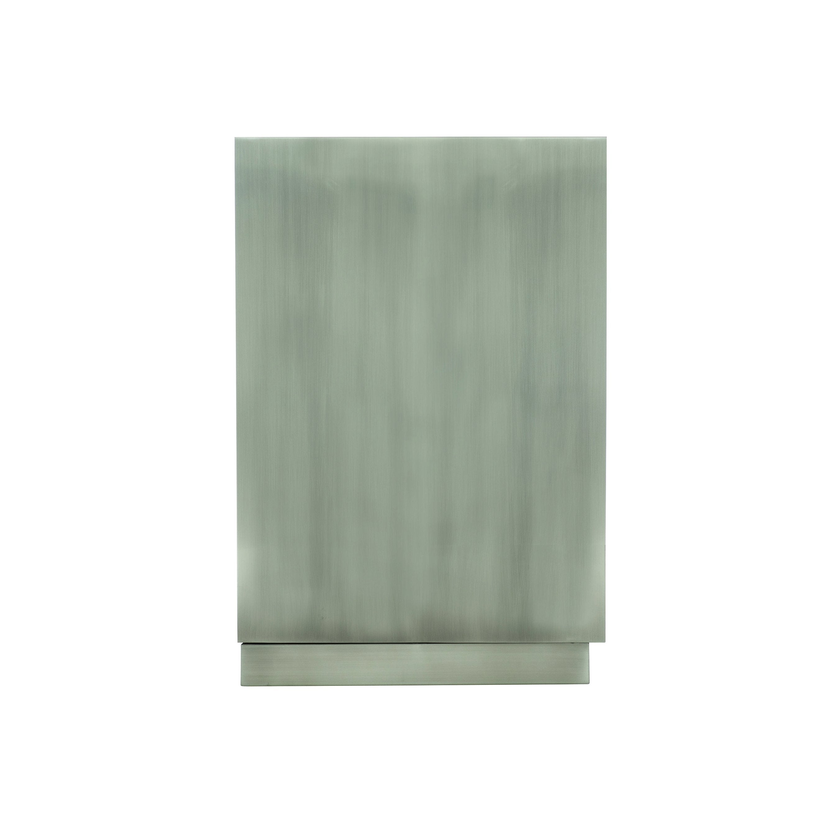 Stainless steel sheet metal exterior in Tarnished Nickel finish. Open front-to-back center section with Cerused Greige interior finish. One drawer. Back panel painted black (behind drawer and lower section). Adjustable glides. Anti-tip kit.