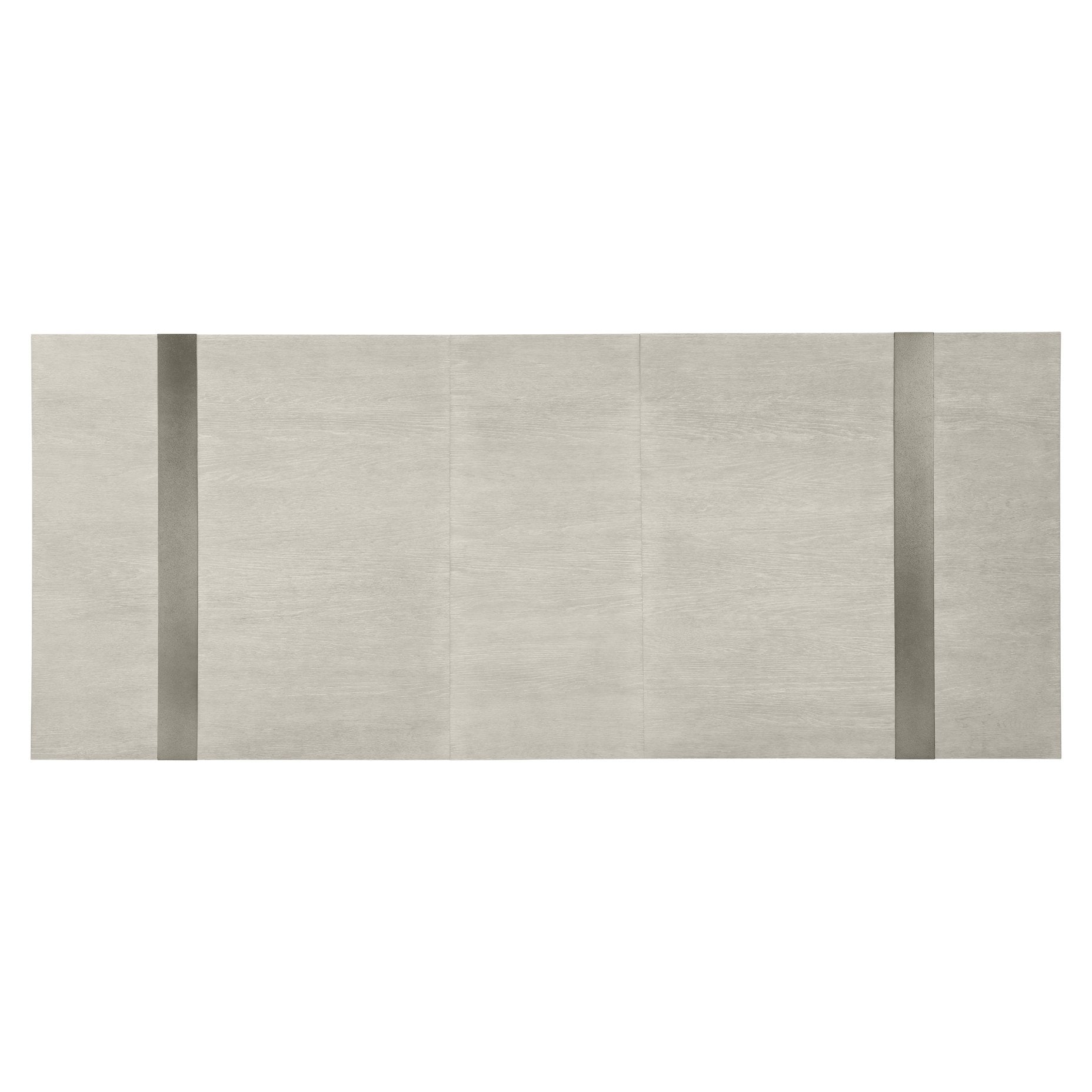 - Wirebrushed oak top and double-pedestal base in Larza finish with sandblasted aluminum overlays on both in Satin Nickel finish