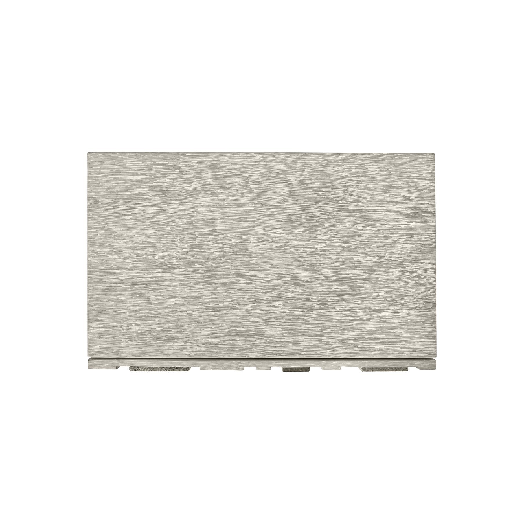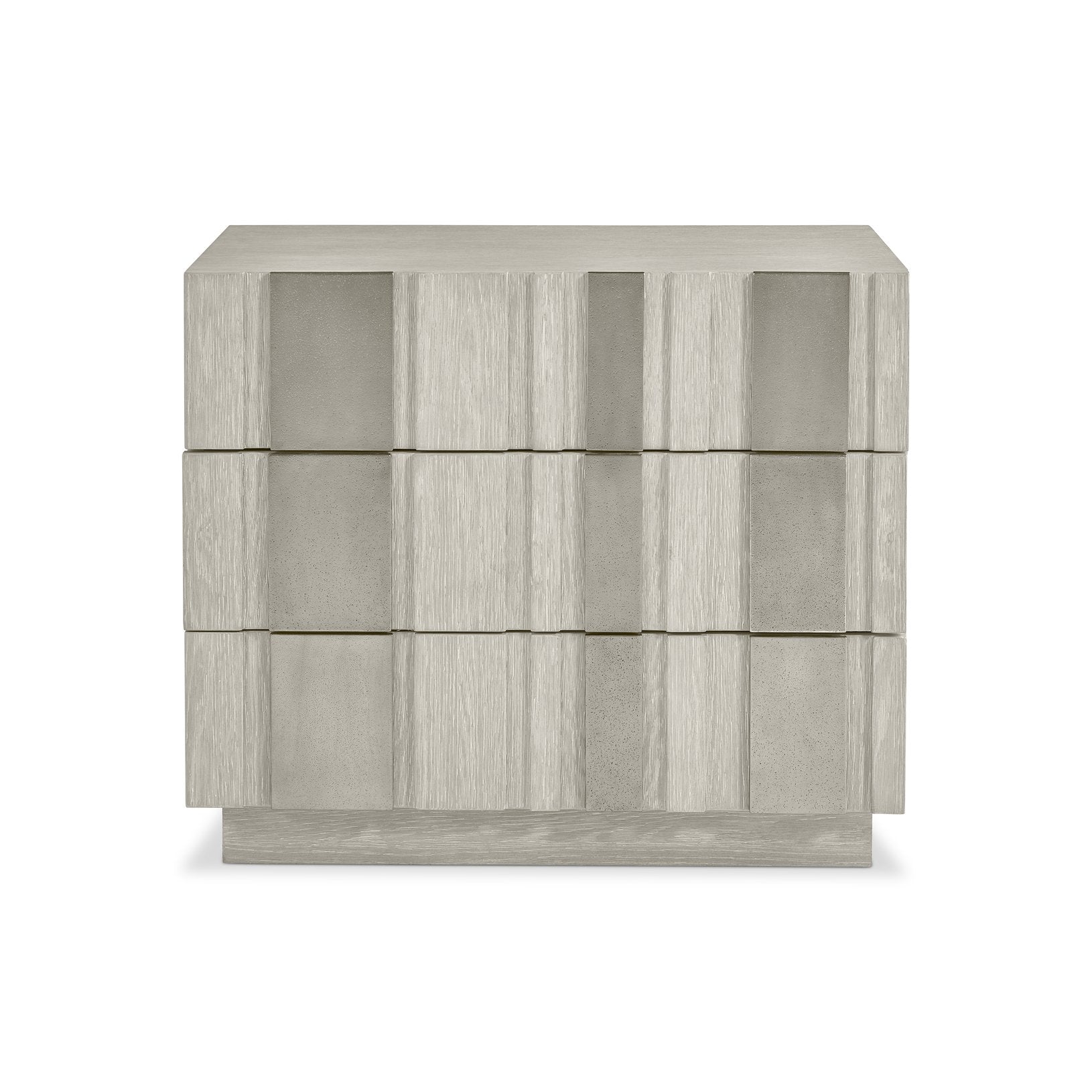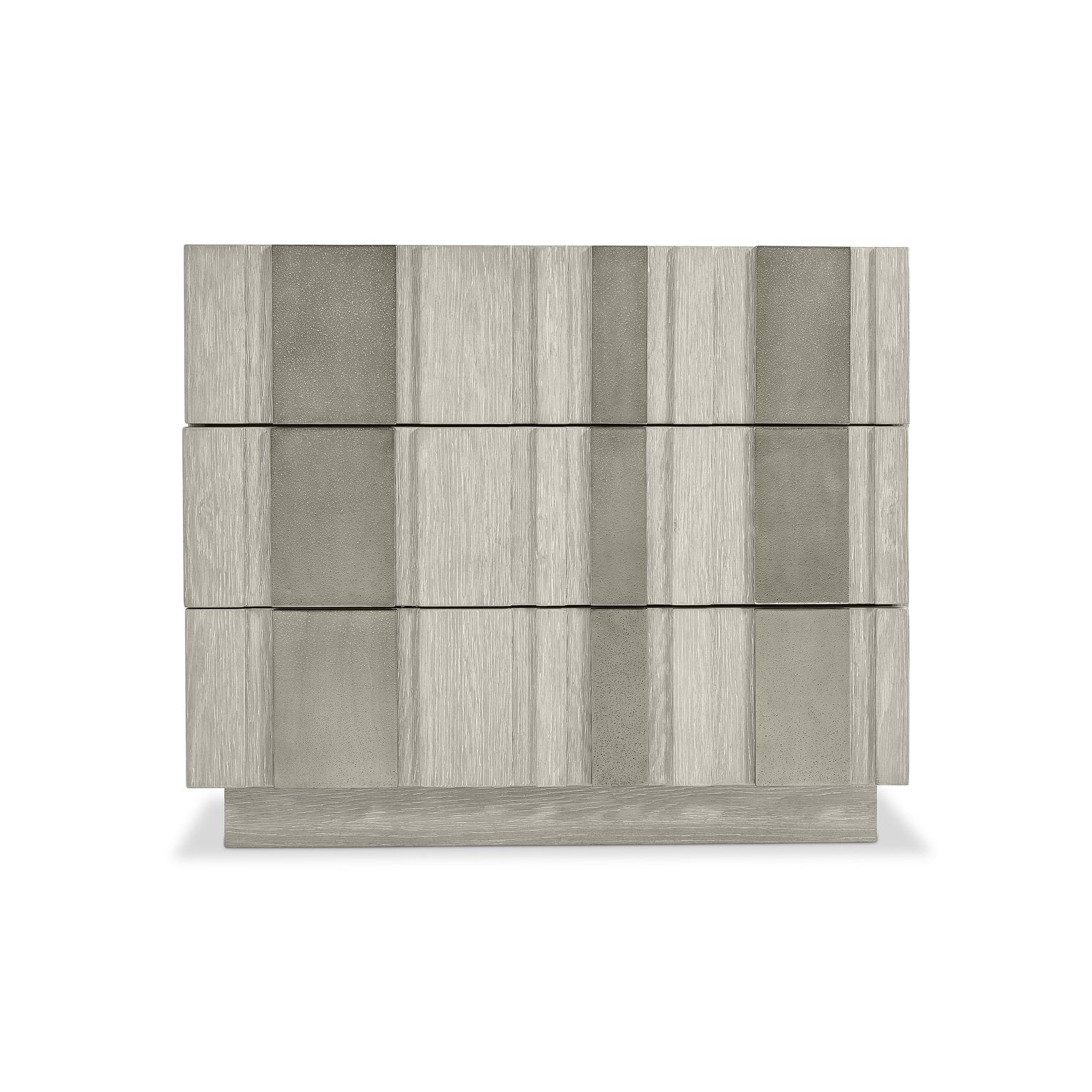 - Design Details: Three raised-panel drawer fronts featuring random aluminum overlays that create a distinctive, handcrafted appearance; smooth top and sides with a plinth base for stable support.