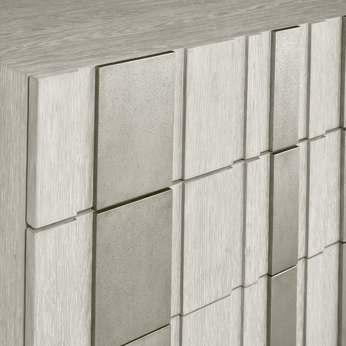 - Materials & Finish: Wire-brushed oak in Larza finish with sandblasted aluminum overlays in Satin Nickel for a textured light-and-shadow effect.