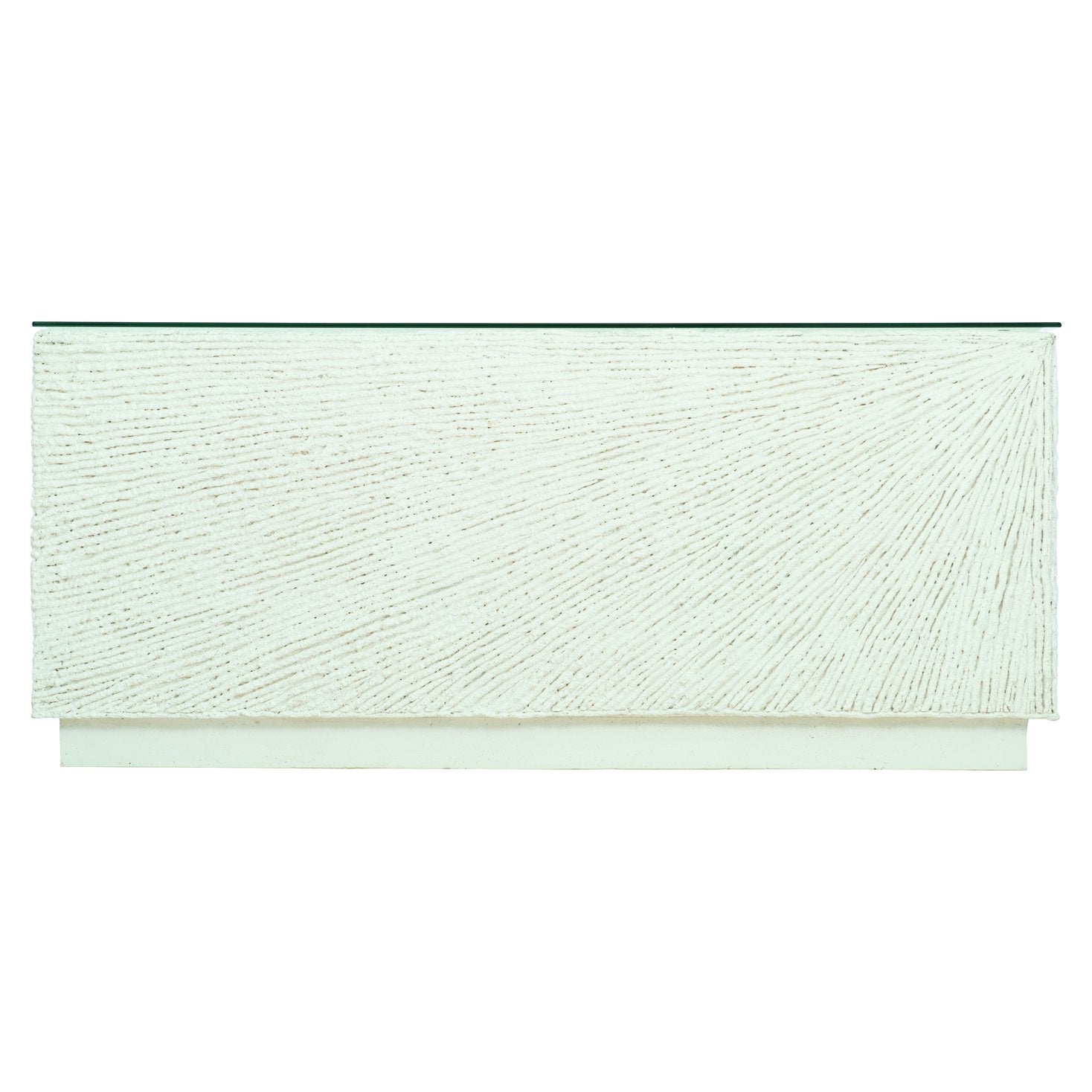 Lay-on tempered glass top with polished edge Natural stonecast with polyurethane protective top coat in White finish with coco twig pattern on top and sides Adjustable glides Note: Glass bumpers included with table