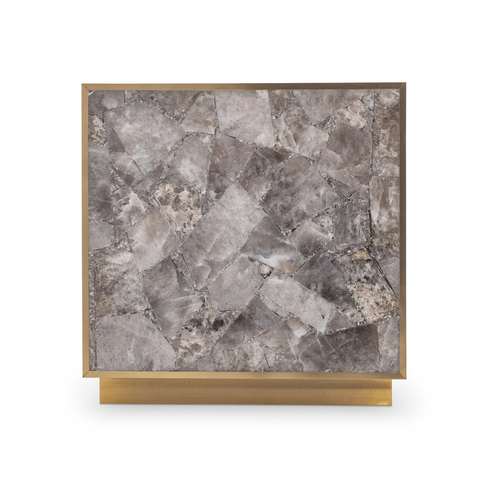 Bring a refined, contemporary accent to your living space with the Tildon side table. Natural smoky quartz panels are artfully encased in an Aged Brass-finished metal frame, creating a balance of organic texture and modern glam. The square silhouette and plinth base provide a strong architectural presence while adjustable glides ensure stability on uneven floors.