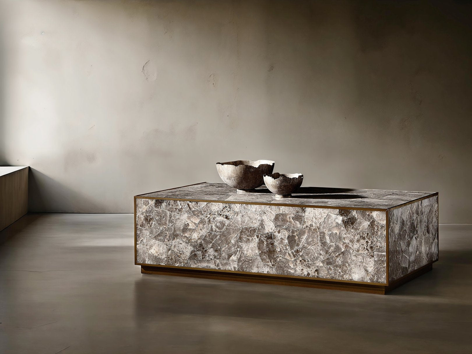 - Materials: Natural smoky quartz panels encased in heavy-gauge metal