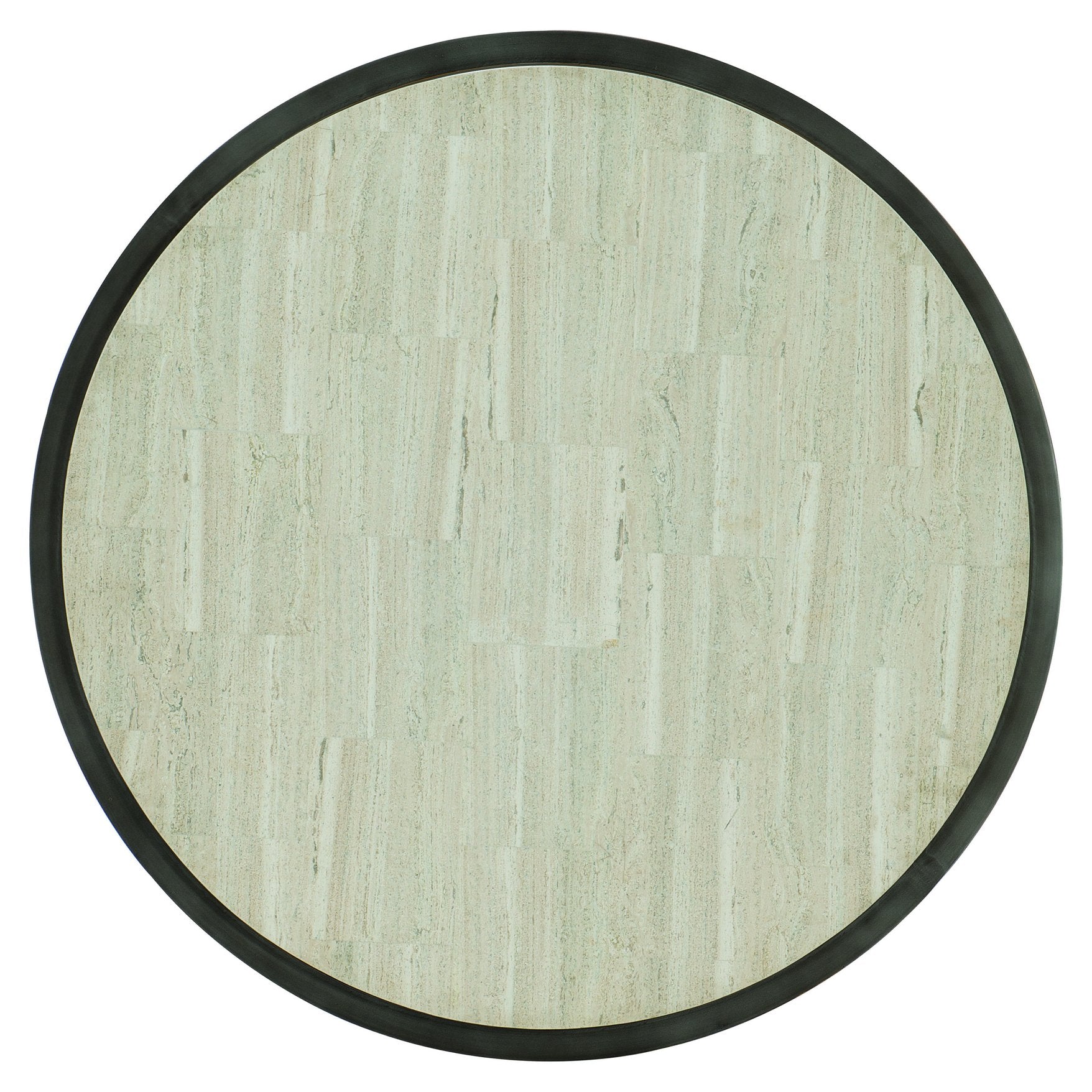 Inset honed White Travertine stone top (unsealed). Plated steel base and stretchers in Antique Pewter finish. Adjustable glides.