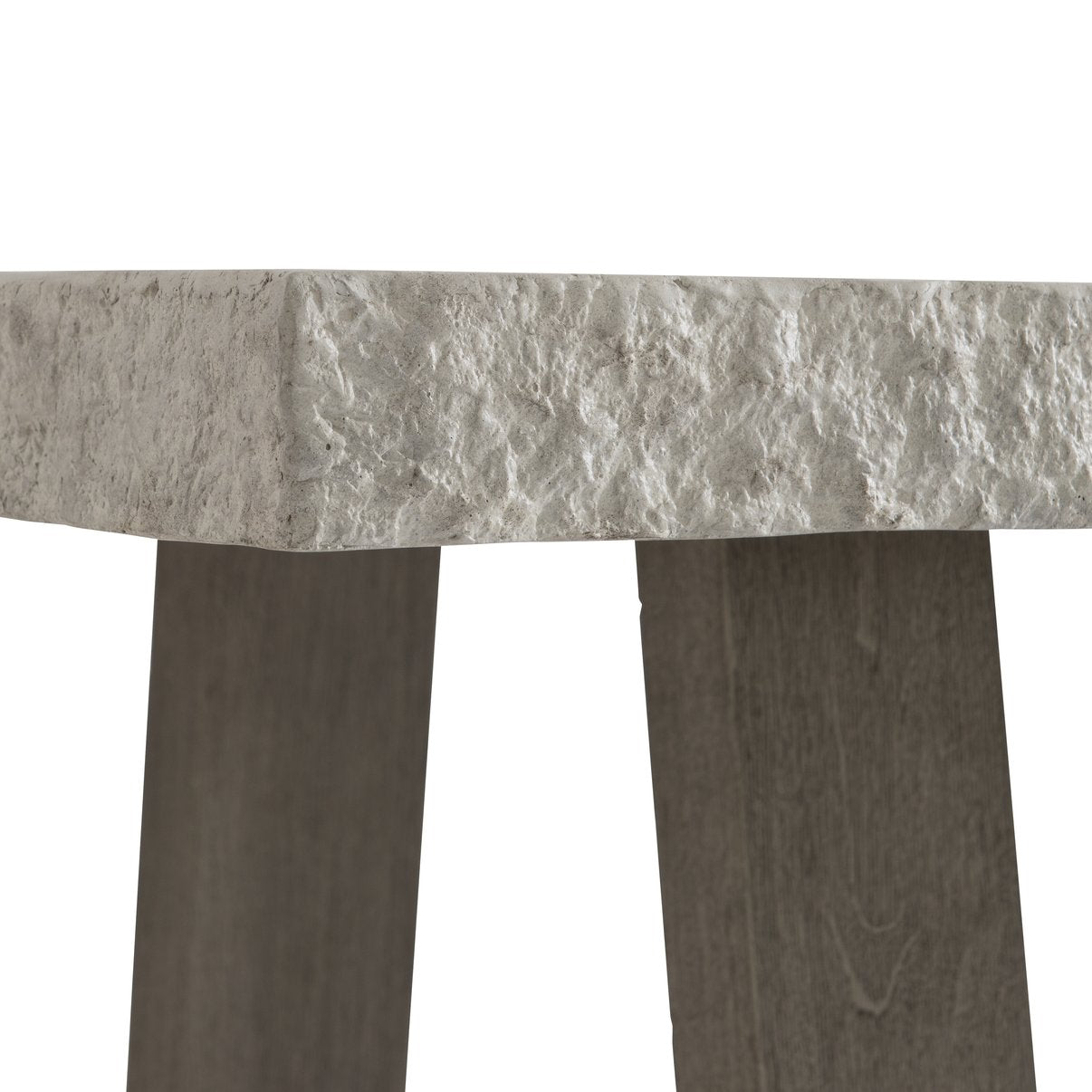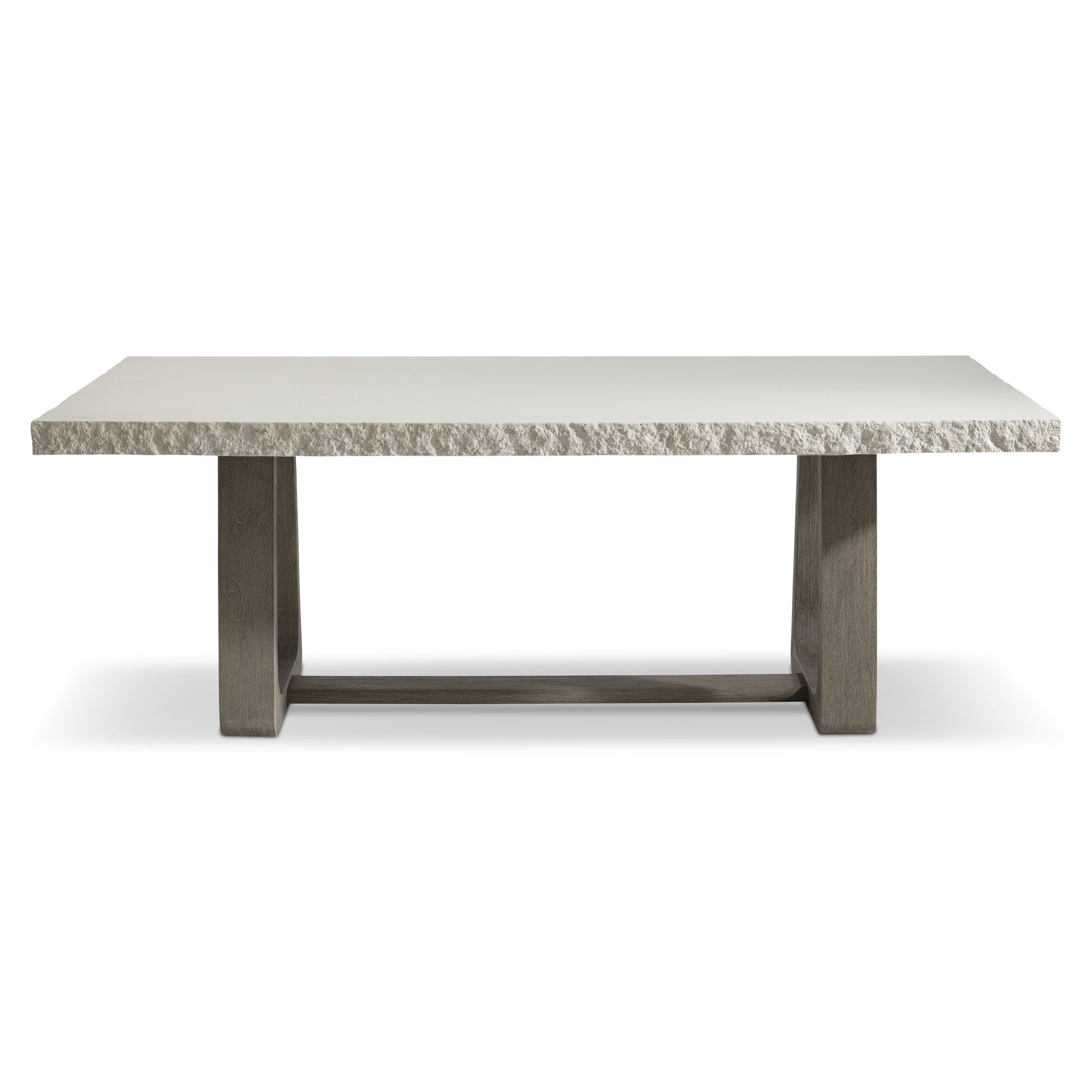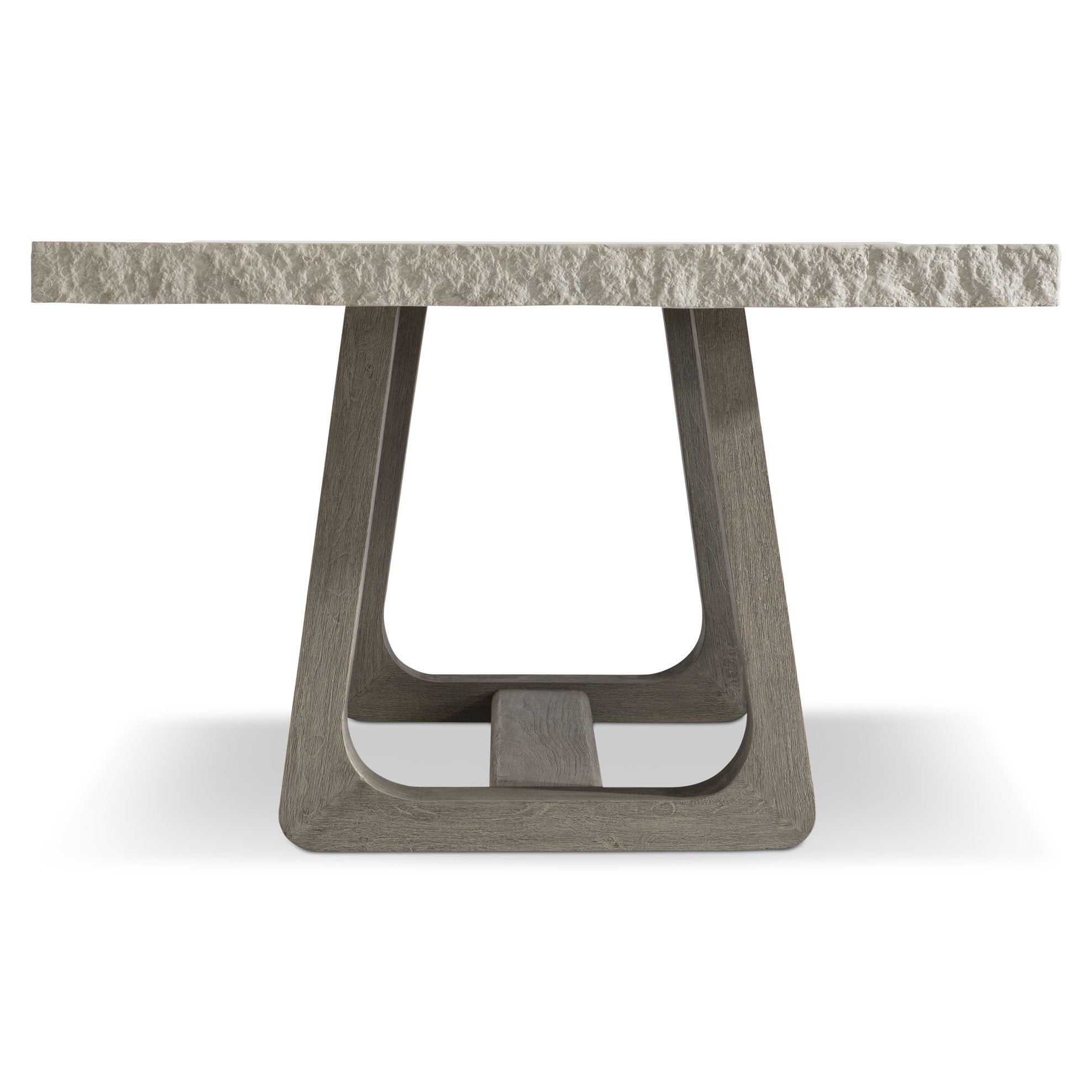 A refined blend of natural materials and contemporary form, this outdoor dining table pairs the tactile presence of rough‑hewn stone with the warm lines of teak to create a statement piece for both garden terraces and indoor dining rooms. Its smooth, sand‑grey concrete top and sculptural teak pedestal base provide a durable, weather‑resistant surface and an inviting silhouette that complements modern and organic settings alike.