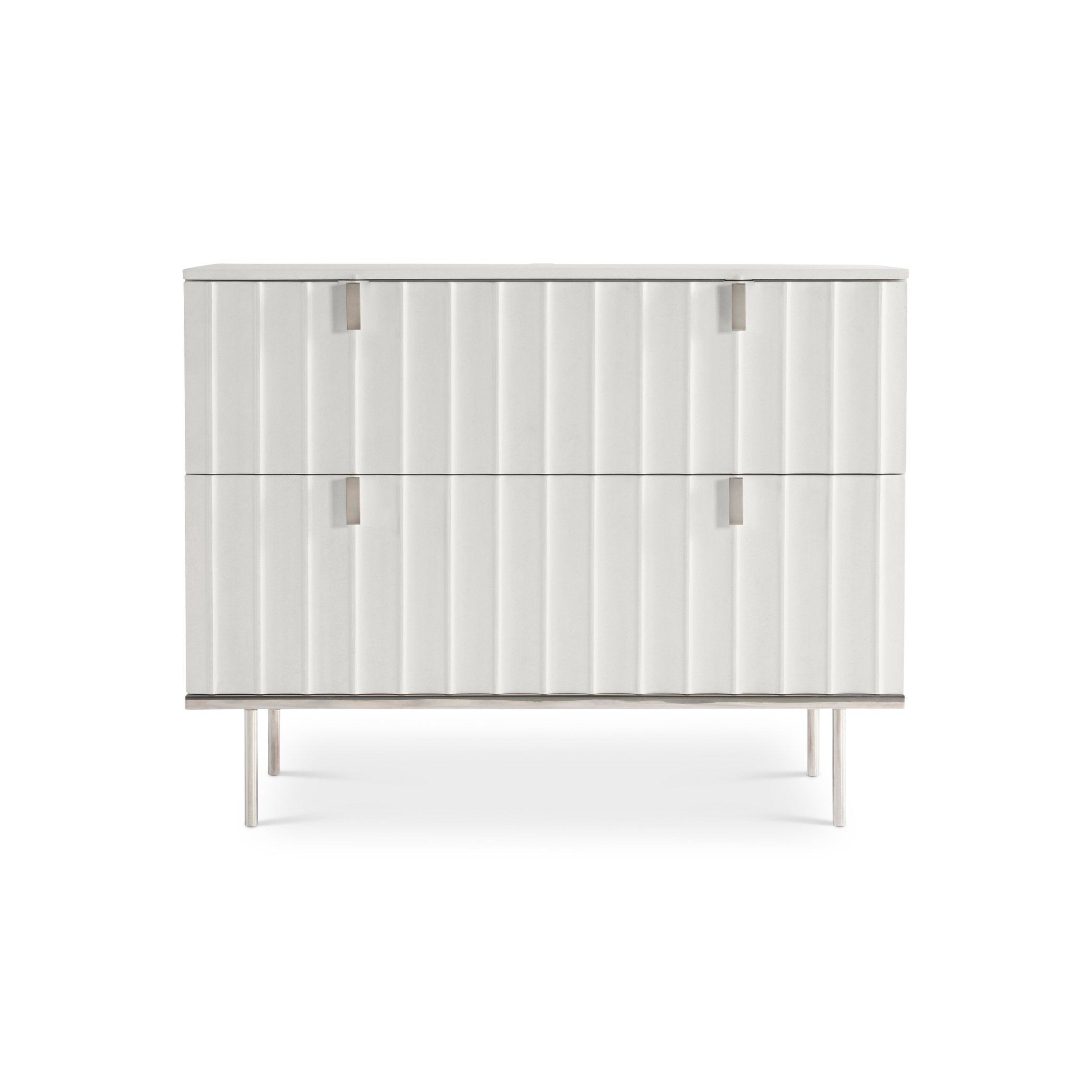 A refined blend of modern glamour and understated texture, this nightstand brings sculptural presence and everyday practicality to the bedroom. Its white Adobe faux stone finish and fluted cast-resin drawer fronts create a tactile, high-end look, while a polished stainless steel base and sleek metal pulls add reflective contrast. Thoughtfully appointed features—like soft-close drawers and an integrated two-port USB charger—make it as functional as it is stylish.