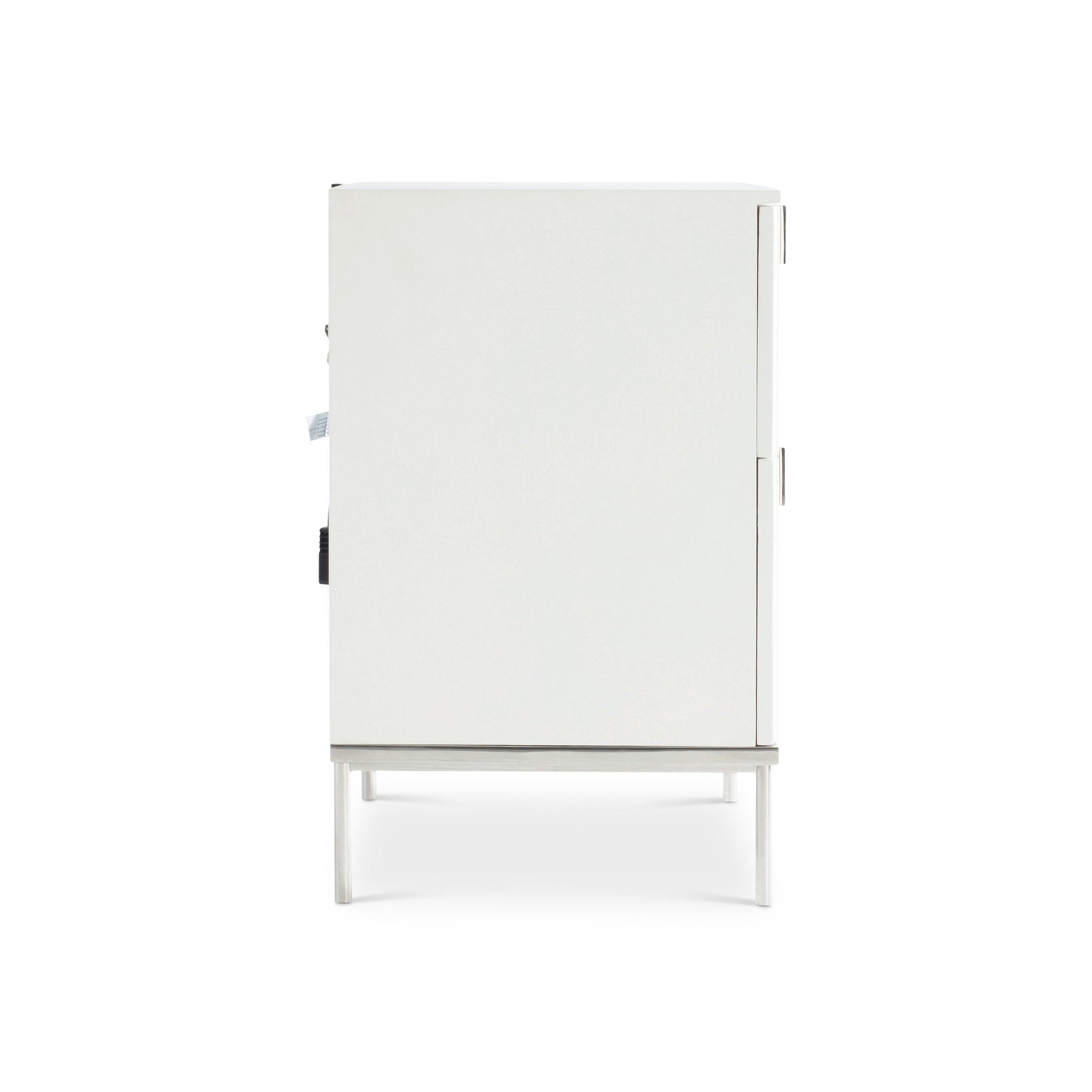 - Hardware & base: Polished stainless steel base and sleek metal pulls for contemporary contrast