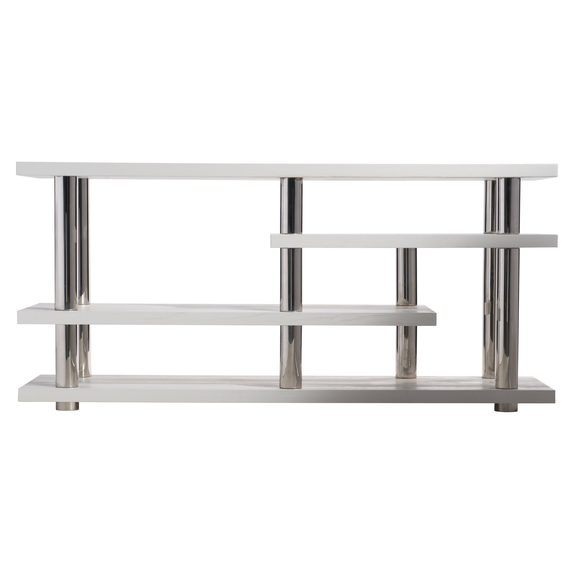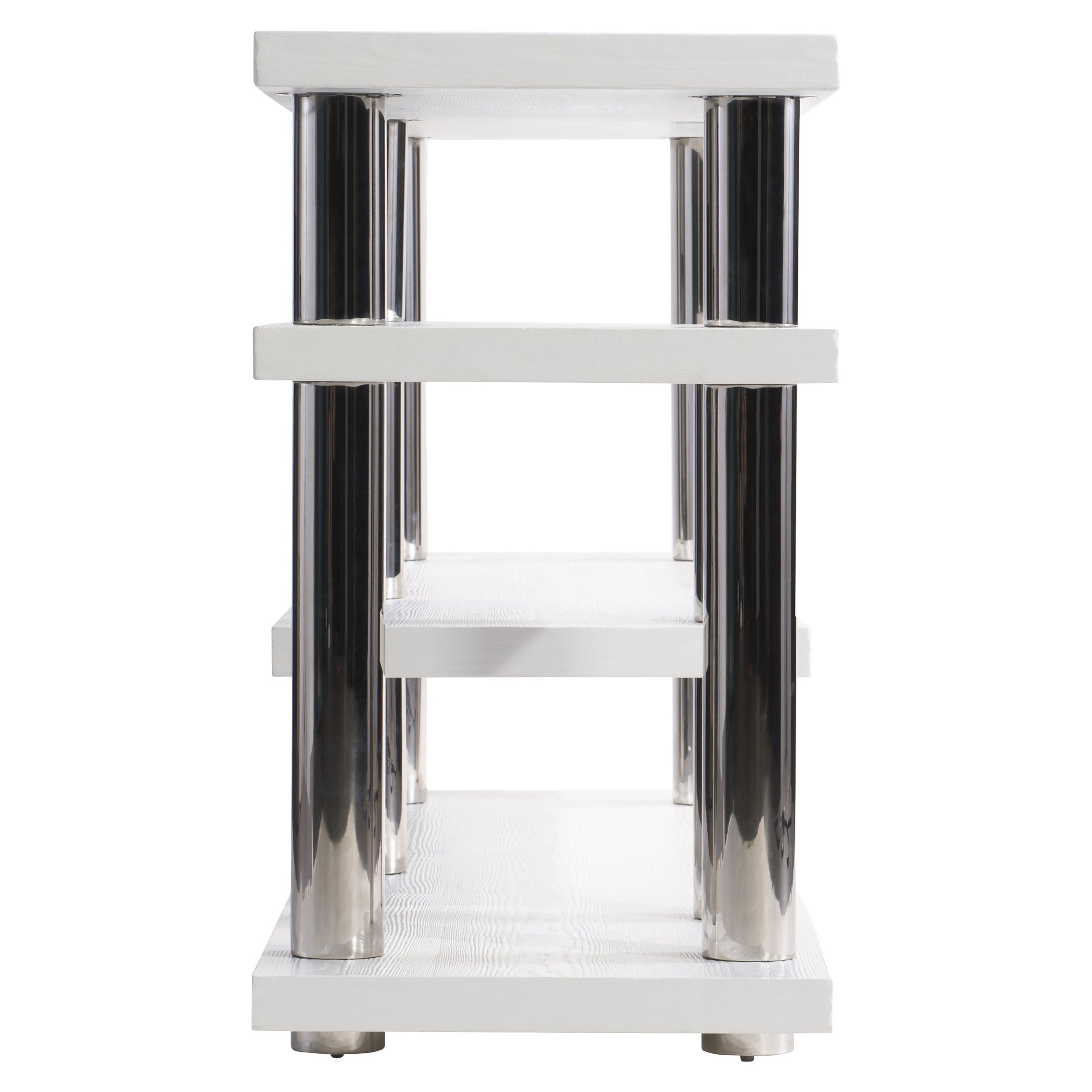 Elevate your entryway or living space with the Bernhardt Yuma Console Table — a modern, sculptural piece that blends warm wood tones with polished stainless steel for a striking, dimensional look. Its staggered shelves and varying-length support posts create visual interest while offering practical storage and display options for décor, books, and everyday essentials.