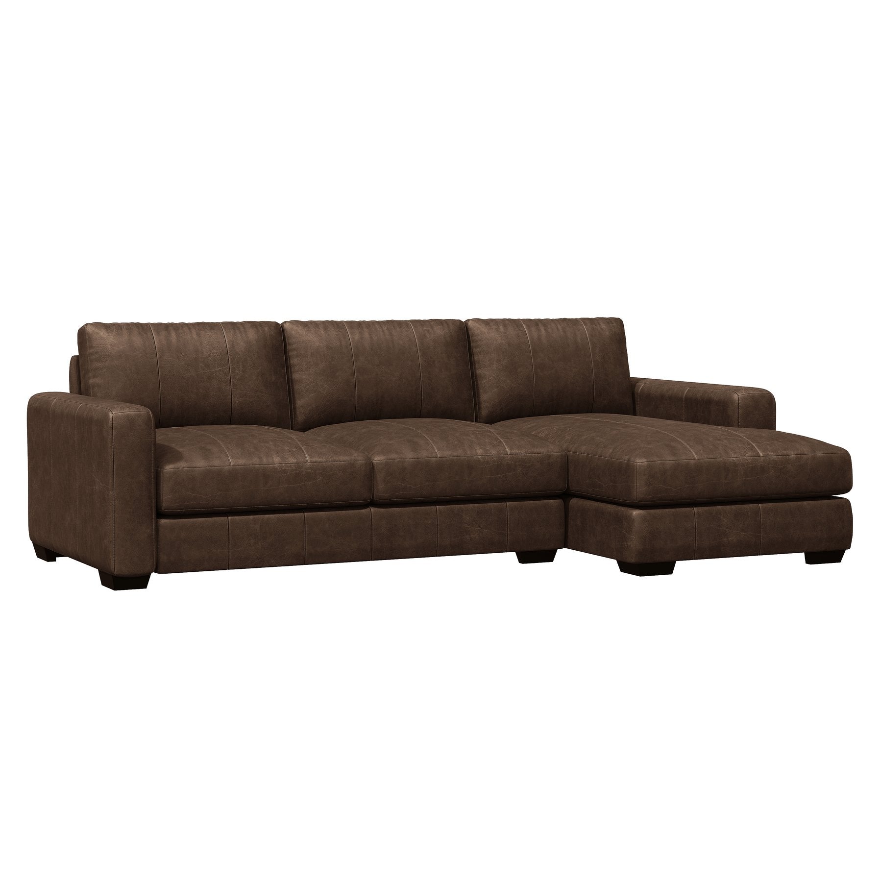 Sink into sophisticated comfort with this handcrafted leather sectional that blends modern lines with plush lounge-worthy seating. Upholstered in top-grain leather and finished with refined details, this made-to-order piece suits contemporary and transitional interiors while offering durable everyday comfort.