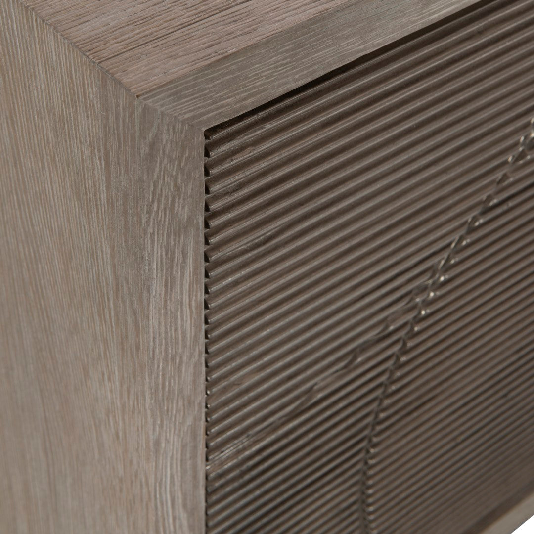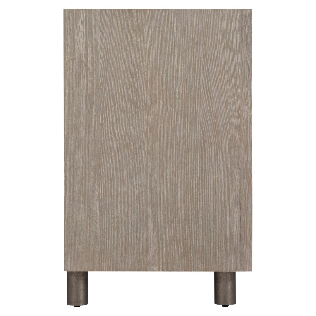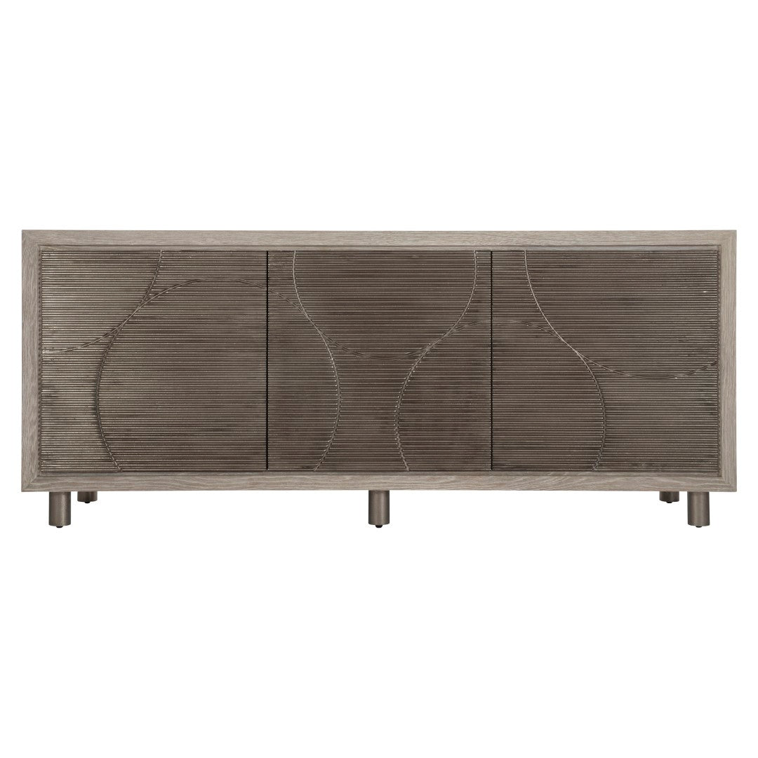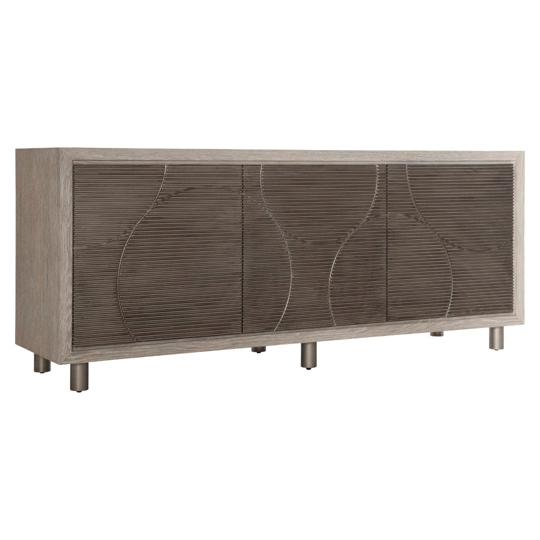 - Three push-to-open doors with circular patterned cast aluminum overlays in Graphite finish.