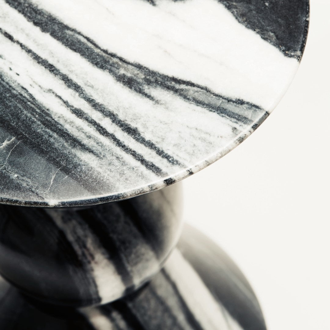 - Conic top and base are joined by a central sphere to create hourglass silhouette.