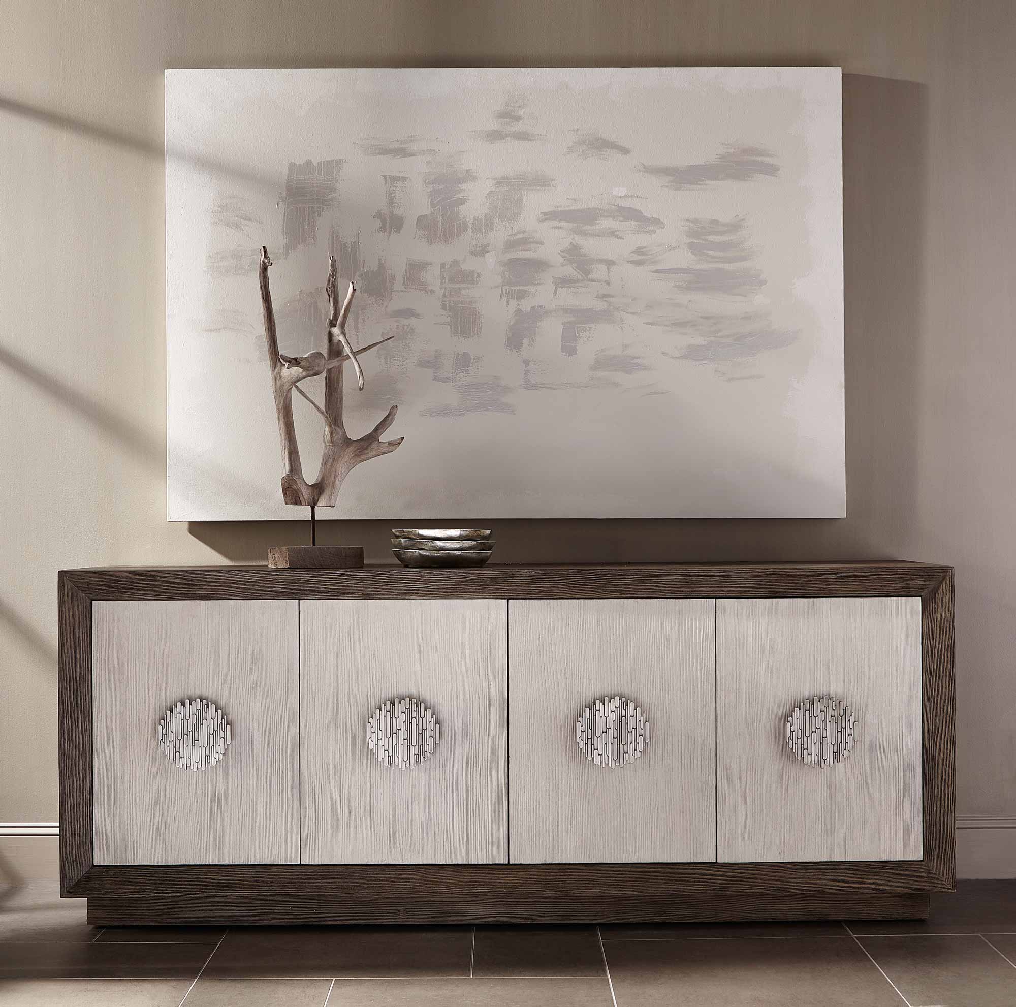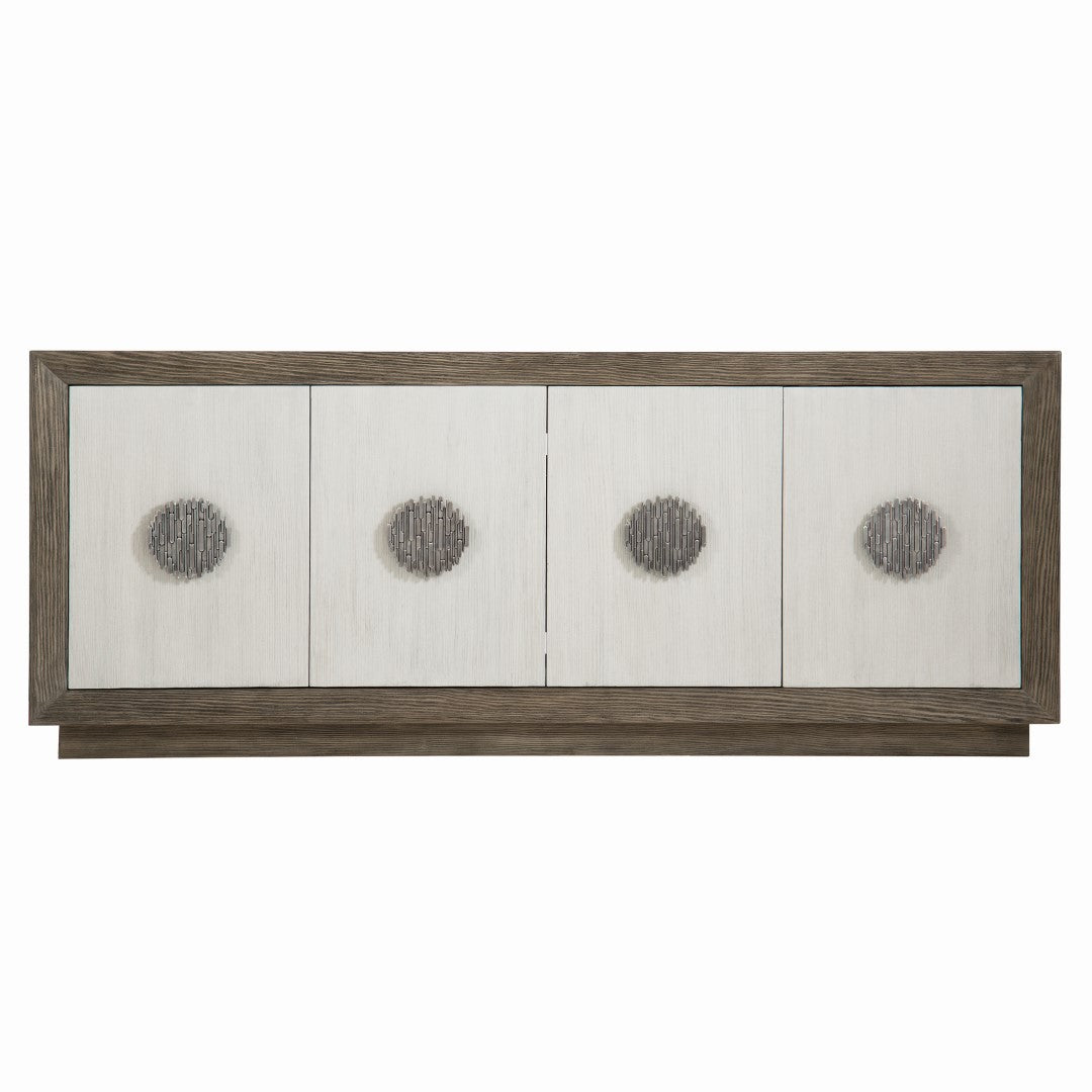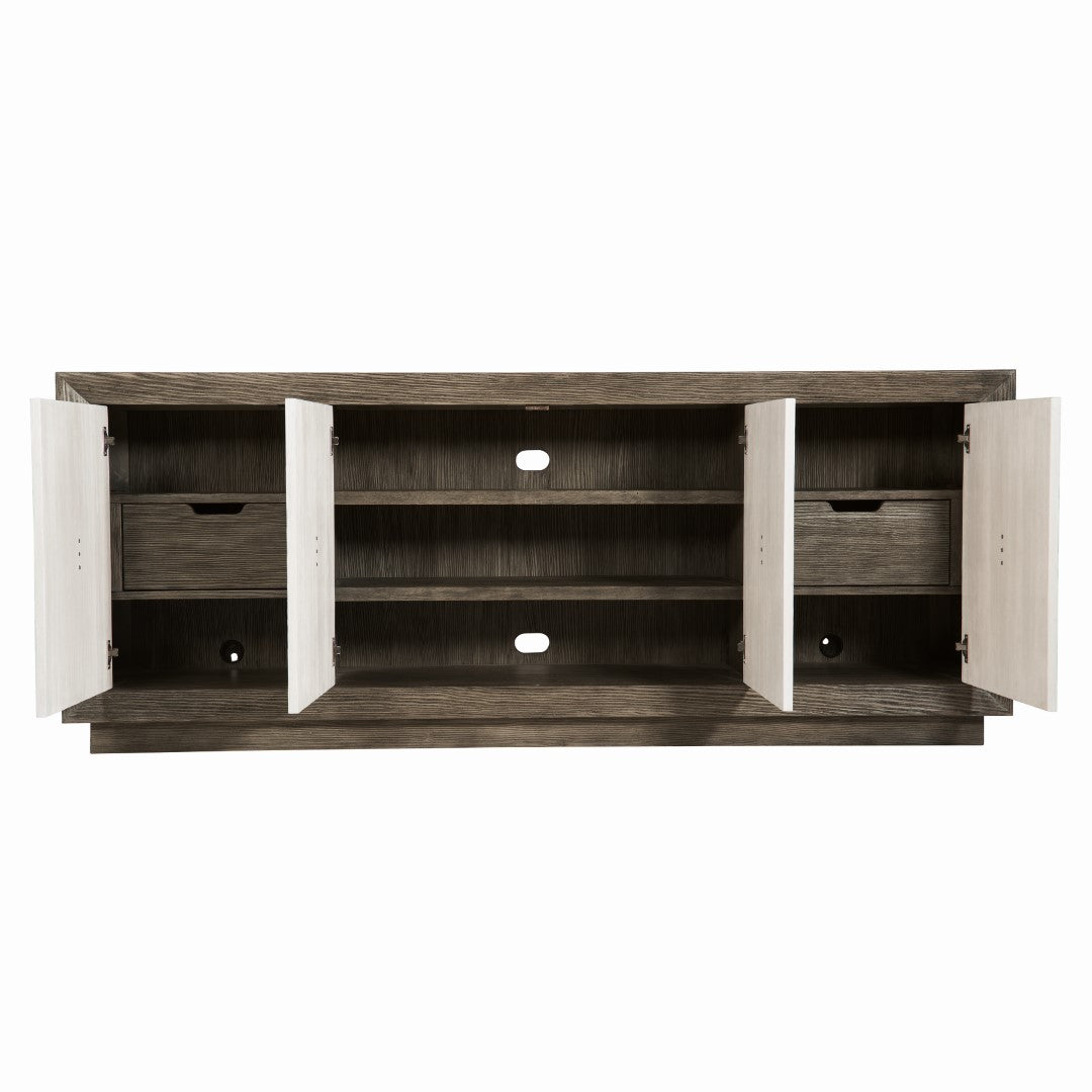 - Four doors. Behind end doors is one fixed shelf, one drawer with hand cut-out and fixed bottom shelf surface. Back panel has one grommet hole with cover for wire management. Behind center paired doors are two adjustable/removable shelves. Back panel has cut-outs for wire management.