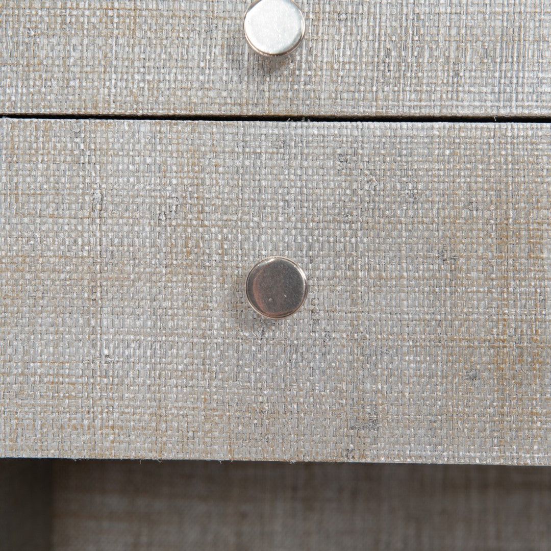 - Raffia covered exterior and drawer fronts.