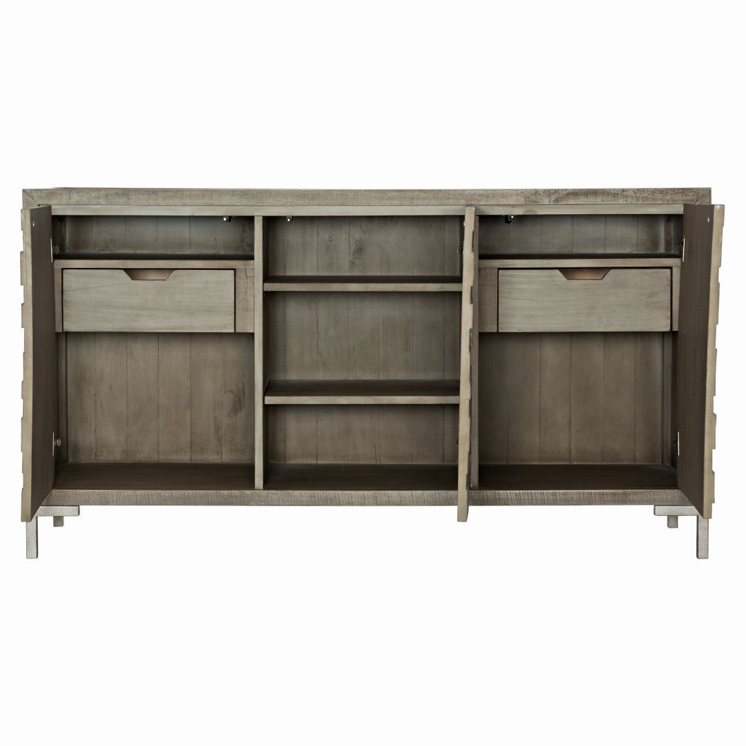 - Behind left and right doors is one fixed shelf, one drawer with hand cut-out and fixed bottom shelf surface. Behind center door are two adjustable/removable shelves and fixed bottom shelf surface.