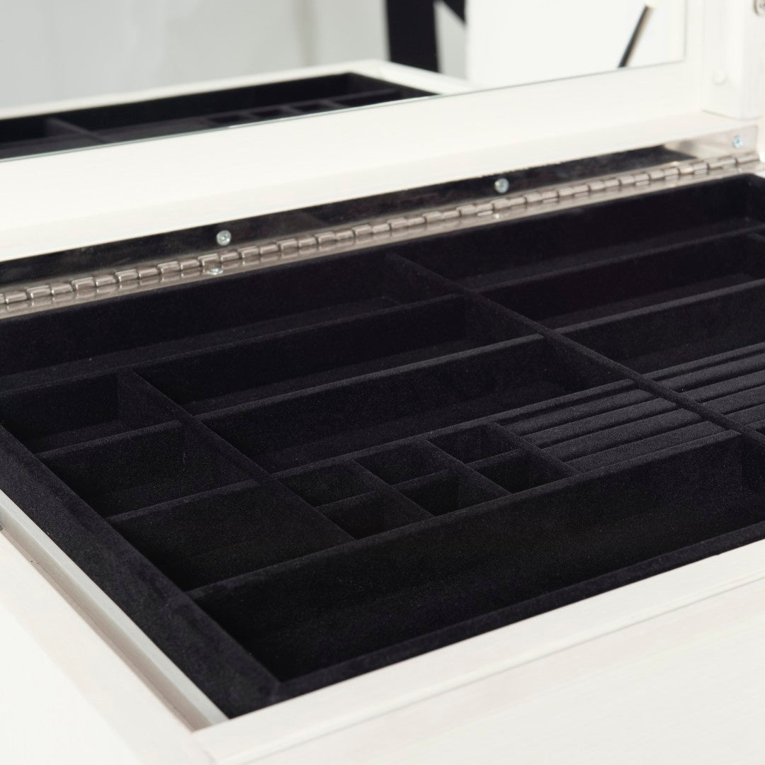 - Lift-up mirrored lid reveals a black felt-lined jewelry tray