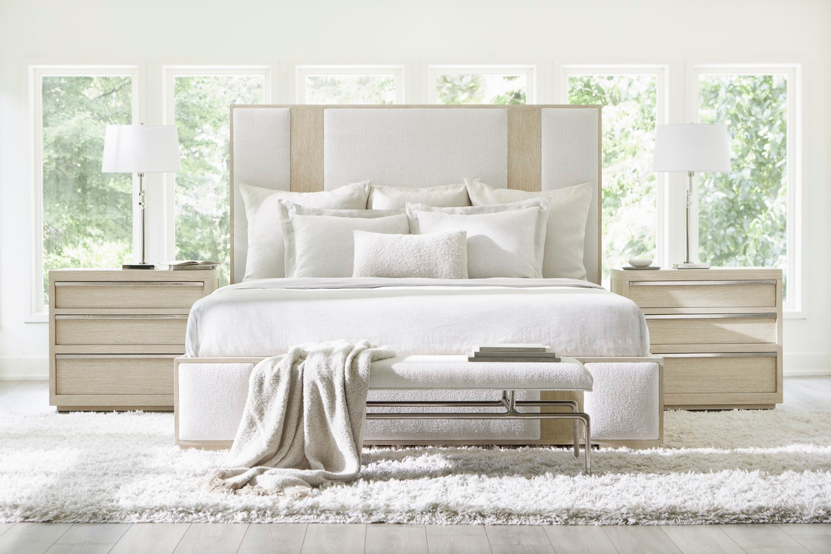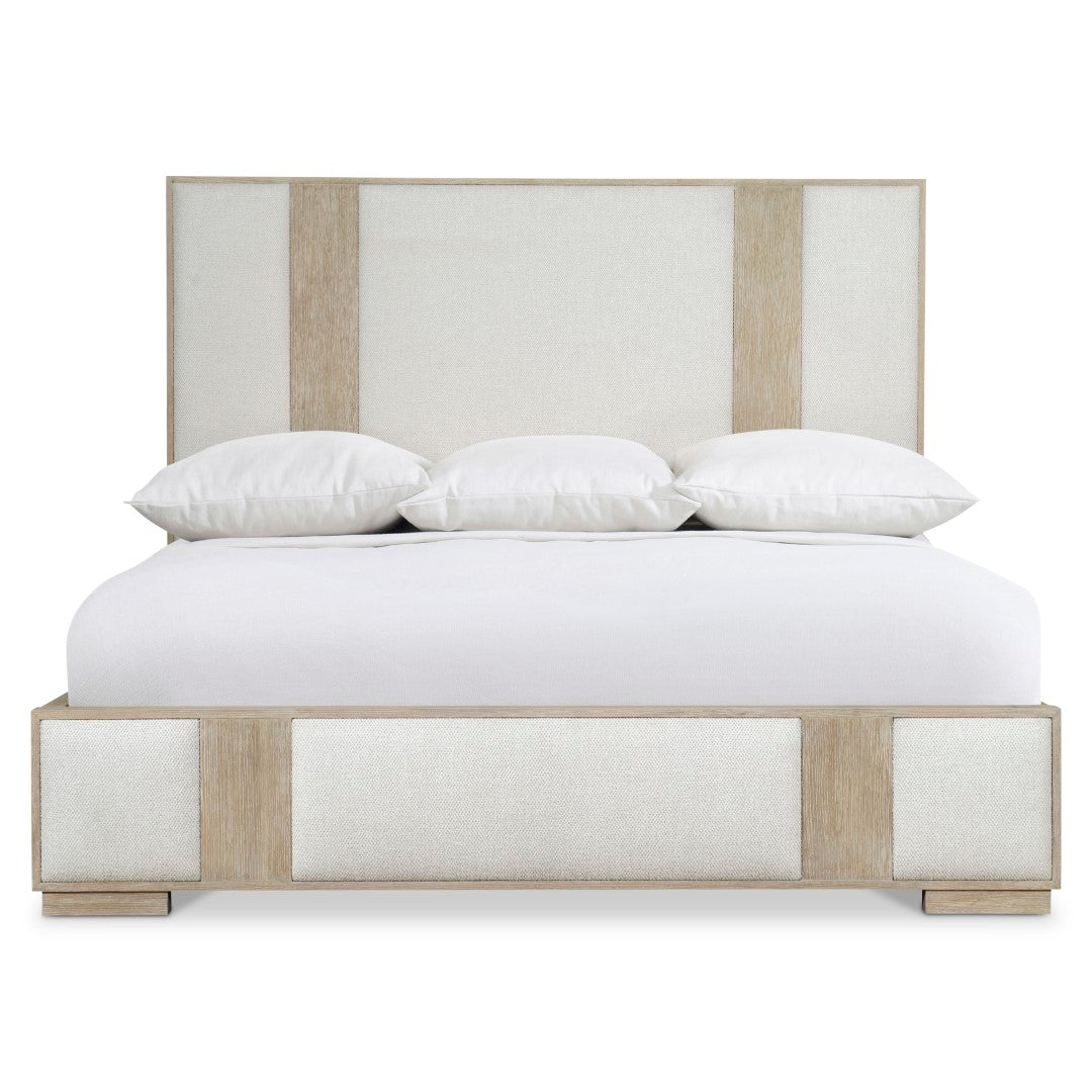 - Wood-framed headboard with two wood vertical panels in Dune finish and three inset upholstered panels in B581 fabric