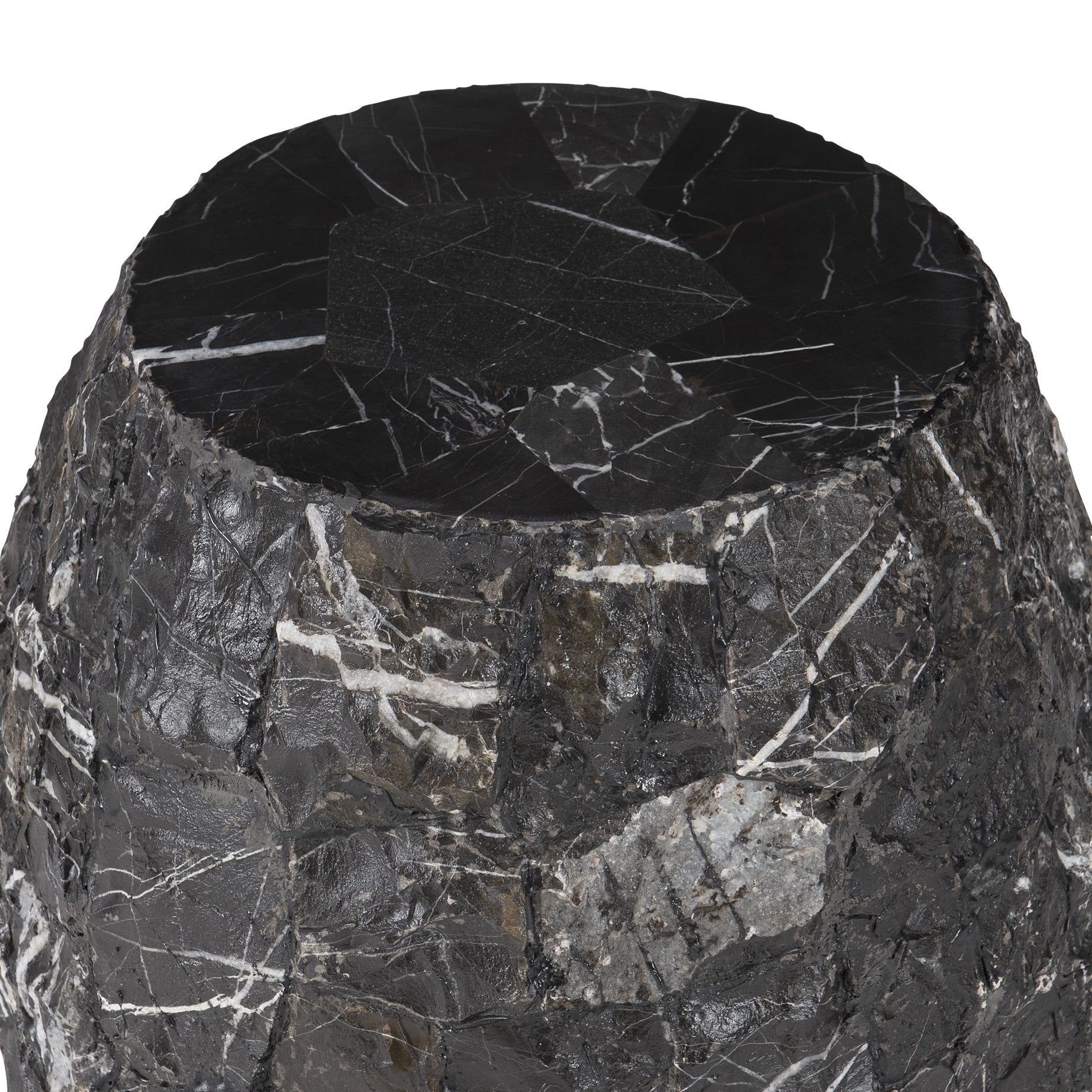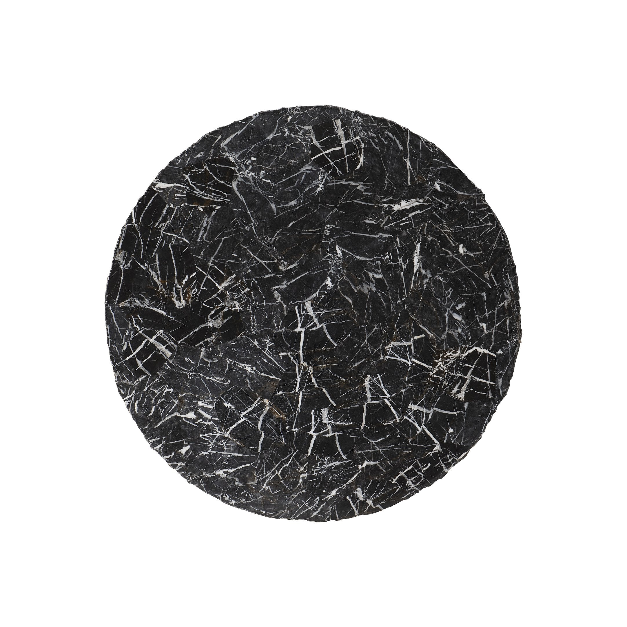 - Round table with smooth top and rough sides.