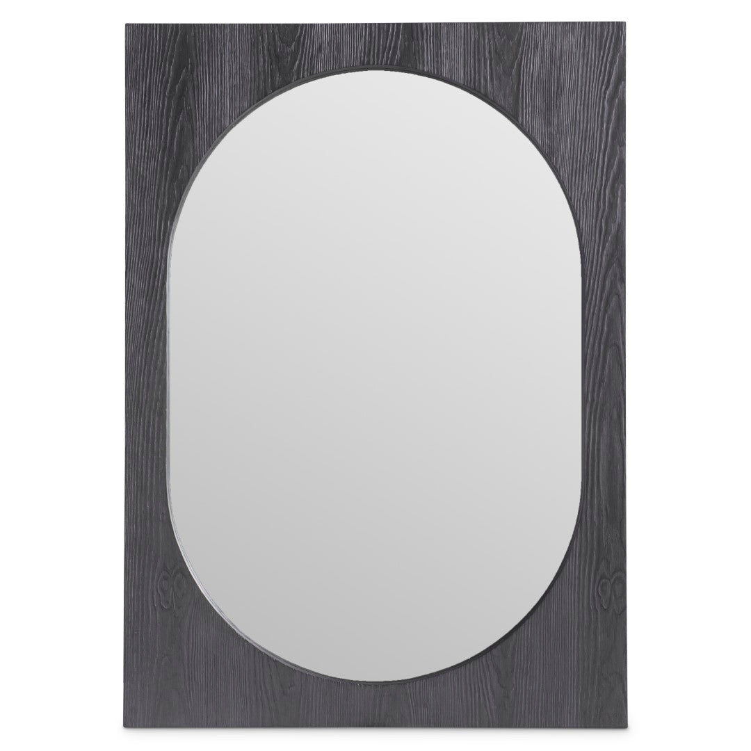 - Rectangular mirror with pine frame in L'Ombre finish and non-beveled mirrored glass in a racetrack shape.