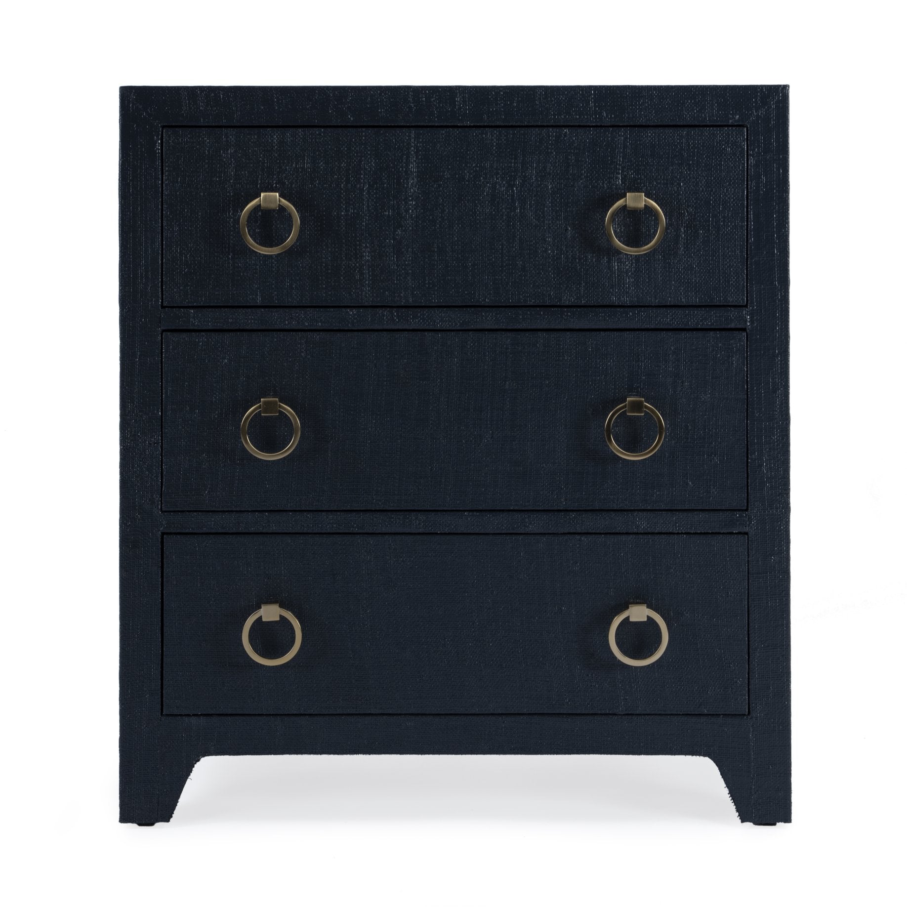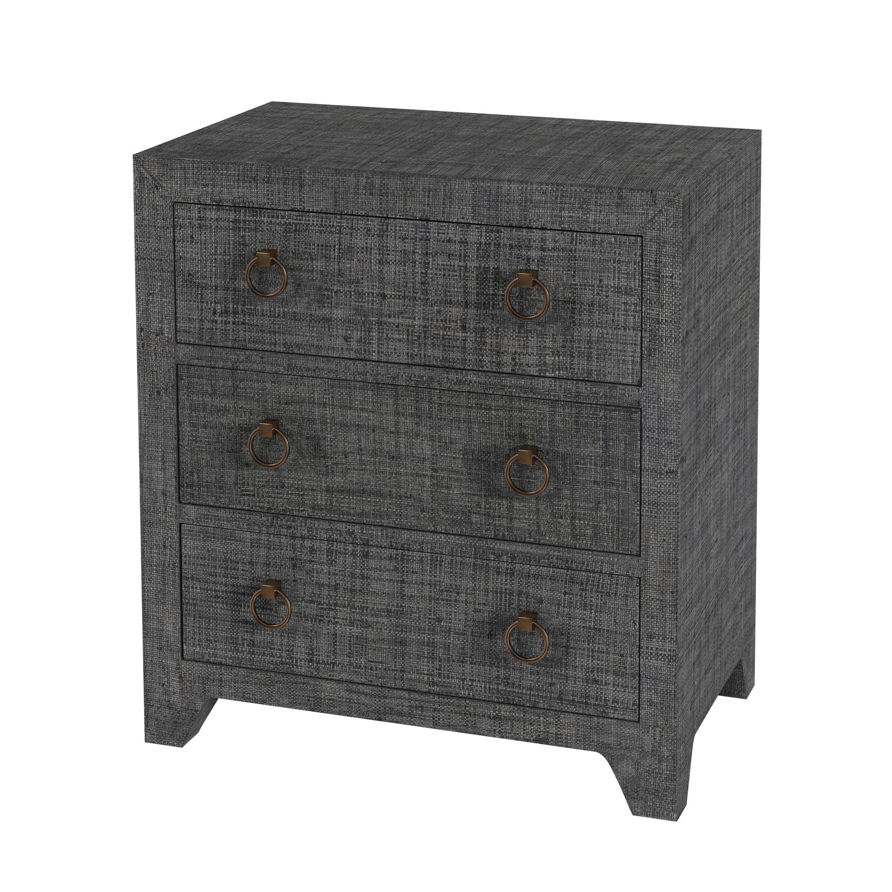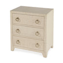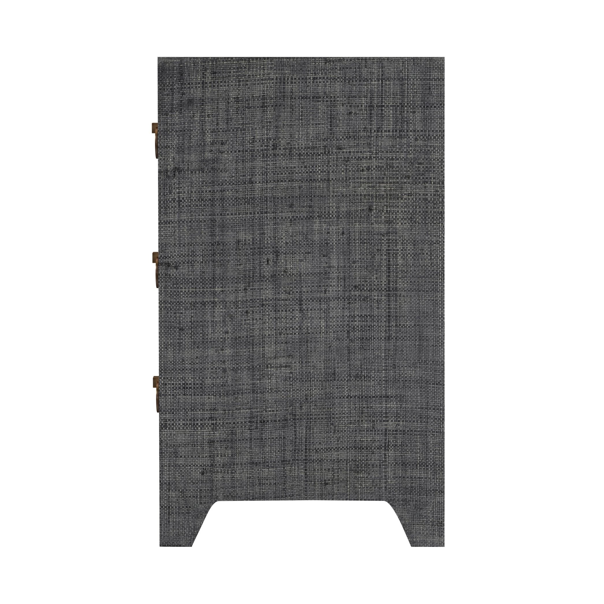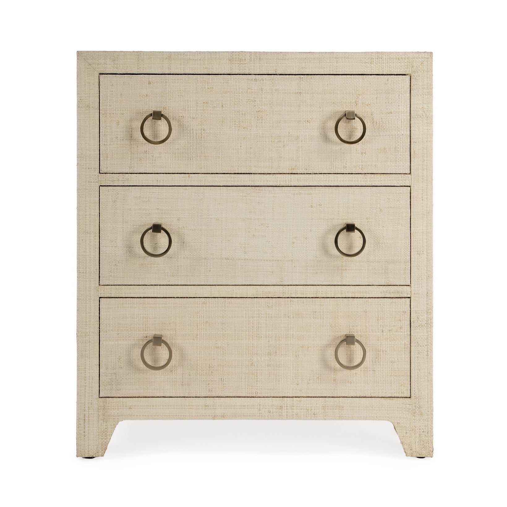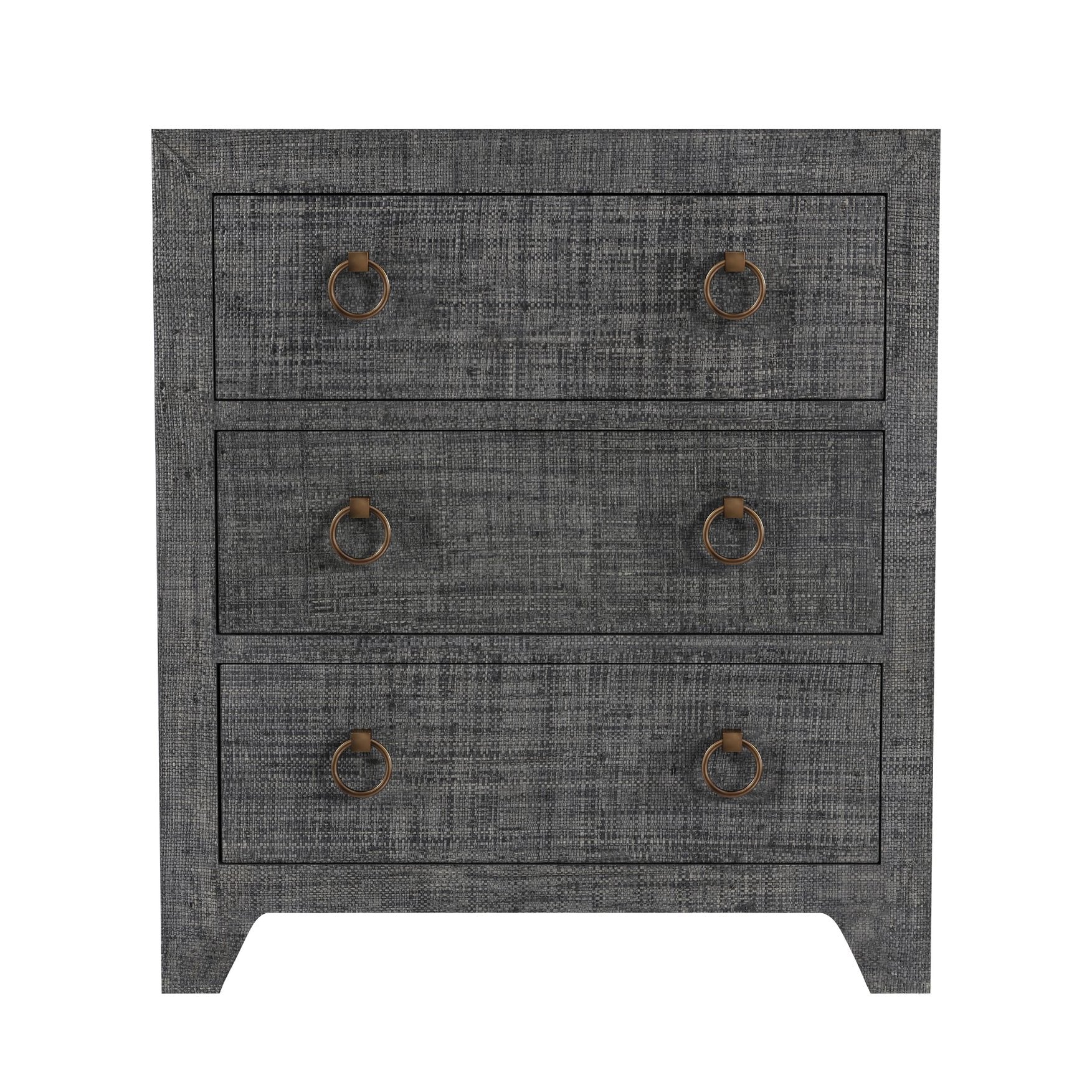 - Features 3 spacious drawers wrapped in raffia and 2 gorgeous ring pulls on each drawer. Features metal glides, safety stop and full extension. Raffia, like all natural materials, features inherent disparities in color and weave pattern. Variations in shade and markings are normal and can be expected with the natural and hand-woven materials used in the construction of this product. Avoid direct sunlight and high humidity or moisture areas. Trim any loose fibers with scissors.