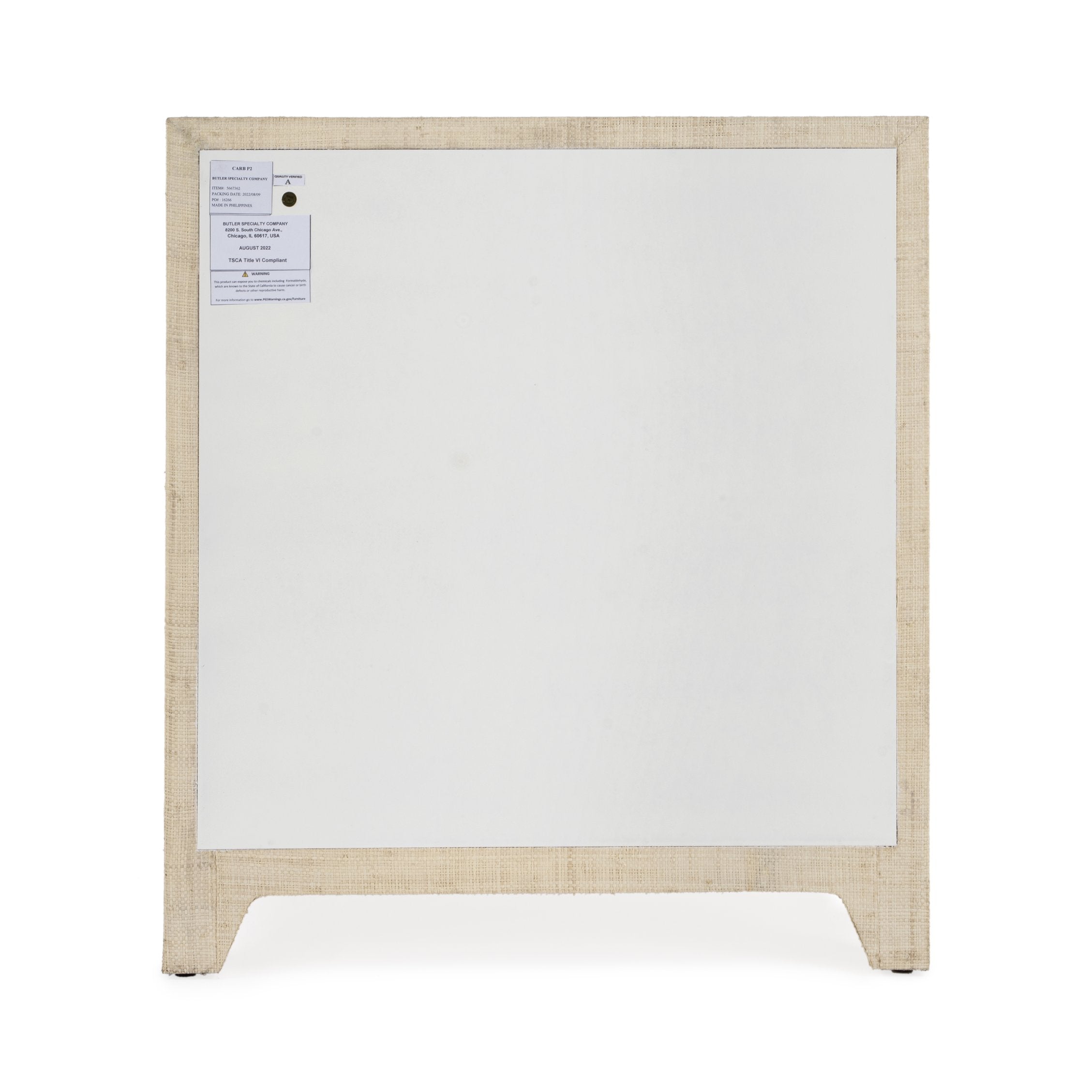- Product Features (Construction Details): Crafted from a Gmelina Solid frame with oak veneer drawer flooring and engineered wood back panels. All exposed panels are then hand-wrapped in Saguran Raffia and finished in a clear lacquer for protection and durability.