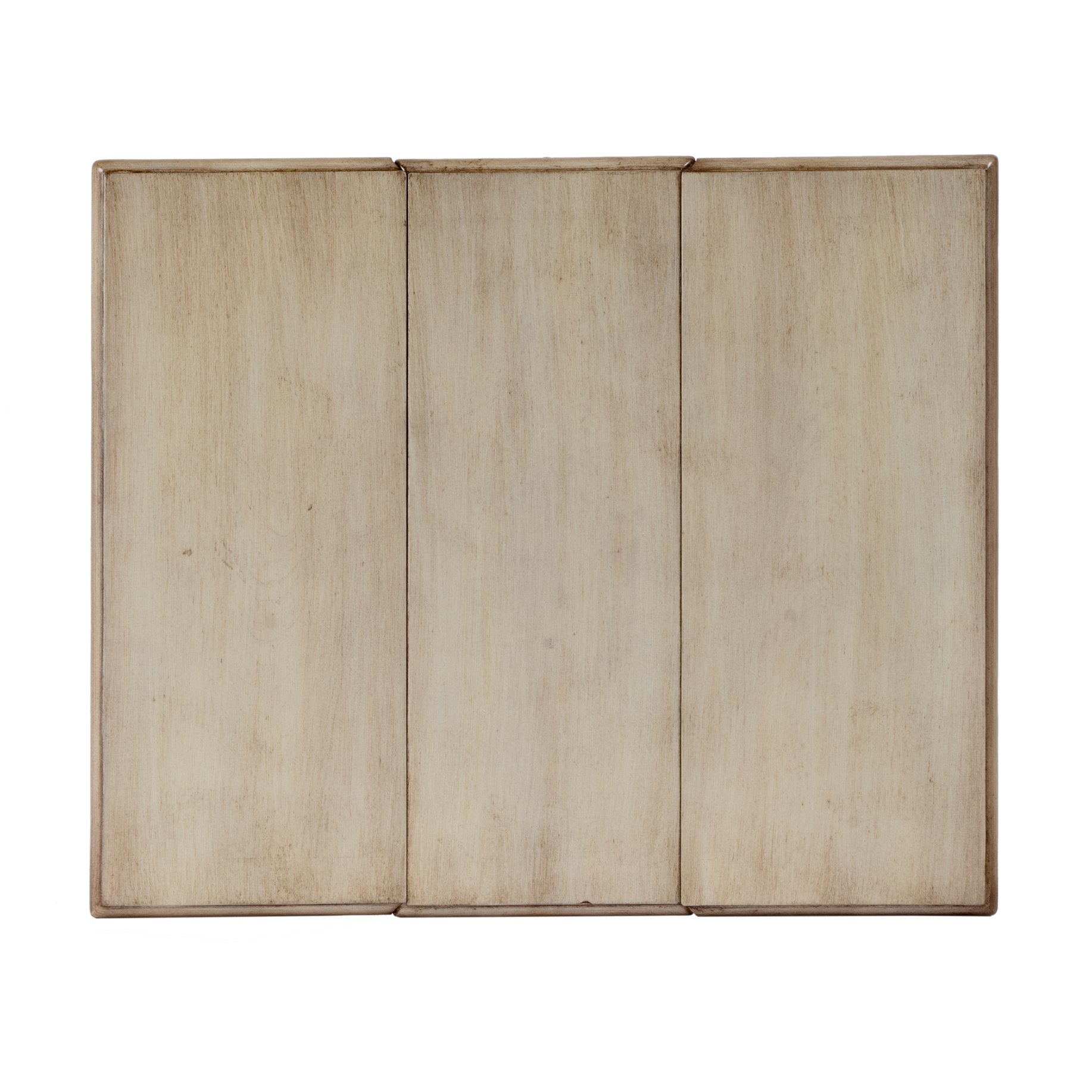 - Product Features (Construction Details): Construction details include a veneer Inlay top with a cross-grain border over engineered wood and a solid rubberwood frame with mortise and tenon joinery. Has some paint/coat finish distressing, natural wood variation, and a clear lacquer finish for protection.