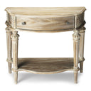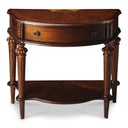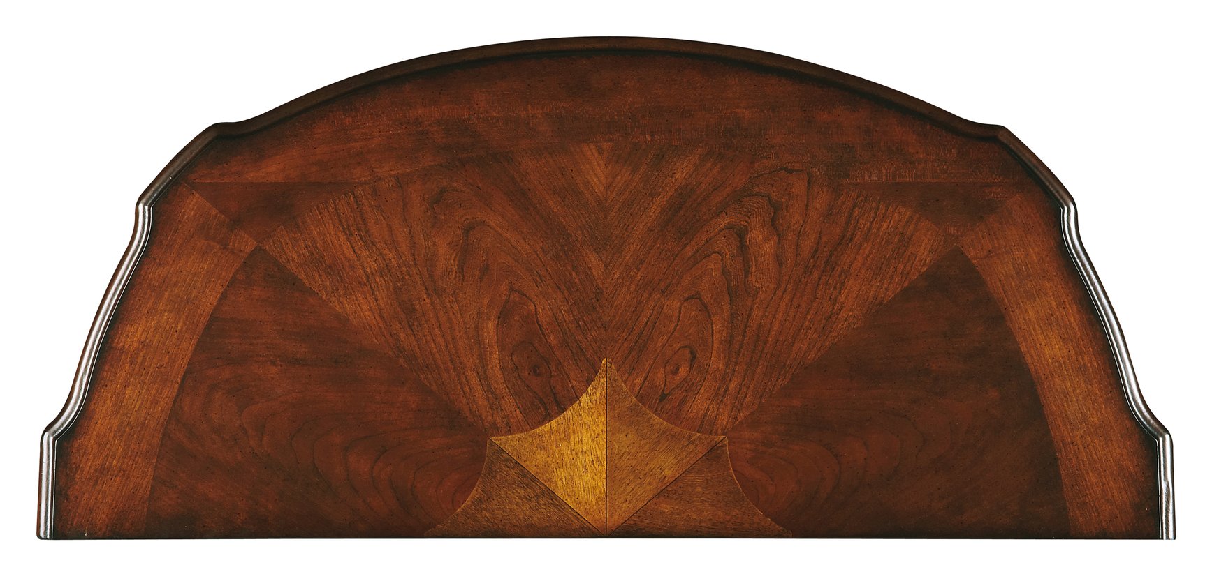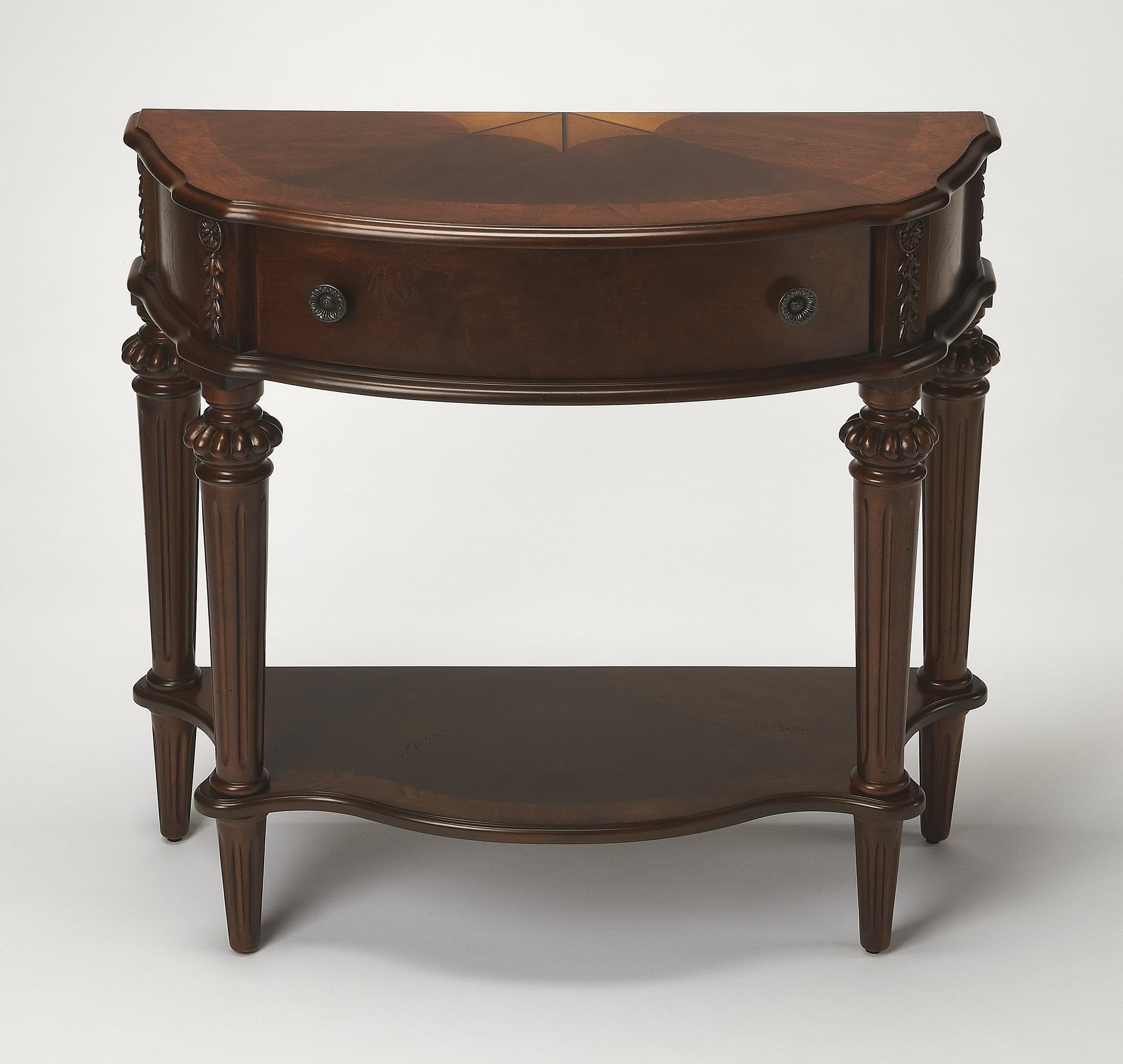 - The console table top and bottom shelf both have a matched veneer tops with half linenfold emblem and shelf dimensions are 34"W 13.5"D x 18.25"H