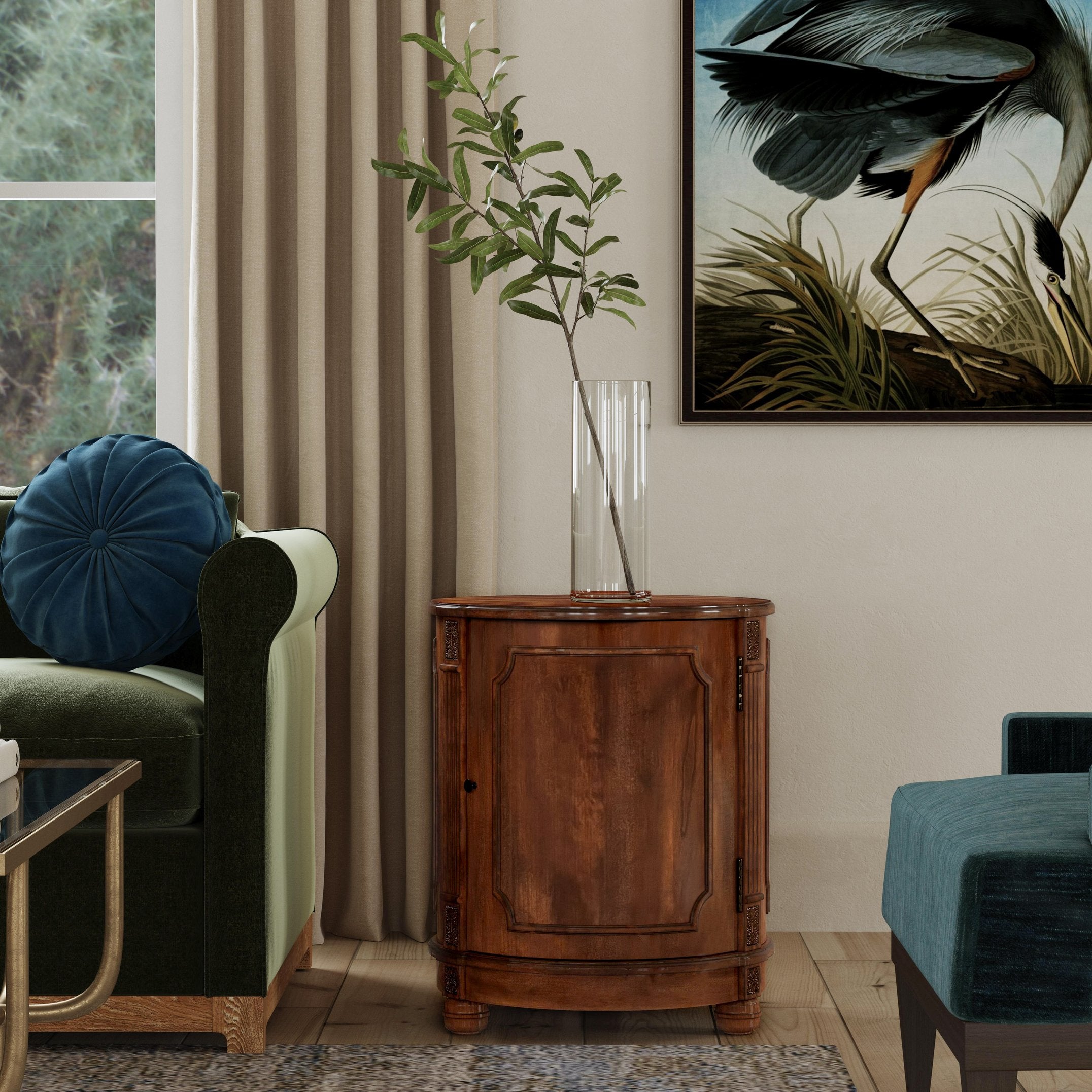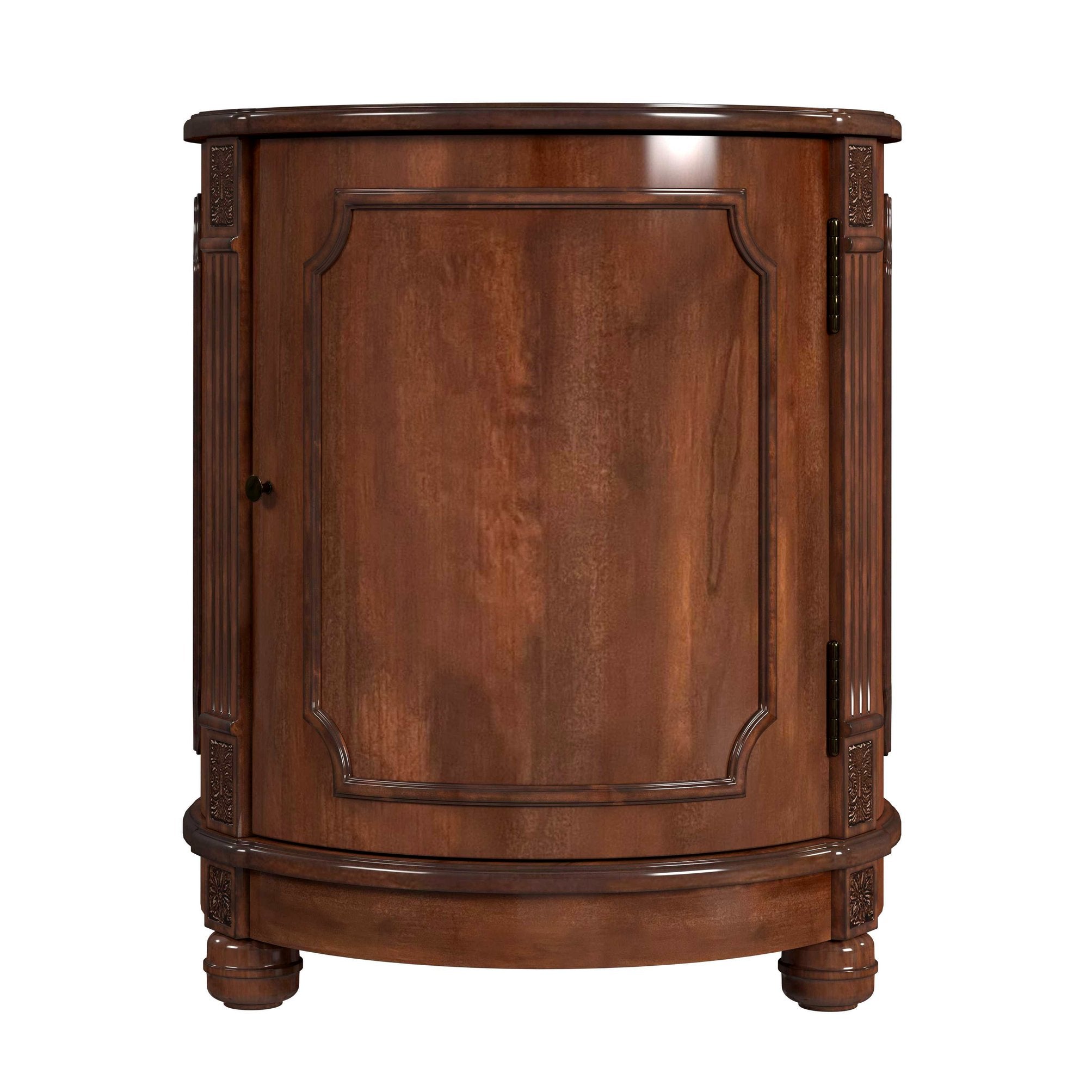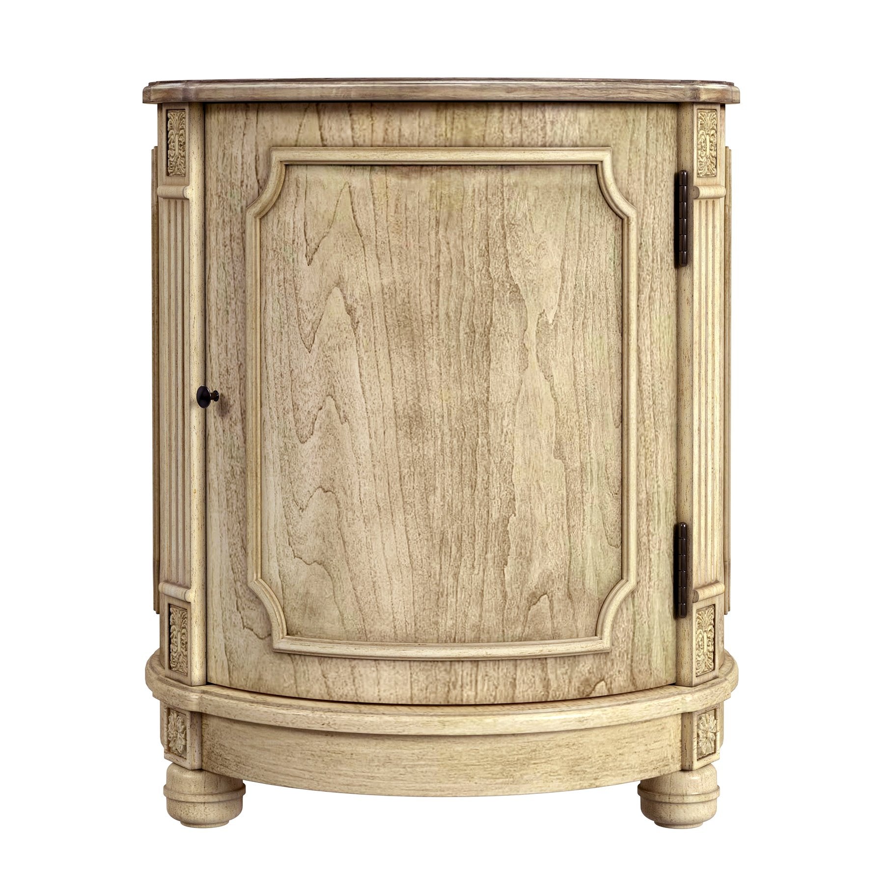 - Product Features (Construction Details): Construction Details: Veneer top and door front for a smooth and consistent color tone. Sits atop an engineered wood substrate for strength and structural longevity. The frame is solid poplar and features mortise and tenon joinery and applique detailing made of resin. Intentional distressing of the finish for an antique look.