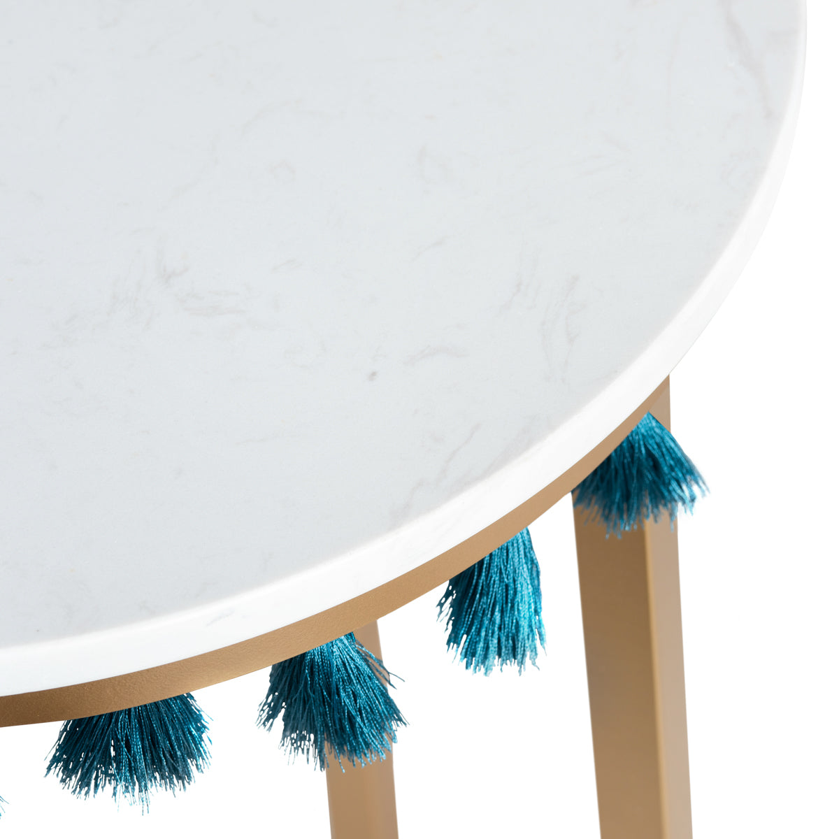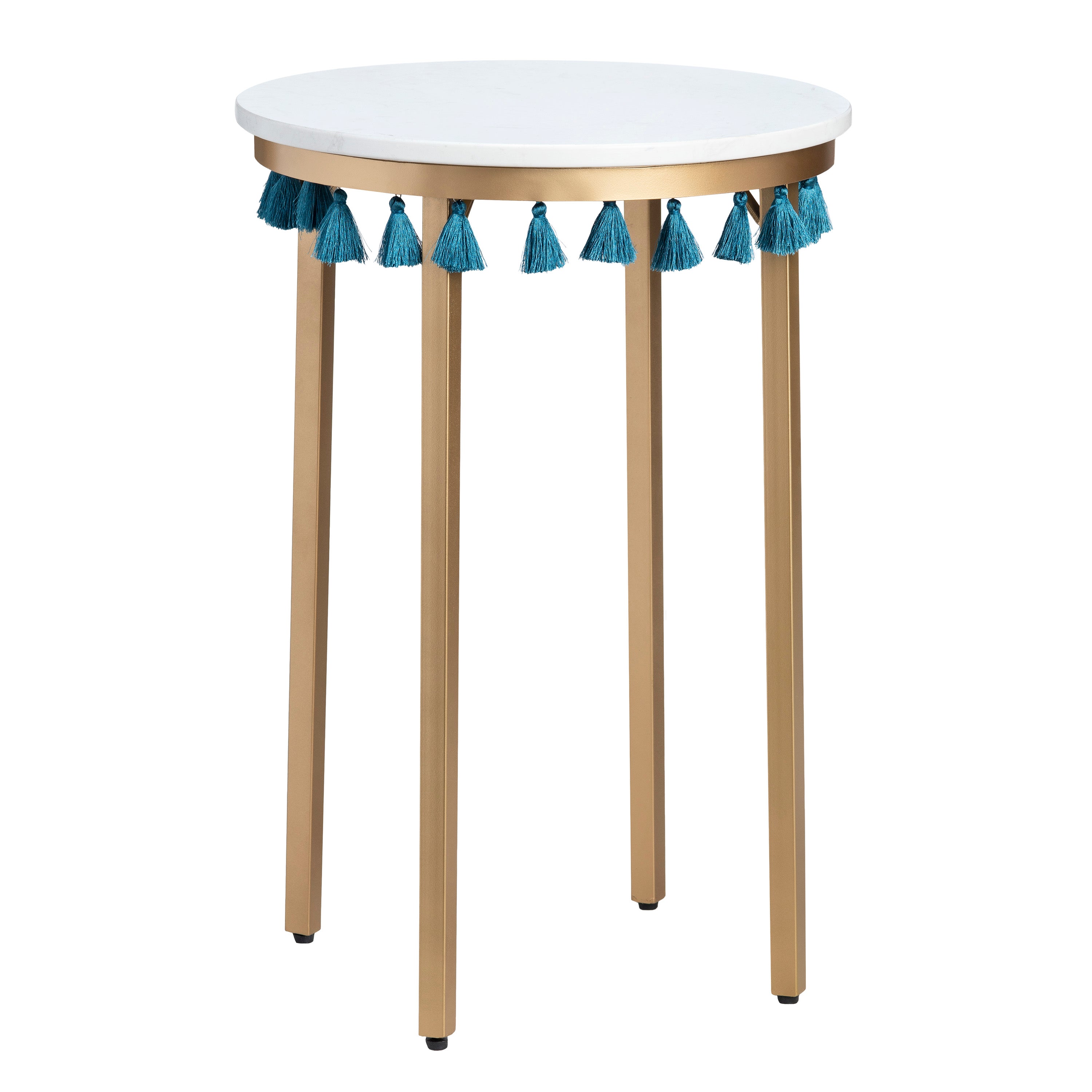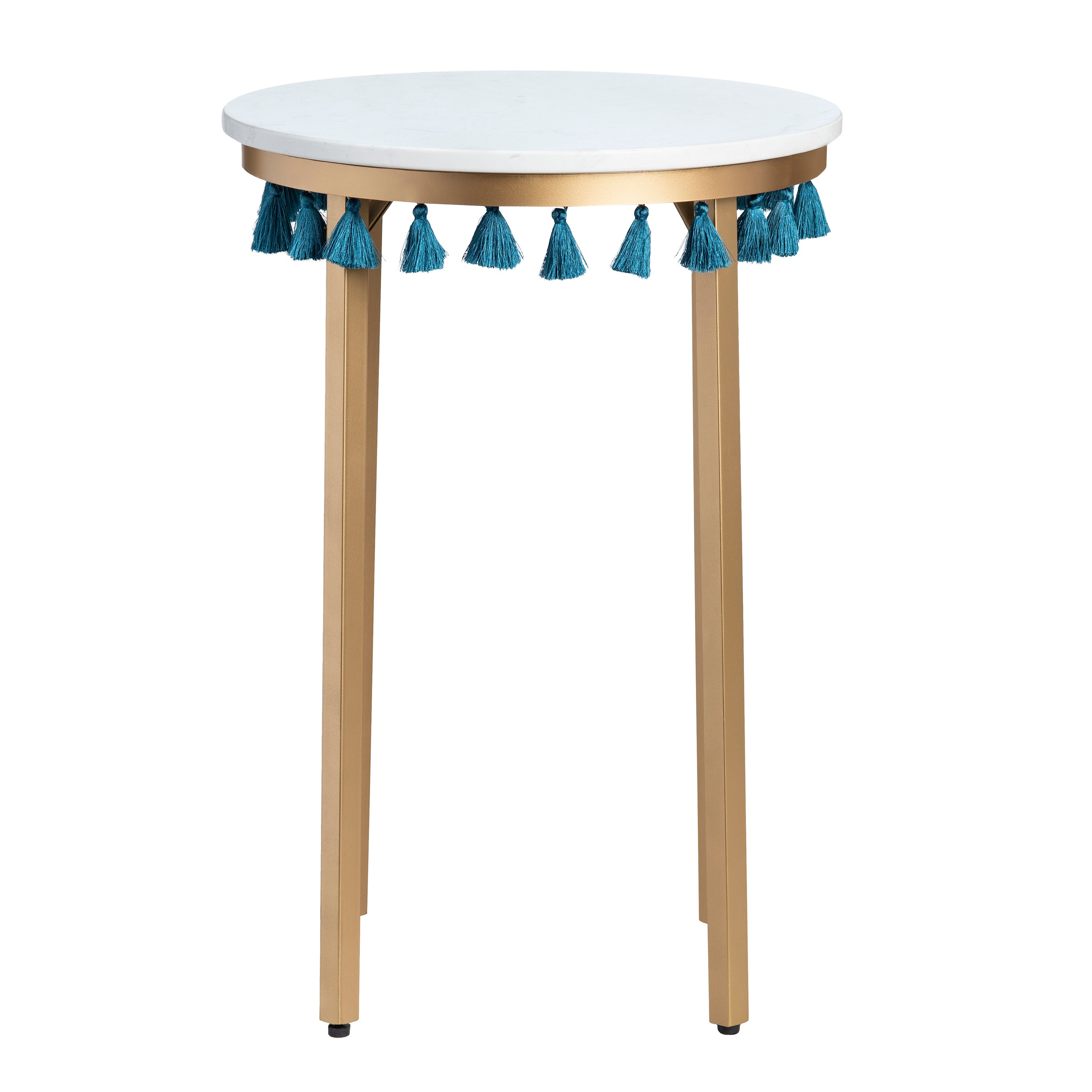 - Color: EVFZR3303BL Saffron Round Marble Accent Table w/ Teal Blue Tassels - White with Blue Tassels