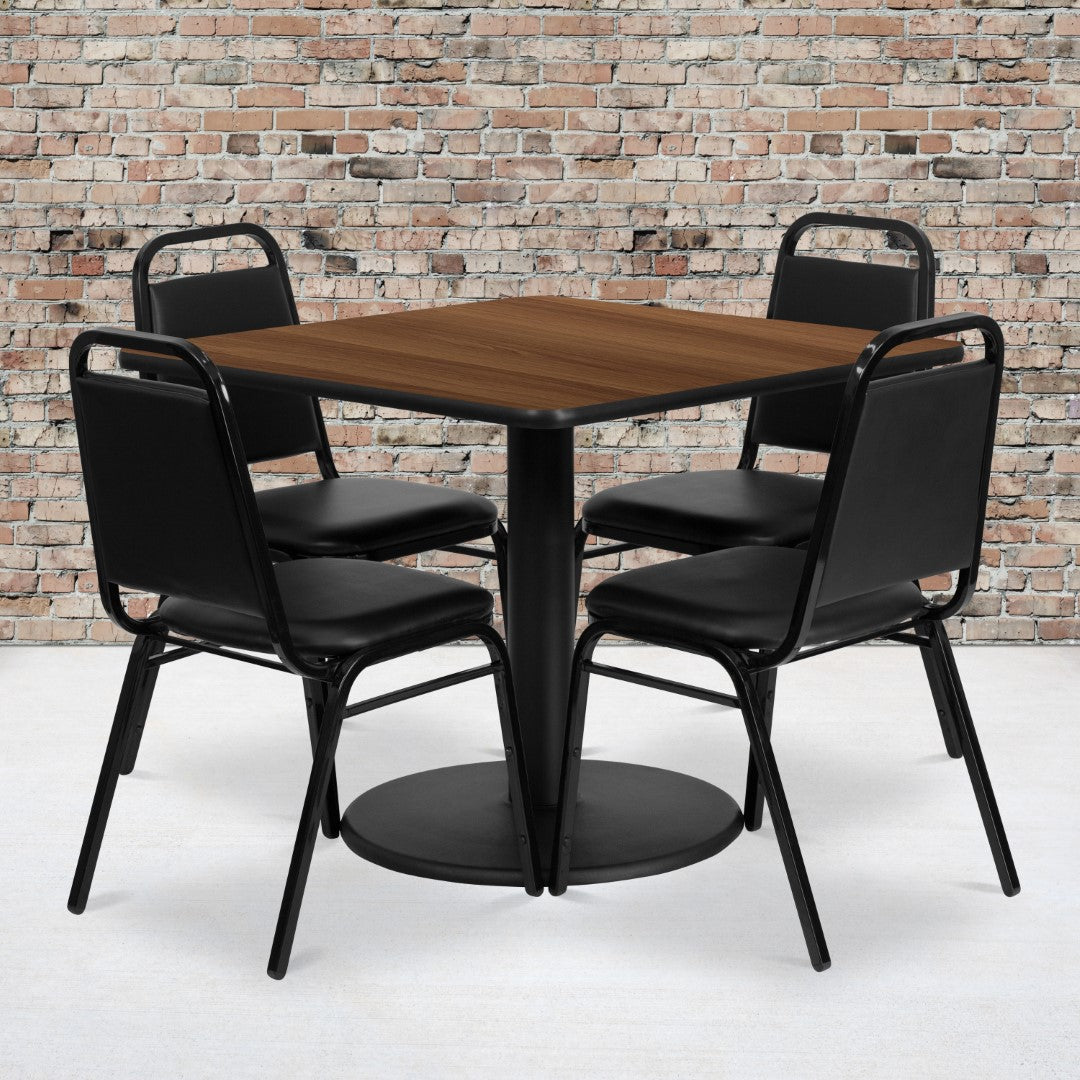 - Set Includes 4 Banquet Chairs, Square Table Top, and Round Base