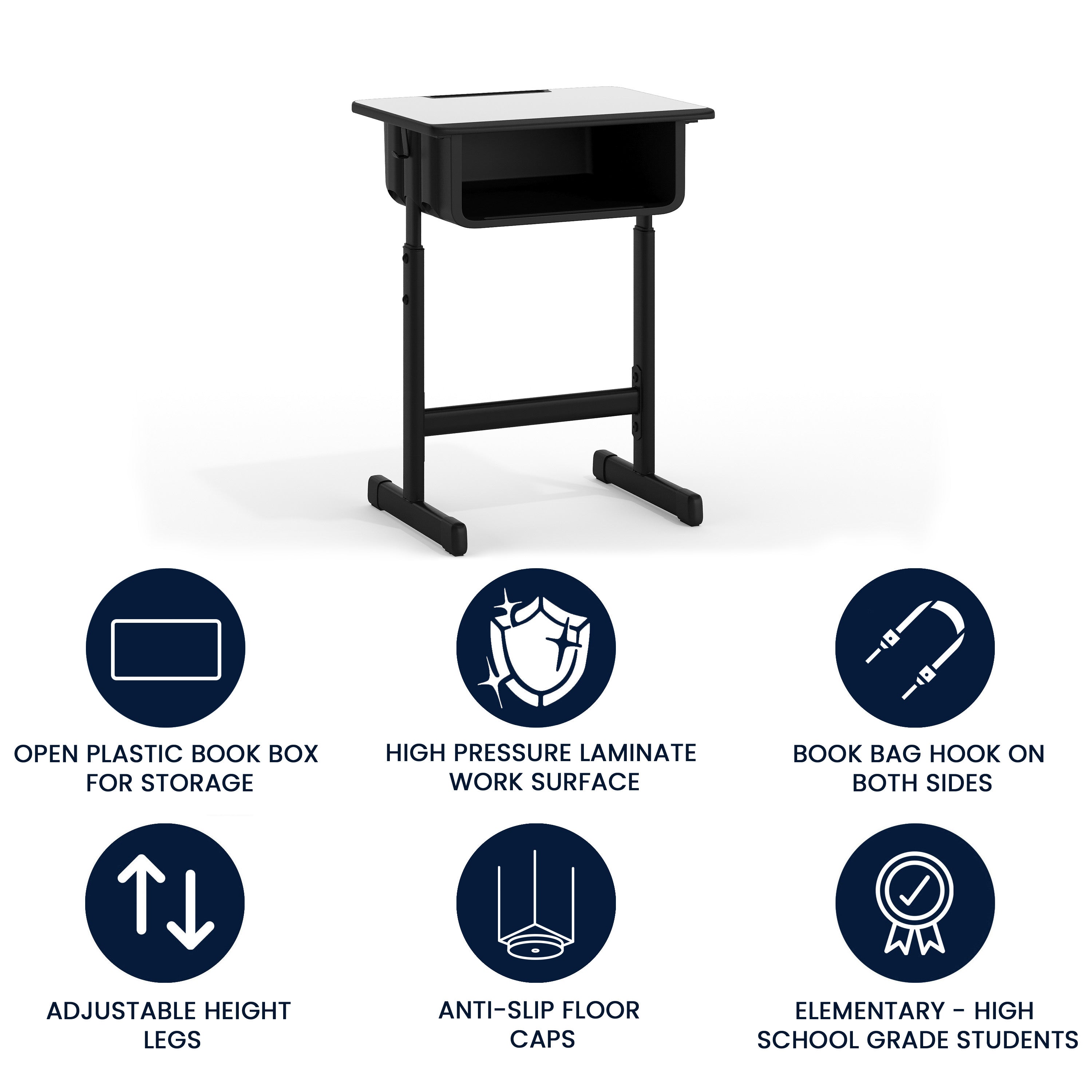 - Convenient Book Bag Hooks on both sides of the desk for easy storage
