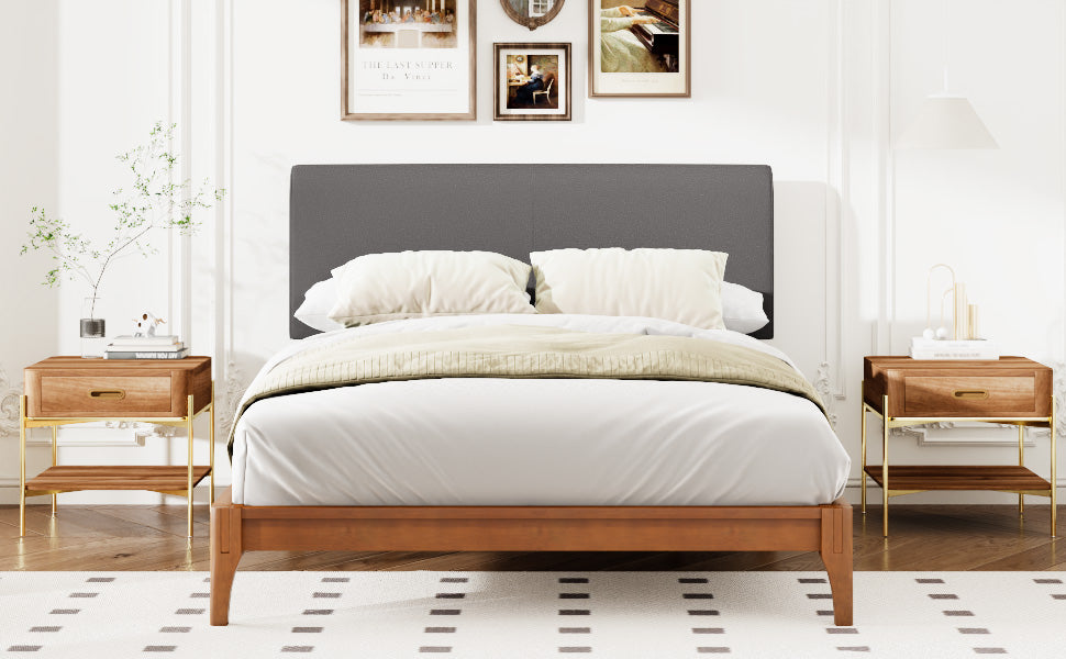 - Adjustable Upholstered Headboard: Gray curved linen-like fabric headboard with three height settings to customize comfort and visual proportion.