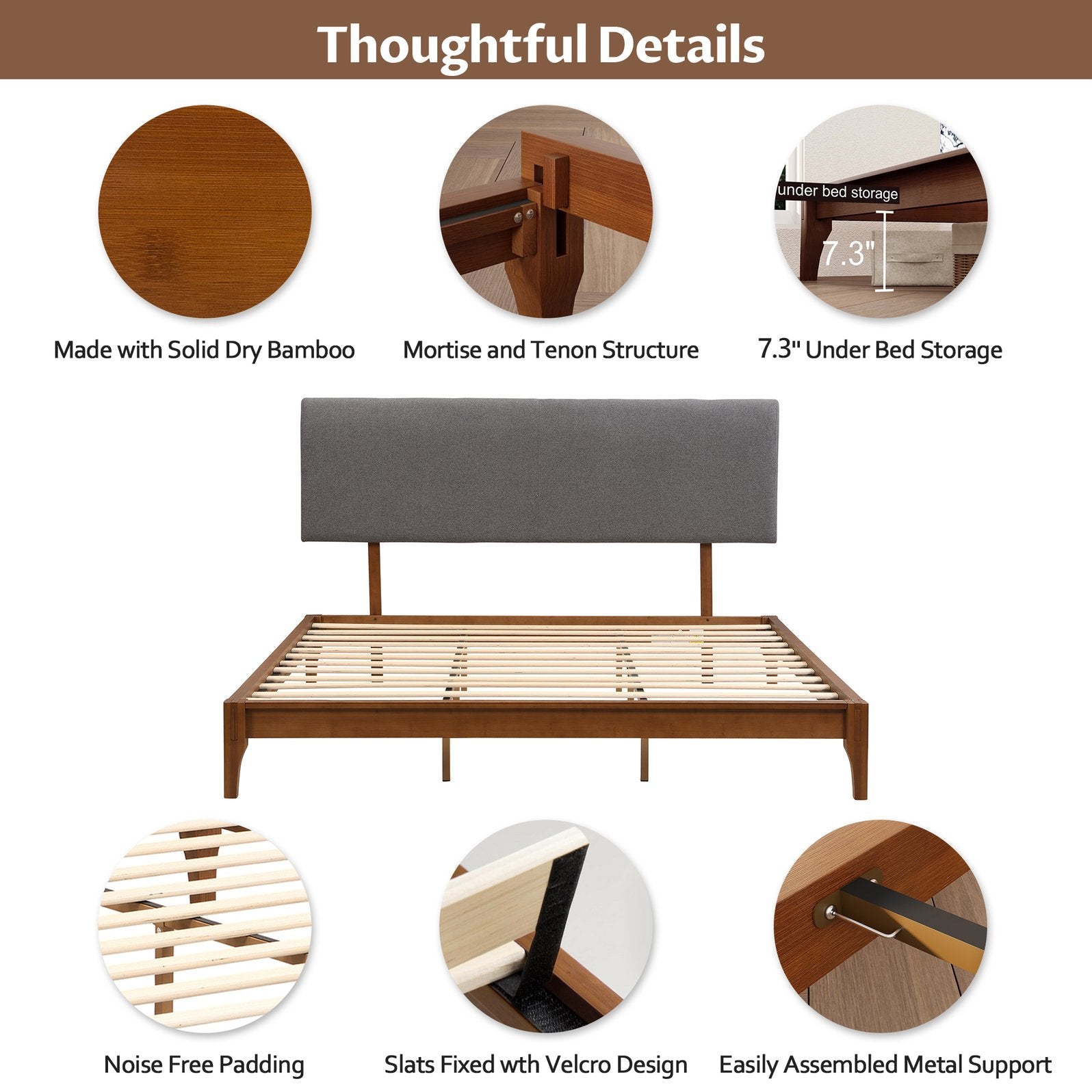 Upgrade your bedroom with a thoughtfully designed platform bed that blends natural bamboo craftsmanship and modern comfort. This bed frame combines durable solid dry bamboo construction, a soft gray curved upholstered headboard with adjustable heights, and practical under-bed storage to deliver both style and everyday functionality.