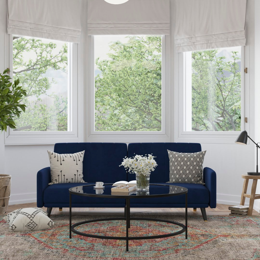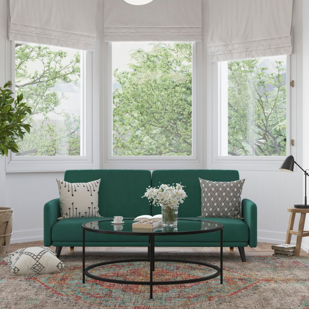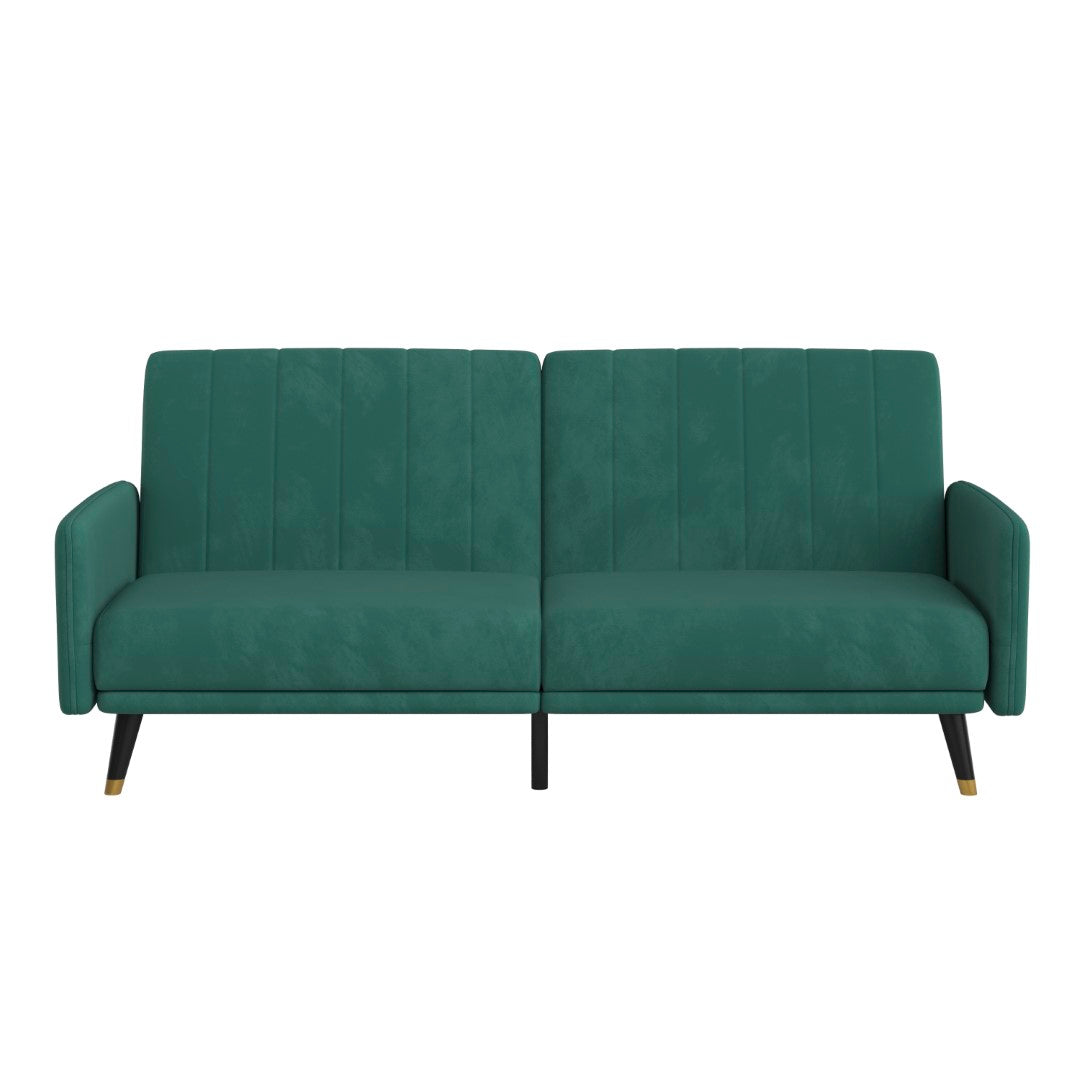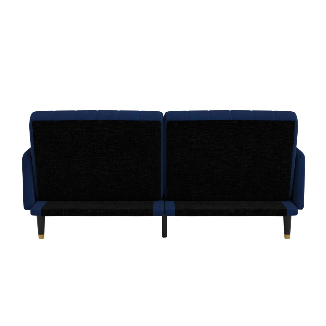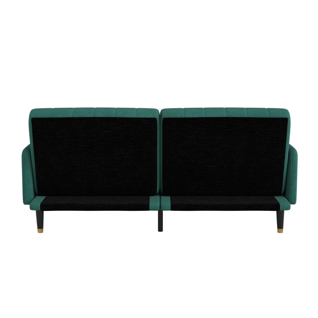 - Mid-Century Modern Split-Back Futon Sofa with Vertical Decorative Stitching