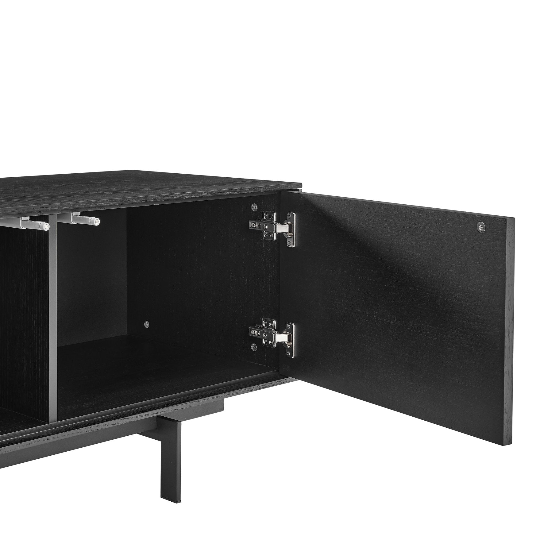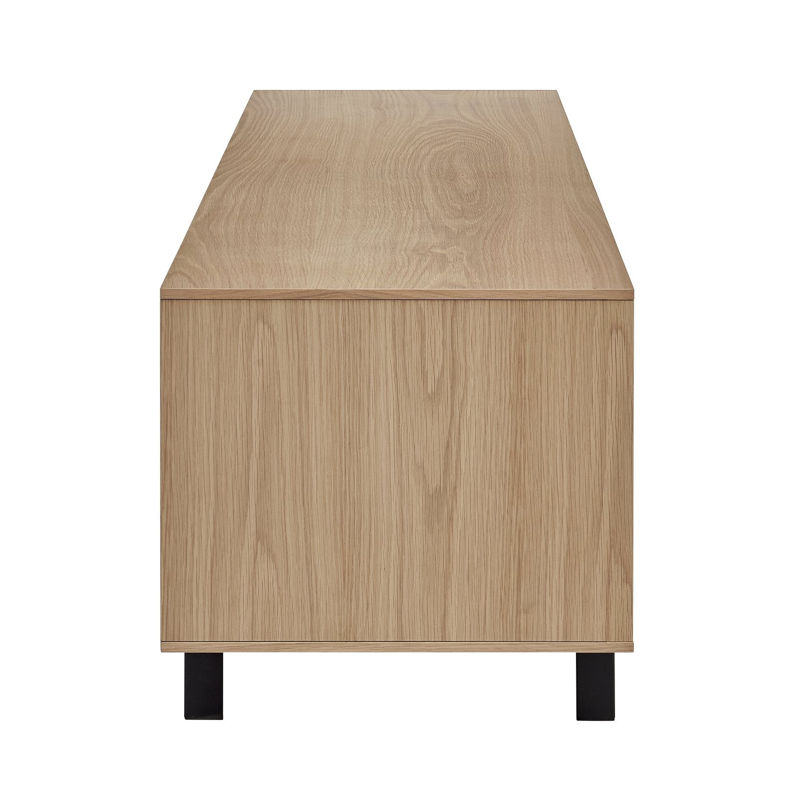 - Oak veneer Engineered wood Black powder coated steel legs Two drawers, two doors, push open FSC compliant