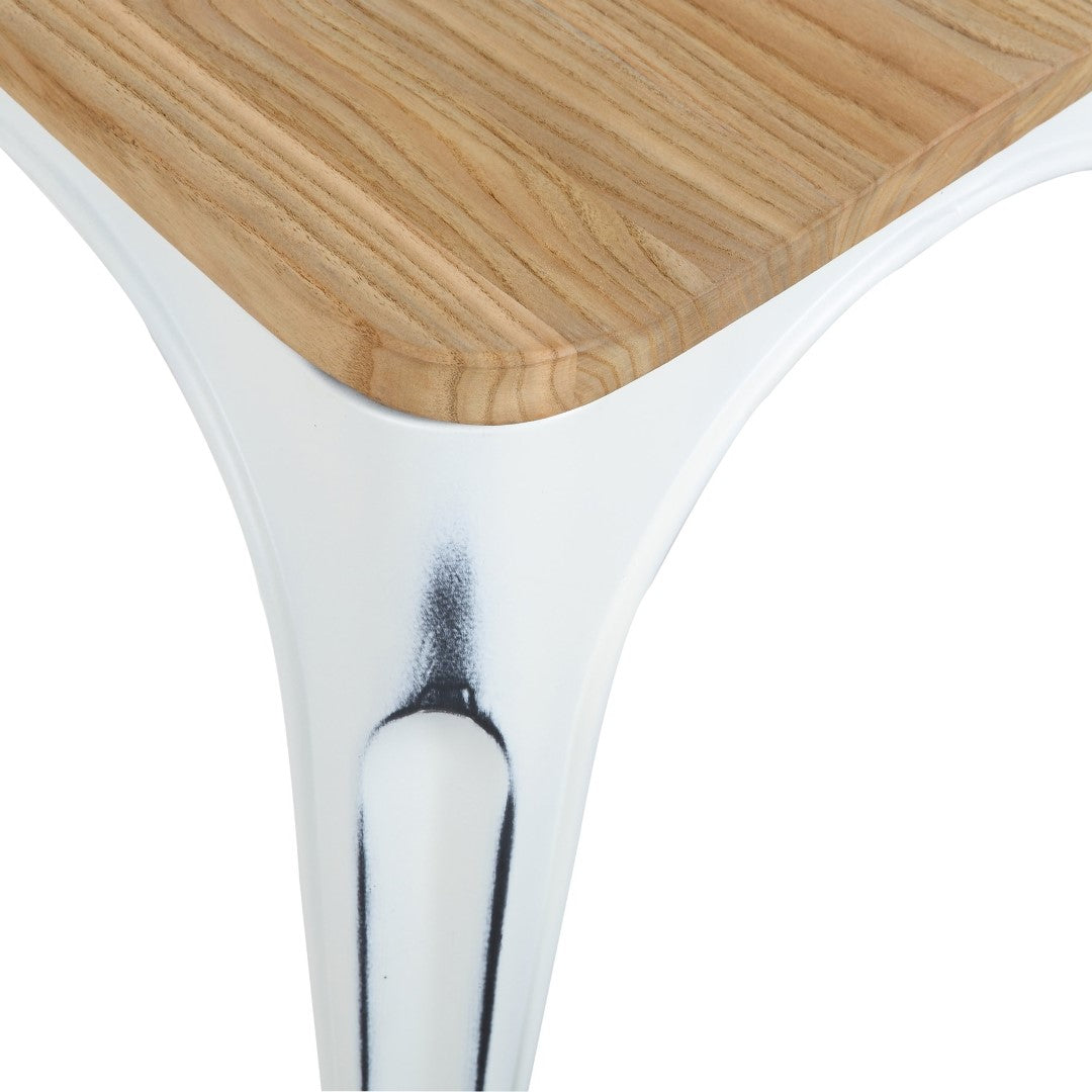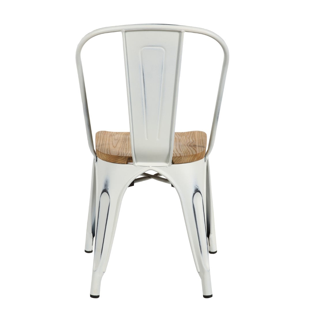 - Powder coated steel chair with stretchers under seat Carved Elm wood seat Stackable up to 14 units No assembly required Contract Grade