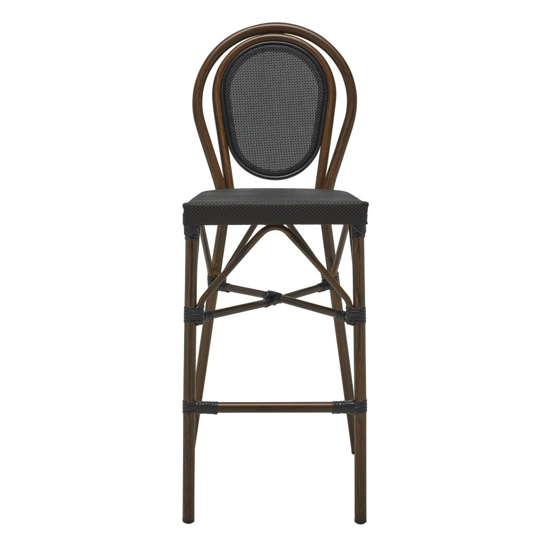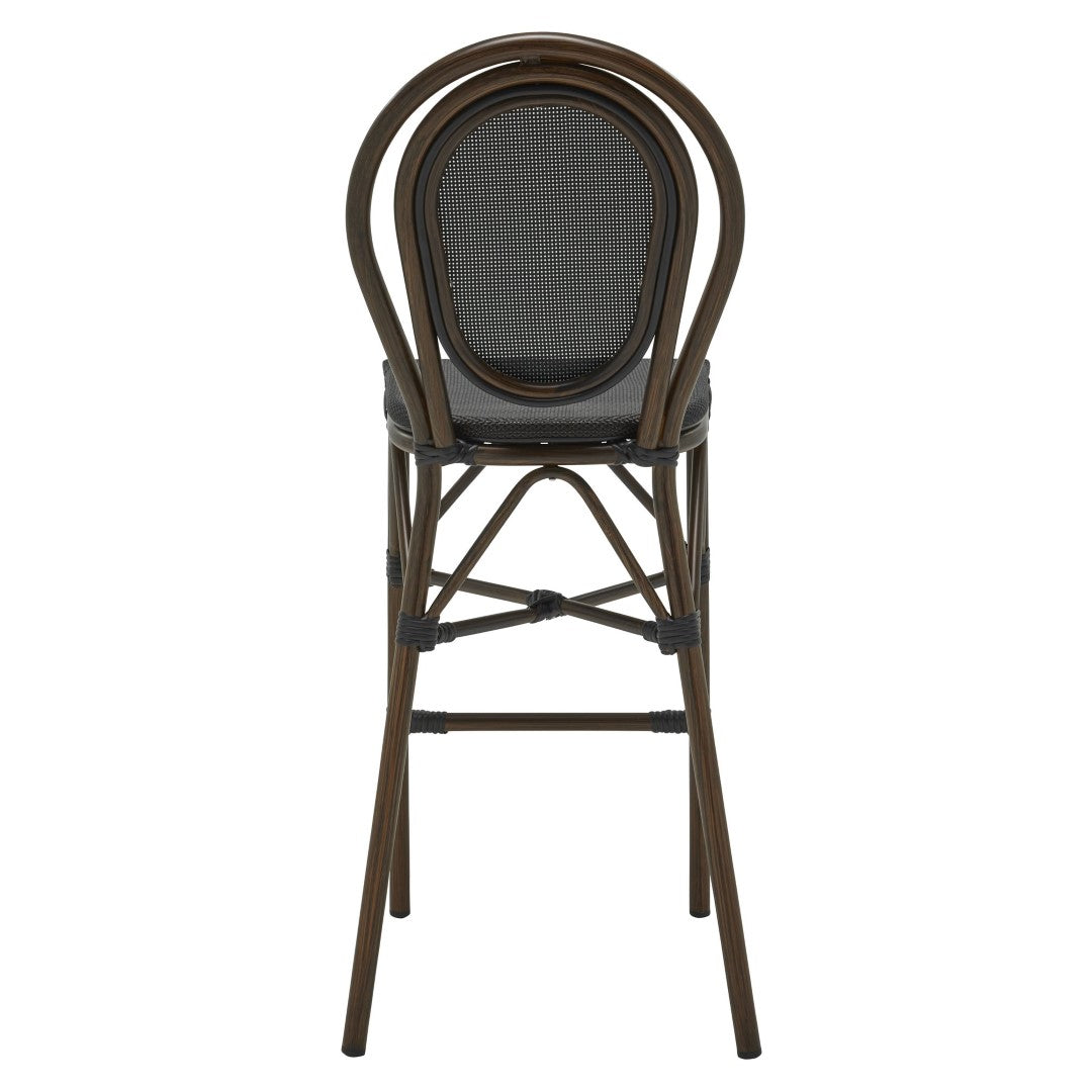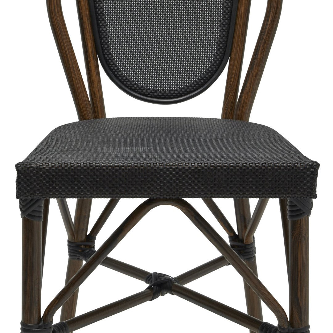 - Black textilene mesh seat and back Round brown powder coated aluminum frame Stackable up to 4 units Plastic feet No assembly required Indoor/Outdoor Contract Grade