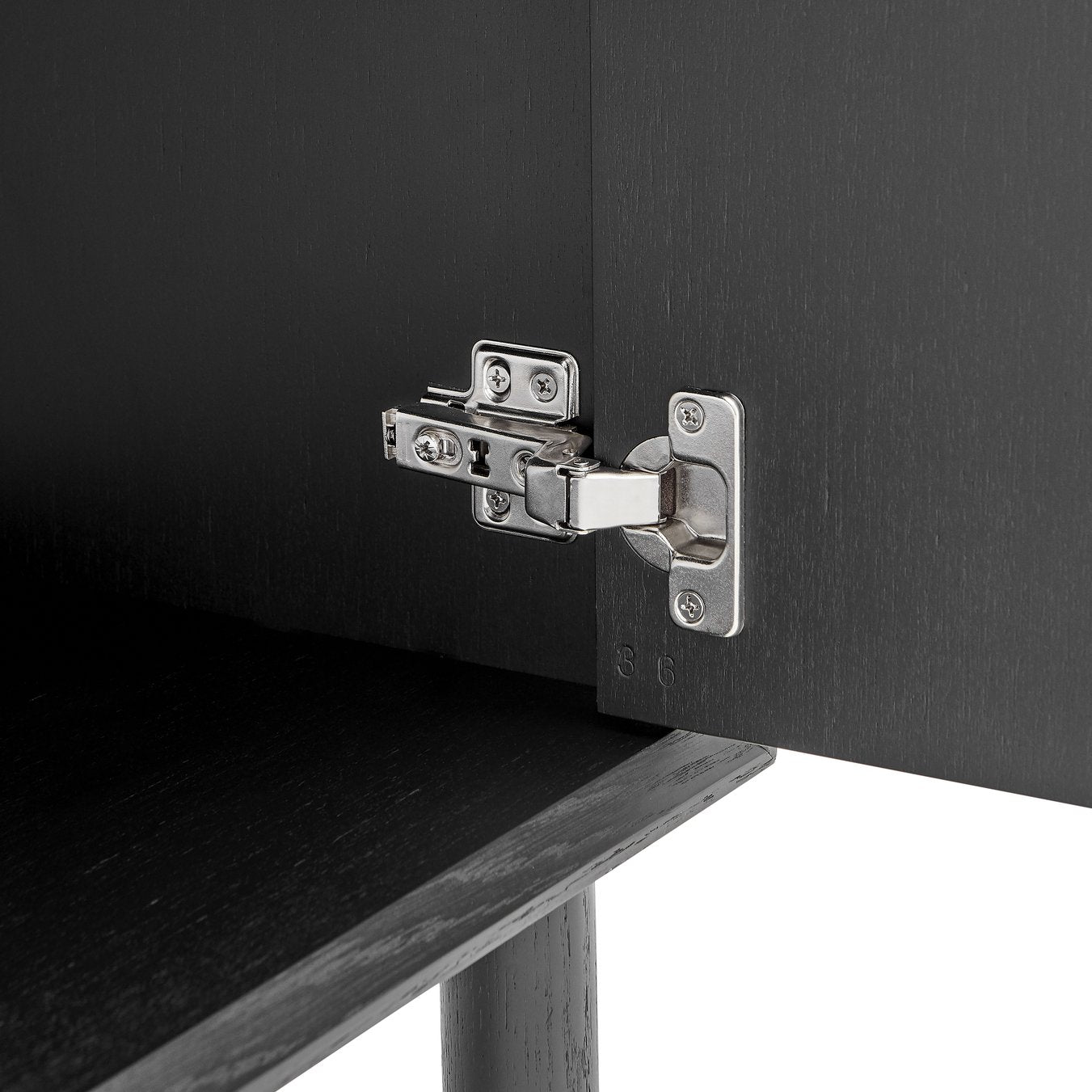 - Black stained ash veneer Engineered wood Straight peg legs Four doors Wire management Weight capacity 100 lbs. FSC compliant Contract Grade